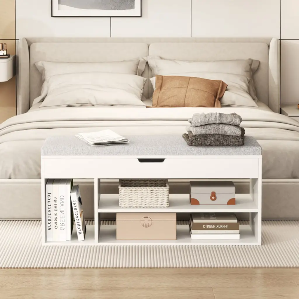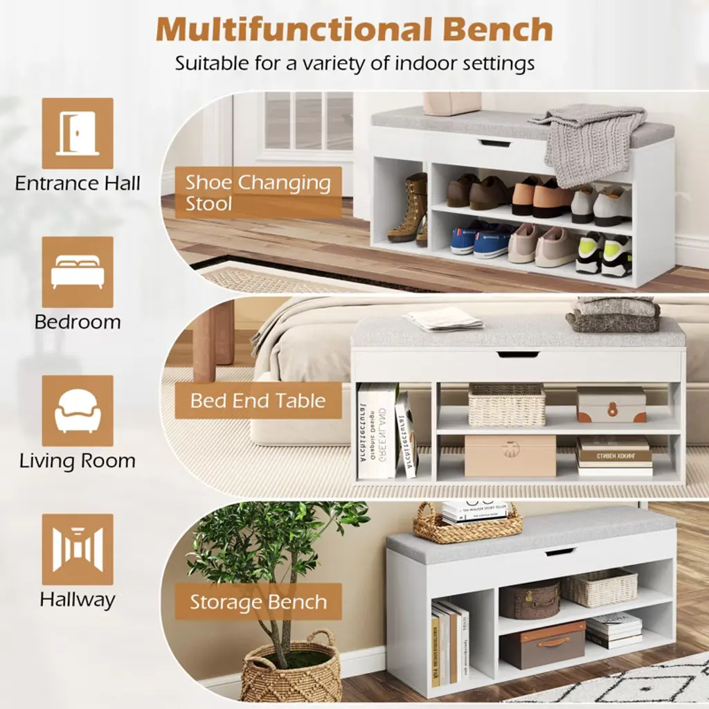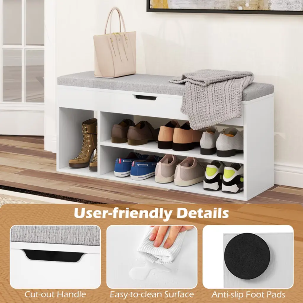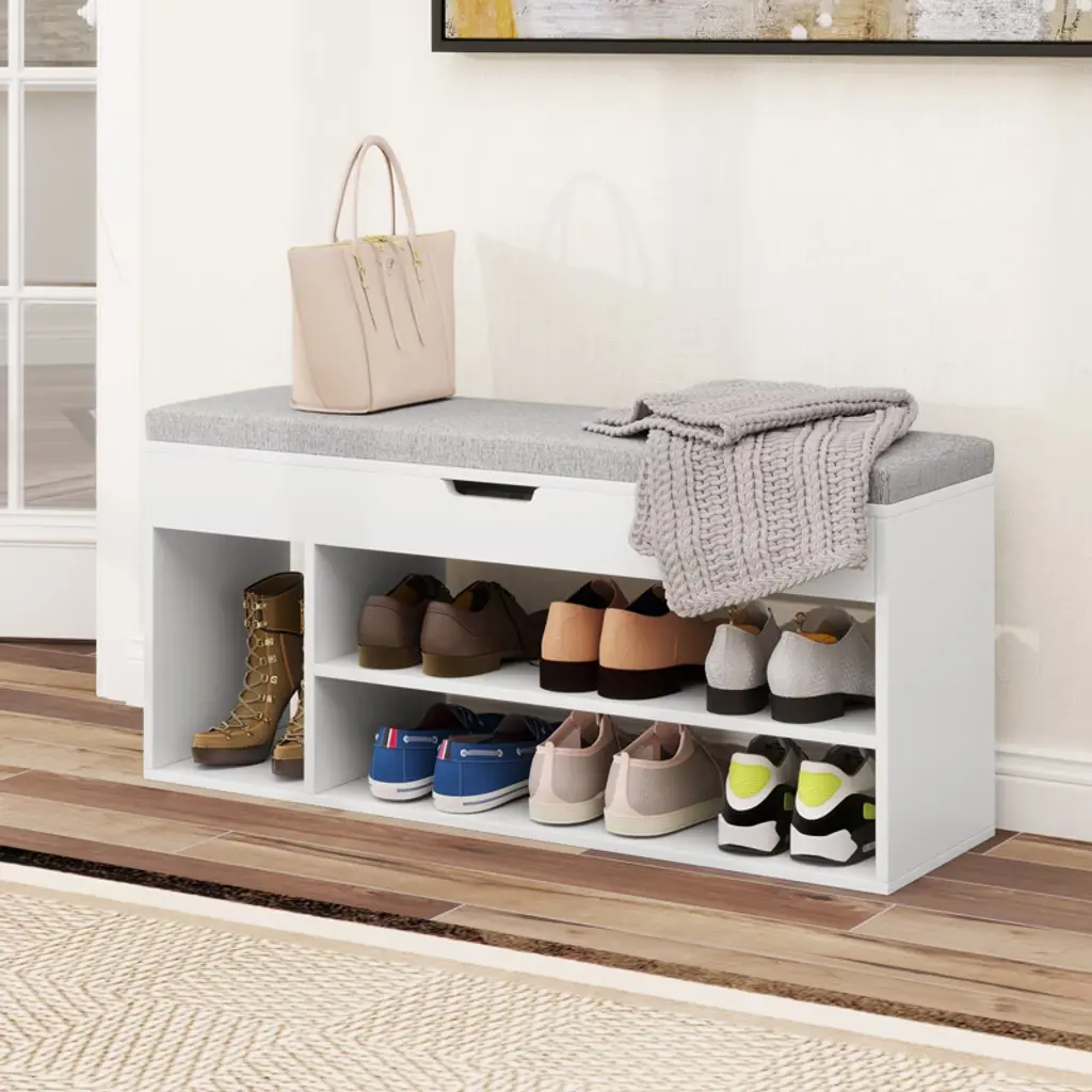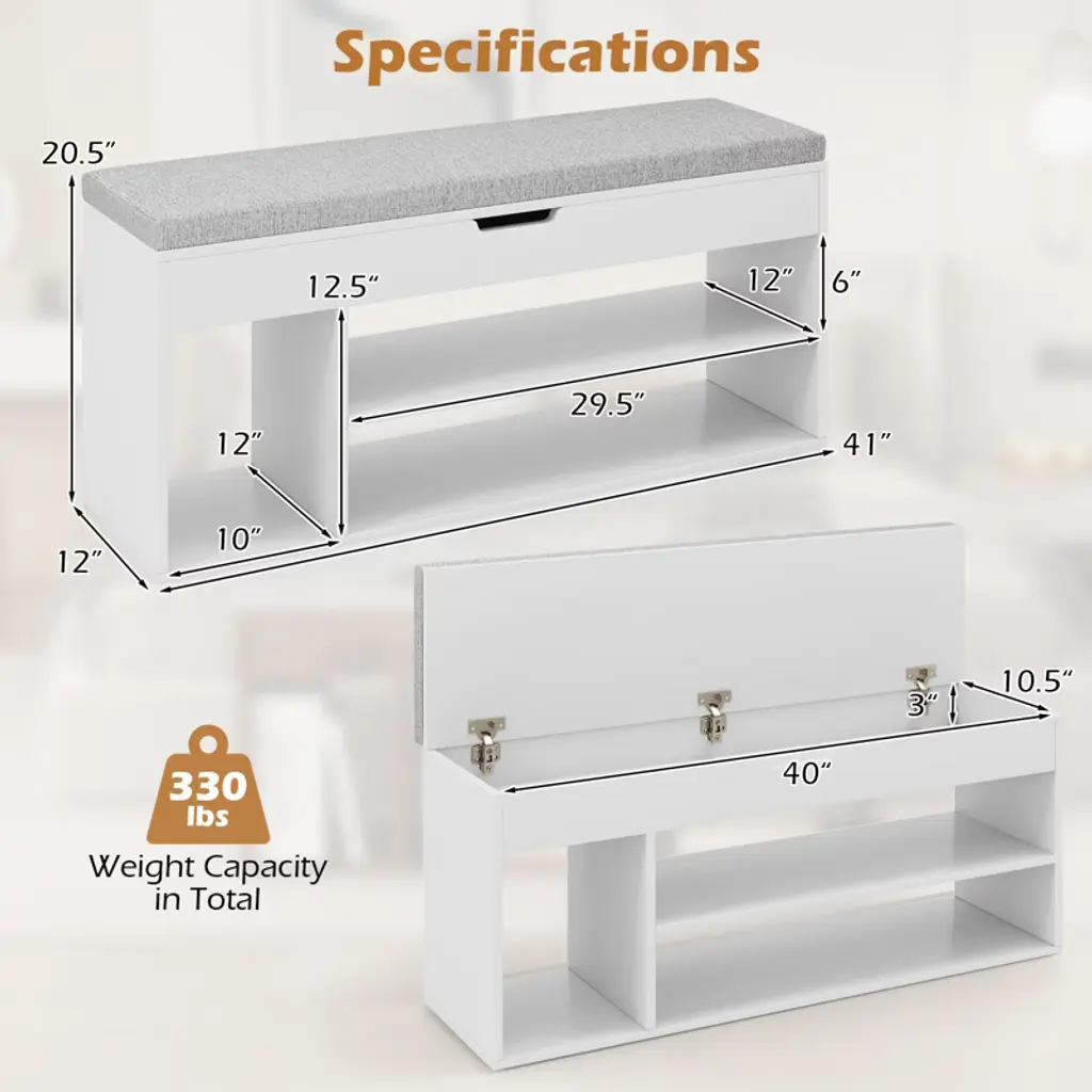 Enhance the functionality and style of your home with our exceptional storage bench. Crafted from high-quality boards, this bench boasts a stable structure capable of holding up to 495 lbs. The ample storage space, featuring three shelves and a hidden compartment, ensures all your shoes and essential items are neatly organized. The removable cushion, filled with soft sponge, provides a comfortable seating experience for your daily convenience. Classic design seamlessly complements a variety of furniture styles in your entryway, living room or bedroom. Moreover, the smooth and burr-free wooden surface is easy to clean and maintain, ensuring a pristine look.FeaturesThree spacious storage shelves can easily store different types of footwear Hidden compartment for keys, change, or small items Stable structure supports up to 495 lbsSpecifications:Color: White, Gray Material: Engineered Wood, Sponge, Fabric Product Dimensions: 41" x 12" x 20.5" (W x D x H) Weight Capacity of Seat: 330 lbs Weight Capacity in Total: 495 lbs Net Wight: 41 lbs Package Includes: 1 x Shoe Bench 1 x Instruction