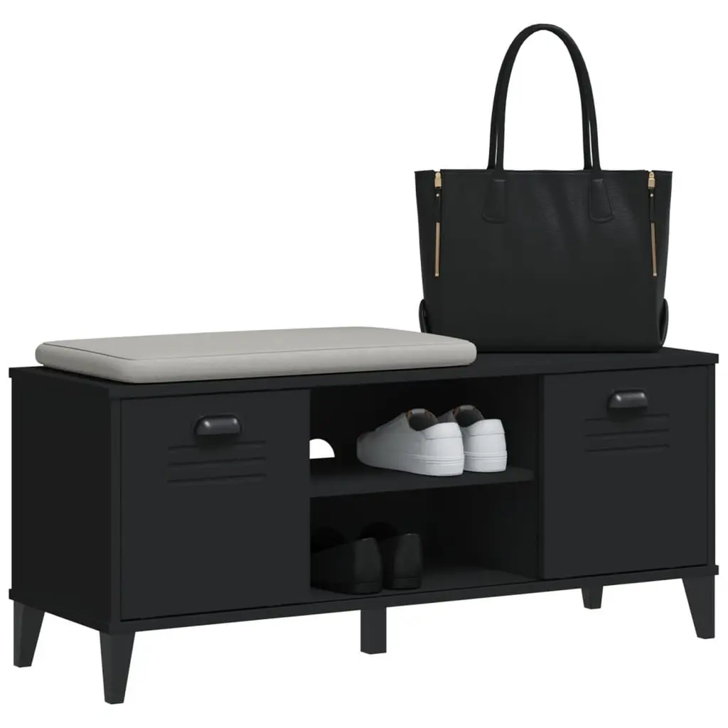 This shoe storage bench combines style and usefulness, enhancing your entryway while keeping it tidy. With a trendy industrial vibe, it not only helps with shoe clutter but also serves as a stylish seat to welcome you when you walk in. Loads of Storage: With two hinged doors and two open compartments, this bench keeps your footwear neat and within reach. The multi-tier design maximizes space, so you can store all sorts of shoes, from loafers to boots.Sturdy Build: The clean lines and matte black finish of its industrial look make this bench a striking piece in any hallway or living room. Made from durable engineered wood, it blends with various styles while providing practical storage.Quality Stuff: Crafted from top-quality engineered wood and synthetic plastic, this bench is built to last and easy to maintain. A quick wipe down keeps it looking fresh and stylish.Super Versatile: Great for hallways, living rooms, or anywhere else, this shoe storage piece fits seamlessly into your home’s daily activities, reducing clutter in busy spaces.Compact Size: With 41.7 in long, 13.8 in wide, and 17.7 in high, it fits snugly in tight spots without skimping on storage.