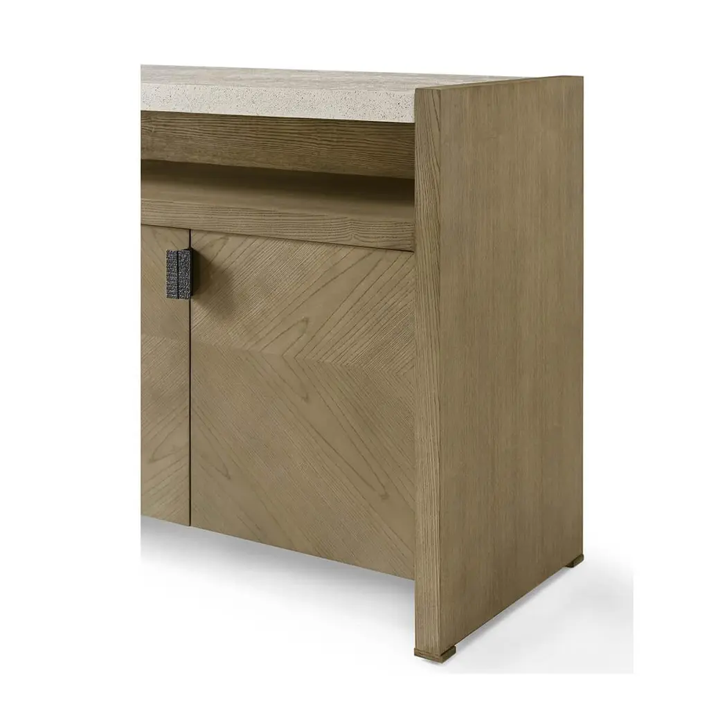 a four-door media cabinet in figured cathedral ash in an artful grain pattern in our light Dune finish. Completed with metal pulls in Ember and a top in our Mineral finish. Fitted with adjustable shelves in each cabinet.Dimensions: 70" W x 21" D x 34" H