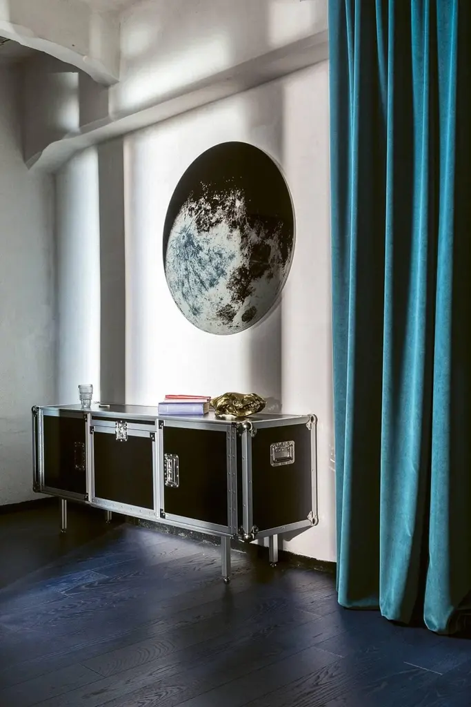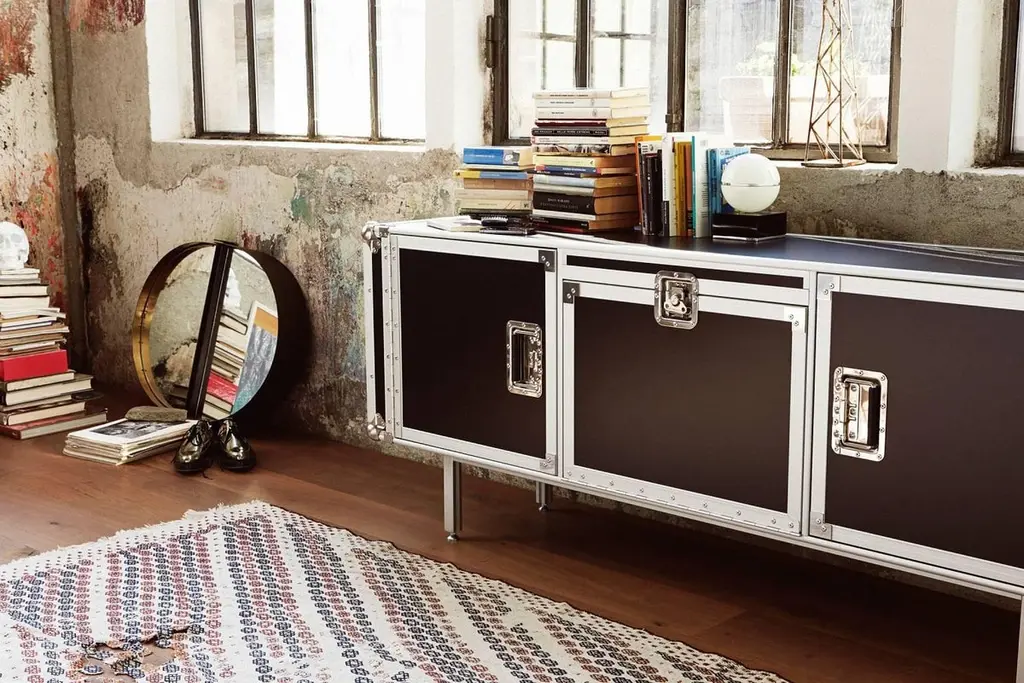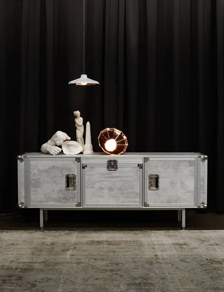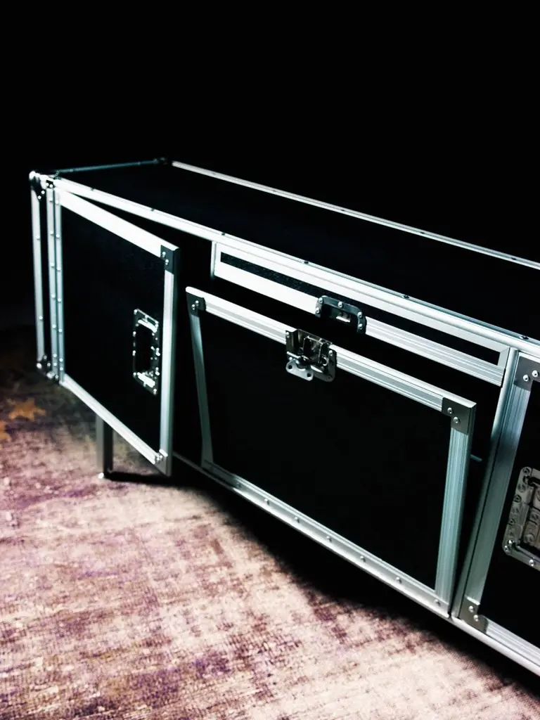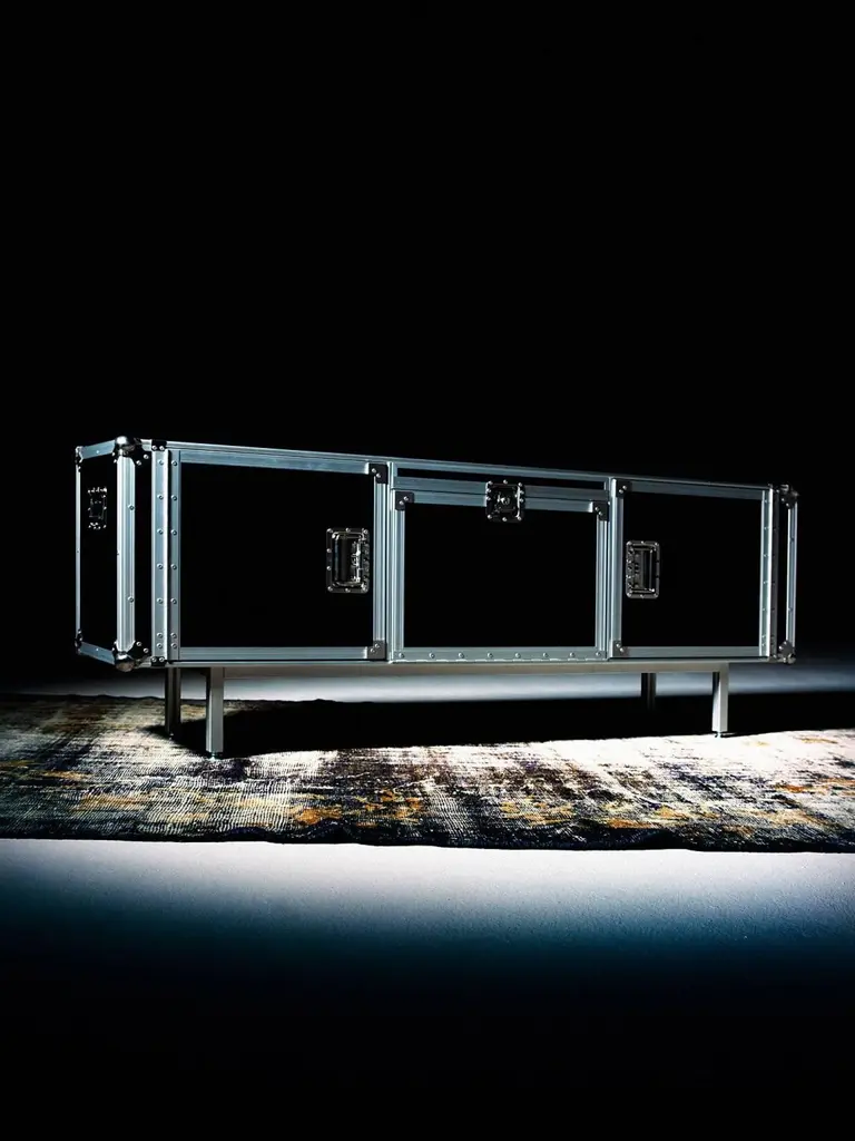 "Total Flightcase" is a large cabinet, designed by Diesel Creative Team and manufactured by Moroso, featuring a frame in extruded aluminum section bar, laminated plywood and handles in steel with chrome finish. This cabinet is a peculiar object inspired by the travel case used by musicians to carry their instruments on tour.Dimensions:D 17.7", W 70.9", H 28.3"Moroso, with Diesel, has created a collection of products with a relaxed and comfortable mood, taking its inspiration from an informal lifestyle concept and targeting consumers who like simple shapes yet at the same time seek a “modern” style made up of high quality combined with a distinctive design of pure lines.“We worked with the Diesel creative team to develop an interesting and alternative collection idea which was to represent two different yet coexisting aspects of certain contemporary trends: one which is darker in tone, inspired by the underground world and with a more aggressive and enigmatic aesthetic, and the other lighter, inspired by nature and a visual radiance, with soft and welcoming shapes”, explained Patrizia Moroso who always follows all the phases of every design project personally.