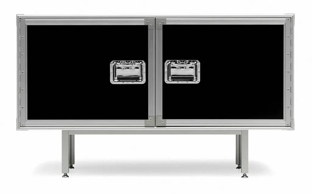 "Total Flightcase" is a small cabinet, designed by Diesel Creative Team and manufactured by Moroso, featuring a frame in extruded aluminum section bar, laminated plywood and handles in steel with chrome finish. This cabinet is a peculiar object inspired by the travel case used by musicians to carry their instruments on tour.Dimensions:D. 17.7", W. 47.2", H. 28.3"Moroso, with Diesel, has created a collection of products with a relaxed and comfortable mood, taking its inspiration from an informal lifestyle concept and targeting consumers who like simple shapes yet at the same time seek a “modern” style made up of high quality combined with a distinctive design of pure lines.“We worked with the Diesel creative team to develop an interesting and alternative collection idea which was to represent two different yet coexisting aspects of certain contemporary trends: one which is darker in tone, inspired by the underground world and with a more aggressive and enigmatic aesthetic, and the other lighter, inspired by nature and a visual radiance, with soft and welcoming shapes”, explained Patrizia Moroso who always follows all the phases of every design project personally.
