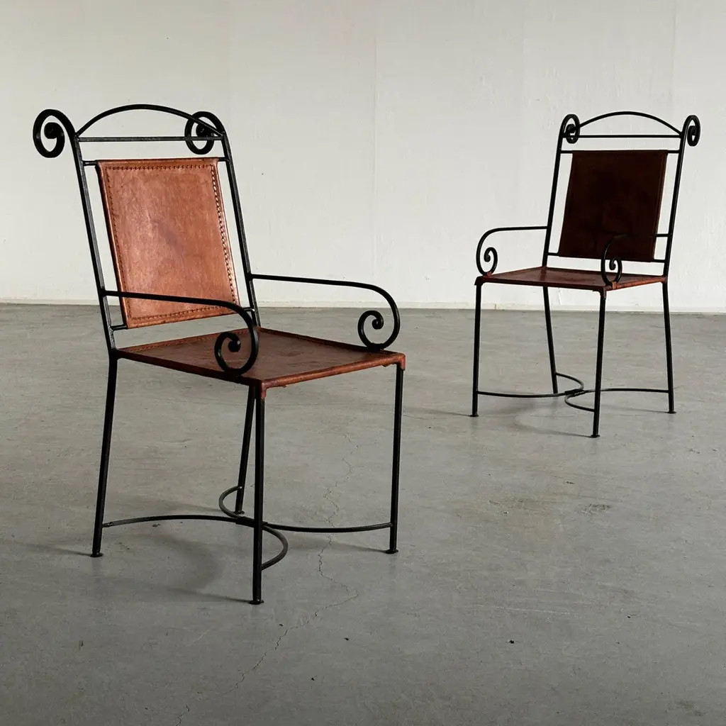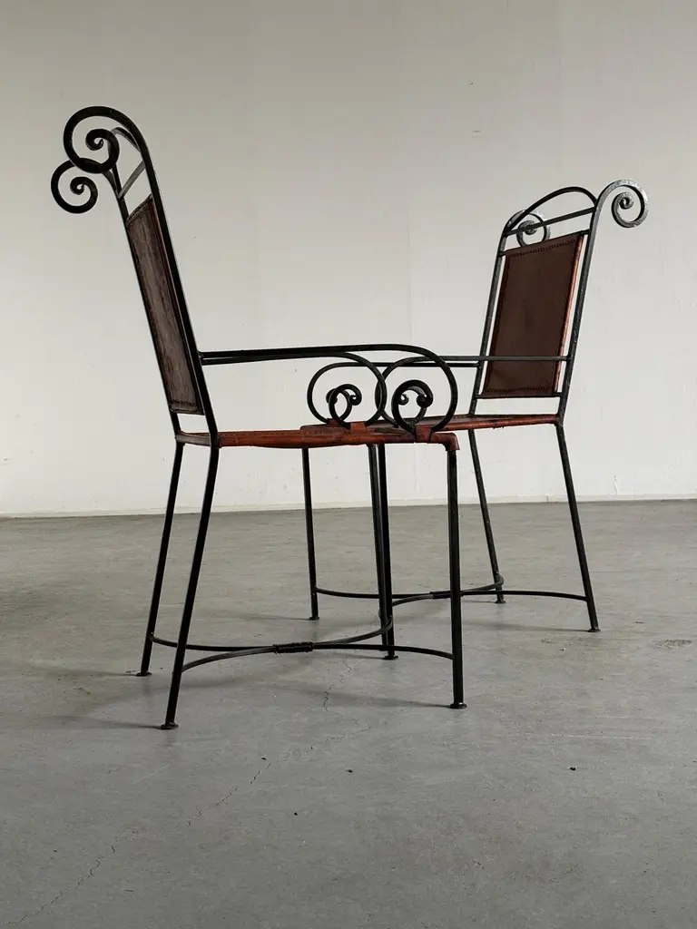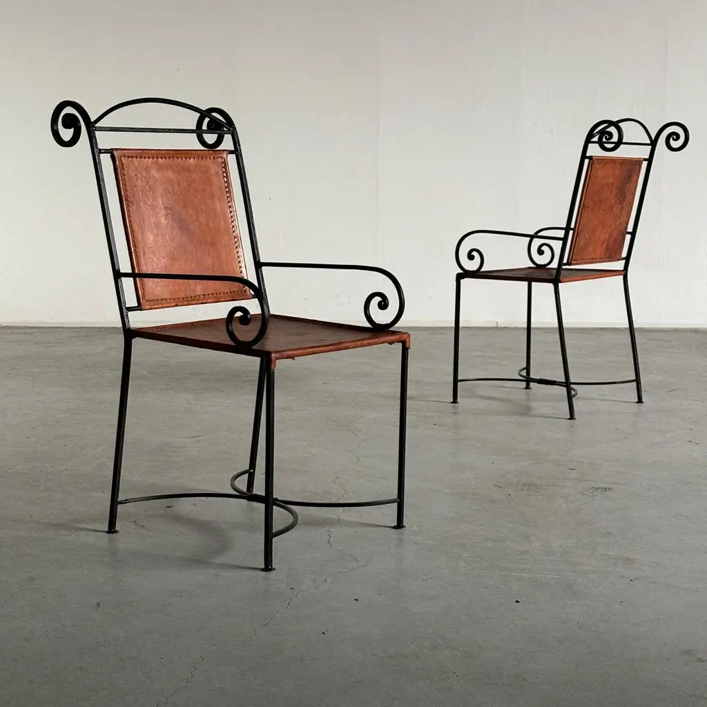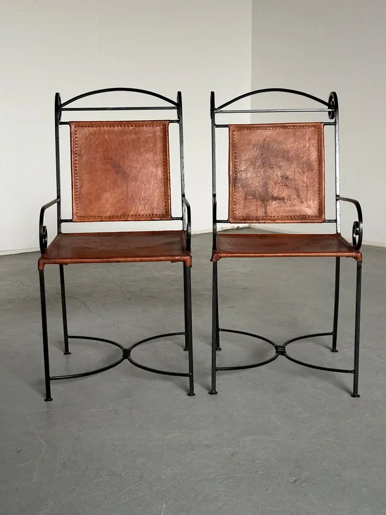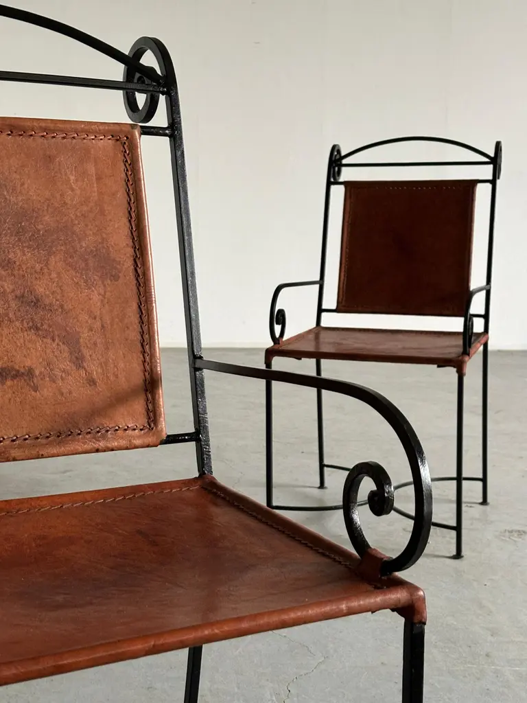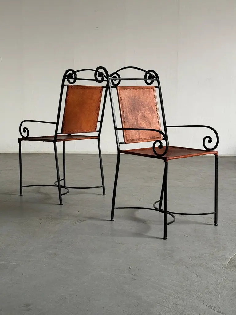 Vintage French artisanal “mediterranean style” armchairs. Comprised of a black wrought iron frame which forms into swirls in the arm and backrest sections. On the frames rest thick, patinated cognac leather seats and backrests.Made in the 1980s.Sold per piece.Chairs are in good vintage condition with expected signs of age, as indicated in the photos. The leather features “splash marks” and an all around patina, comon for this type of chair and material. Very sturdy iron construction.Width: 44 cm / 17.32 inchesDepth: 62.5 cm / 24.61 inchesHeight: 90 cm / 35.43 inchesSeat Height: 43 cm / 16.93 inchesWeight: 8.60 kg / 18.96 lbsWe try our best to accurately depict any imperfections on our photos. Please feel free to contact us for any additional photos._________PACKAGINGAll of our items are thoroughly cleaned and carefully packed for shipping.It is very important for us that the packaging has the same high-quality standard as the purchased item. Depending on the size and fragility of the item, packaging can be made in a heavy duty industrial cardboard box or a custom wooden crate packaging.Freight items are packed on pallets.We create custom packages to save unnecessary packaging waste and filling.We use recyclable materials only.HANDLINGWe aim to ship products within 72 hours of receiving Your order. For bigger items and bulk orders, please allow up to 5-7 business days to safely handle and ship out Your order.SHIPPINGOver 90% of our items are shipped to destinations in North America and Asia.We offer premium worldwide shipping with tracking and insurance included in all shipping options.All shipping costs are automatically calculated during the checkout process, once the quantity and destination has been selected. Due to custom packaging, shipping for combined orders is not always automatically calculated correctly. Please contact us for shipping quotes for combined orders, or proceed to order the items after which we will issue a partial refund if the shipping was overpaid.100% insurance included in the shipping price.All of our packages are insured or guaranteed for by us, provided that any proof of damage is delivered to us within 3 days of delivery. Any visible damages on the package must be photographed upon delivery or the insurance policy might not be valid.POSTAL SHIPPING / EMS SHIPPINGMost of our items (chairs, armchairs, sofa modules, lamps, coffee tables etc.) are packed in packages up to 31,5kg / 70x70x100cm or equivalent and shipped as premium international air packages or EMS packages through the international state shipping carriers.The packages are delivered locally by the domestic postal carrier of the recipient’s country.Approximate delivery times for postal packages (based on year 2023.)- USA / Canada = 7-15 business days after dispatch- Asia / Middle East = 10-18 business days after dispatch- EU/EEA = 5-10 business days after dispatchIf the order has not been delivered within 60 days from the dispatch date, a full refund for the shipping is issued.If the order has not been delivered within 90 days from the dispatch date, a full refund for the order is issued.Based on the years 2021.-2023., only one package per 650 packages is lost in transit (0,0015%).FREIGHT SHIPPINGAll oversized items that cannot be shipped or disassembled to ship in parts up to 31,5kg / 70x70x100cm or equivalent (sofas, seating sets, bigger sofa modules, beds, closets and larger storage cabinets etc.) air shipped via air freight shipping (overseas) or road freight shipping (EU/EEA).All freight shipping options include curbside delivery with package unloading.Additional services such as In-house/white glove delivery or disposal of the shipping materials can sometimes be arranged on demand and at an additional charge.Approximate delivery times for freight packages (based on year 2023.)- Air freight shipping: 3-5 business days, delivery is scheduled with the import agent- Road freight shipping (EU/EEA) – 2-8 business days, delivery day is announced prior to delivery.DHL SHIPPING UPGRADEPriority shipping via DHL can be found on checkout or quoted on request.Estimated transit time for DHL shipping is 1-5 days for all destinations worldwide.SEA FREIGHT/CONTAINER SHIPPINGFor large orders of 50+ items, sea freight or container shipping can be offered in arrangement with the buyer.Please contact us for more information.CUSTOMS / IMPORT DUTIESOverseas customers (outside EU) may incur import duties and taxes, which is charged to the buyer/recipient/importer.Etsy collects VAT/GST/sales tax for some countries/states - if charged on checkout, it should not be charged again on delivery.WHOLESALE / TRADEWe offer trade / wholesale discount as well as discounts on larger orders.EU trade professionals are required to purchase as business entities with valid VAT ID numbers to achieve trade discount.