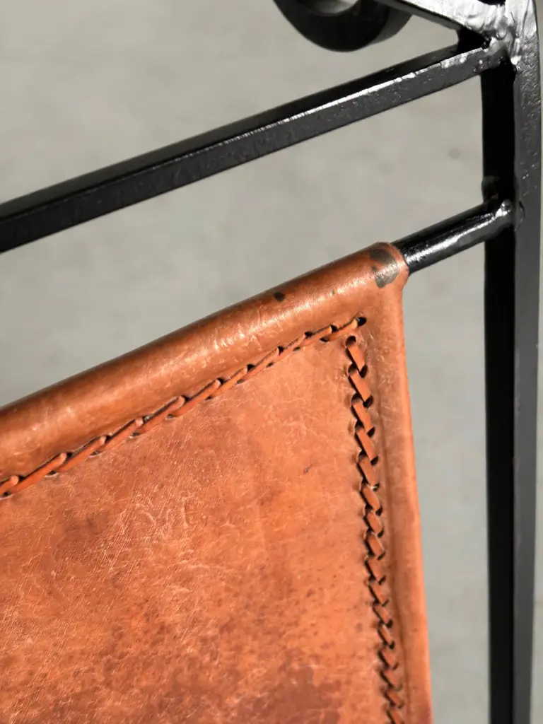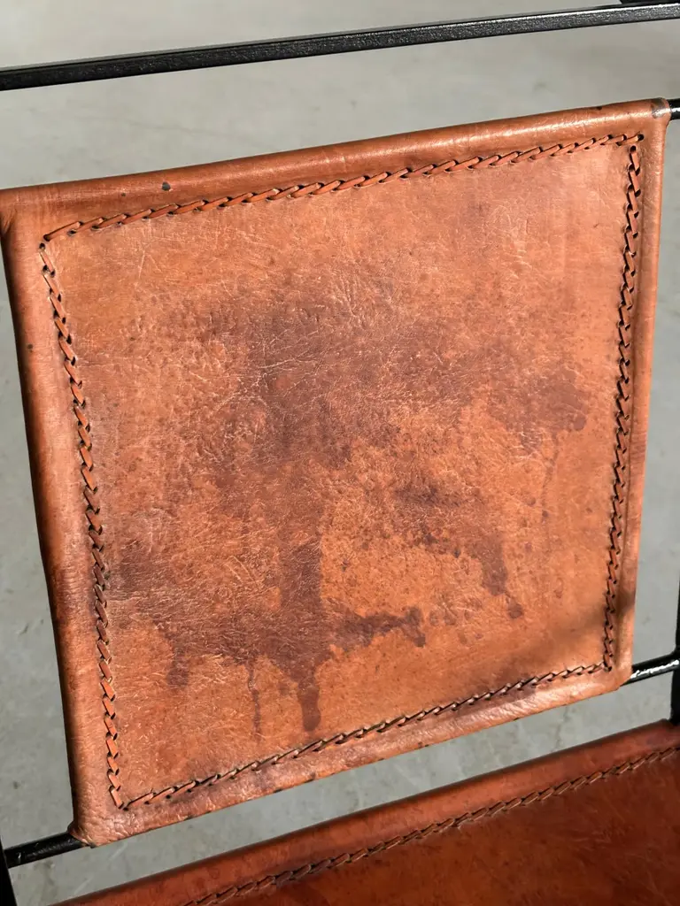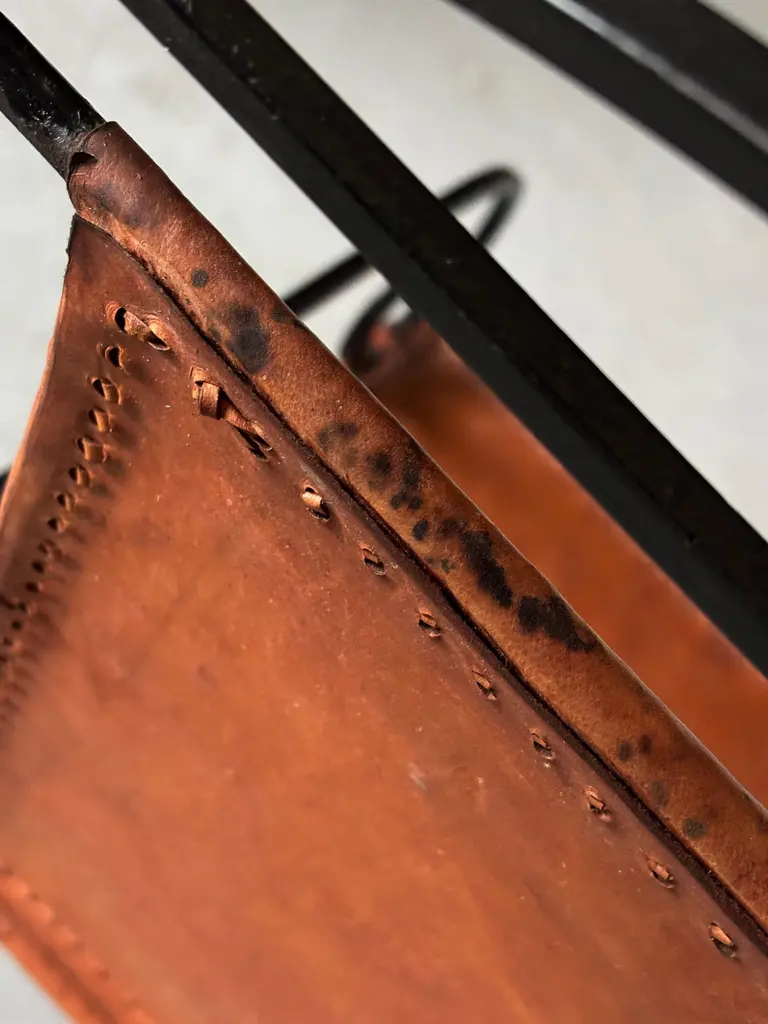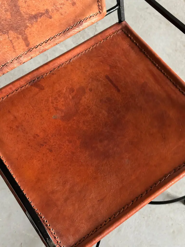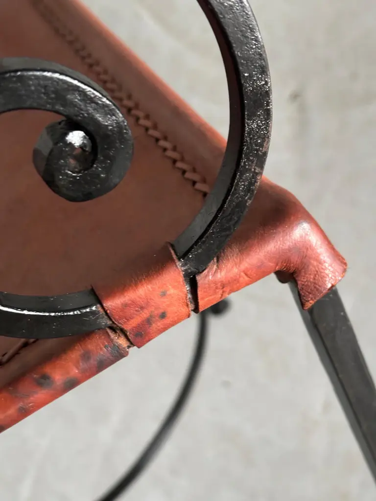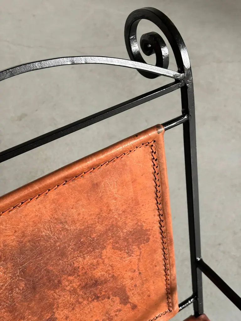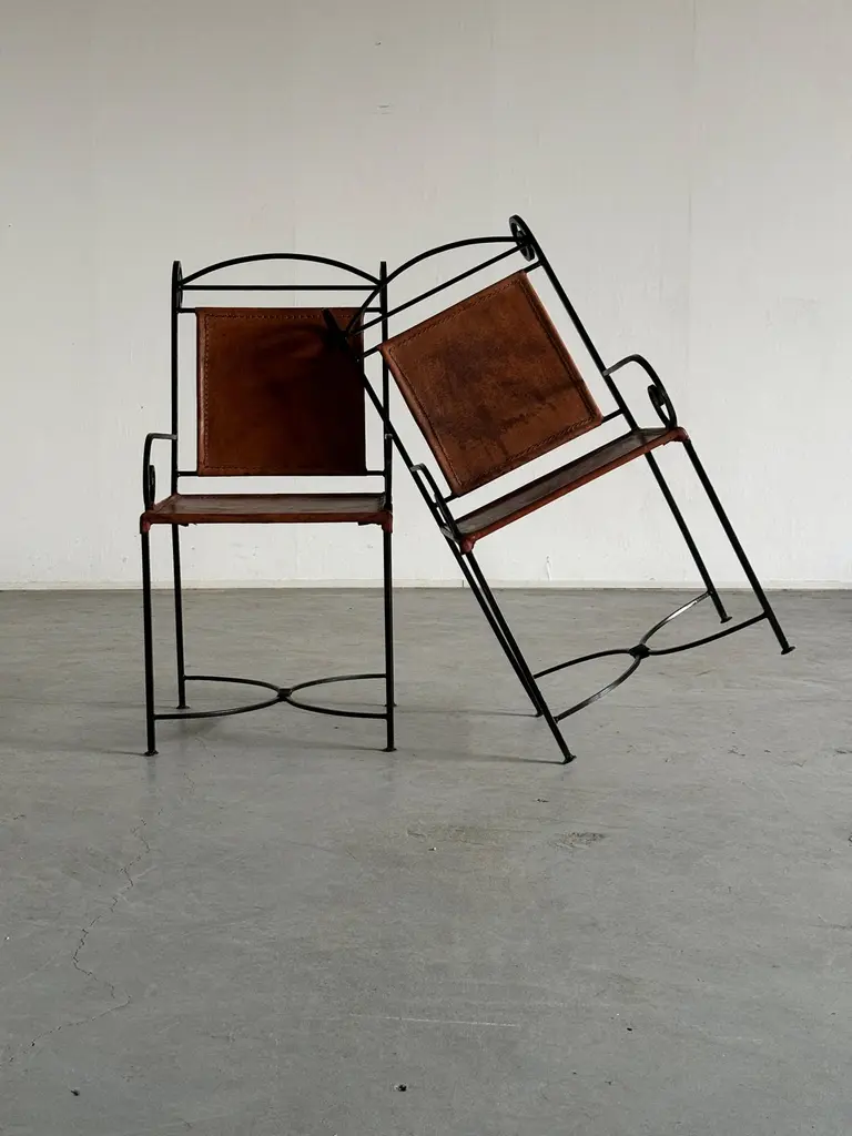 Vintage French artisanal “mediterranean style” armchairs. Comprised of a black wrought iron frame which forms into swirls in the arm and backrest sections. On the frames rest thick, patinated cognac leather seats and backrests.Made in the 1980s.Sold per piece.Chairs are in good vintage condition with expected signs of age, as indicated in the photos. The leather features “splash marks” and an all around patina, comon for this type of chair and material. Very sturdy iron construction.Width: 44 cm / 17.32 inchesDepth: 62.5 cm / 24.61 inchesHeight: 90 cm / 35.43 inchesSeat Height: 43 cm / 16.93 inchesWeight: 8.60 kg / 18.96 lbsWe try our best to accurately depict any imperfections on our photos. Please feel free to contact us for any additional photos._________PACKAGINGAll of our items are thoroughly cleaned and carefully packed for shipping.It is very important for us that the packaging has the same high-quality standard as the purchased item. Depending on the size and fragility of the item, packaging can be made in a heavy duty industrial cardboard box or a custom wooden crate packaging.Freight items are packed on pallets.We create custom packages to save unnecessary packaging waste and filling.We use recyclable materials only.HANDLINGWe aim to ship products within 72 hours of receiving Your order. For bigger items and bulk orders, please allow up to 5-7 business days to safely handle and ship out Your order.SHIPPINGOver 90% of our items are shipped to destinations in North America and Asia.We offer premium worldwide shipping with tracking and insurance included in all shipping options.All shipping costs are automatically calculated during the checkout process, once the quantity and destination has been selected. Due to custom packaging, shipping for combined orders is not always automatically calculated correctly. Please contact us for shipping quotes for combined orders, or proceed to order the items after which we will issue a partial refund if the shipping was overpaid.100% insurance included in the shipping price.All of our packages are insured or guaranteed for by us, provided that any proof of damage is delivered to us within 3 days of delivery. Any visible damages on the package must be photographed upon delivery or the insurance policy might not be valid.POSTAL SHIPPING / EMS SHIPPINGMost of our items (chairs, armchairs, sofa modules, lamps, coffee tables etc.) are packed in packages up to 31,5kg / 70x70x100cm or equivalent and shipped as premium international air packages or EMS packages through the international state shipping carriers.The packages are delivered locally by the domestic postal carrier of the recipient’s country.Approximate delivery times for postal packages (based on year 2023.)- USA / Canada = 7-15 business days after dispatch- Asia / Middle East = 10-18 business days after dispatch- EU/EEA = 5-10 business days after dispatchIf the order has not been delivered within 60 days from the dispatch date, a full refund for the shipping is issued.If the order has not been delivered within 90 days from the dispatch date, a full refund for the order is issued.Based on the years 2021.-2023., only one package per 650 packages is lost in transit (0,0015%).FREIGHT SHIPPINGAll oversized items that cannot be shipped or disassembled to ship in parts up to 31,5kg / 70x70x100cm or equivalent (sofas, seating sets, bigger sofa modules, beds, closets and larger storage cabinets etc.) air shipped via air freight shipping (overseas) or road freight shipping (EU/EEA).All freight shipping options include curbside delivery with package unloading.Additional services such as In-house/white glove delivery or disposal of the shipping materials can sometimes be arranged on demand and at an additional charge.Approximate delivery times for freight packages (based on year 2023.)- Air freight shipping: 3-5 business days, delivery is scheduled with the import agent- Road freight shipping (EU/EEA) – 2-8 business days, delivery day is announced prior to delivery.DHL SHIPPING UPGRADEPriority shipping via DHL can be found on checkout or quoted on request.Estimated transit time for DHL shipping is 1-5 days for all destinations worldwide.SEA FREIGHT/CONTAINER SHIPPINGFor large orders of 50+ items, sea freight or container shipping can be offered in arrangement with the buyer.Please contact us for more information.CUSTOMS / IMPORT DUTIESOverseas customers (outside EU) may incur import duties and taxes, which is charged to the buyer/recipient/importer.Etsy collects VAT/GST/sales tax for some countries/states - if charged on checkout, it should not be charged again on delivery.WHOLESALE / TRADEWe offer trade / wholesale discount as well as discounts on larger orders.EU trade professionals are required to purchase as business entities with valid VAT ID numbers to achieve trade discount.