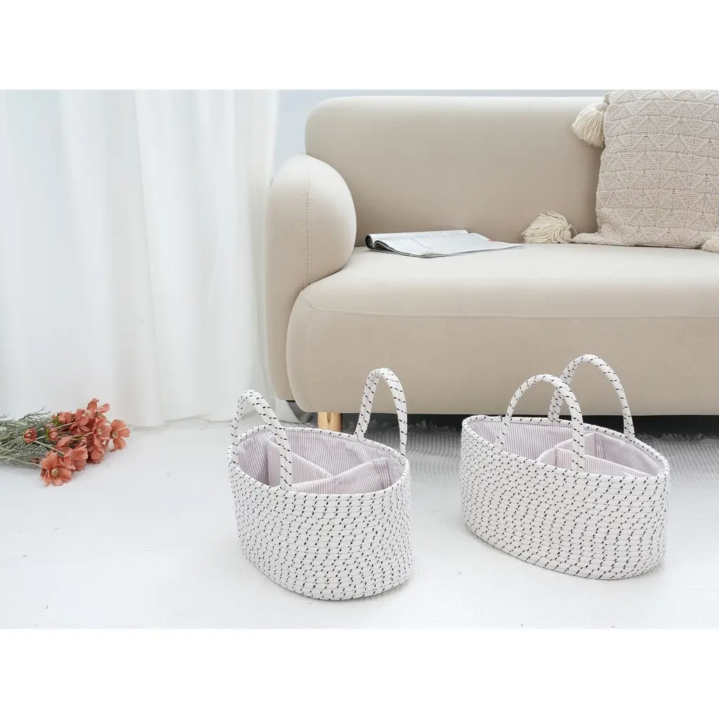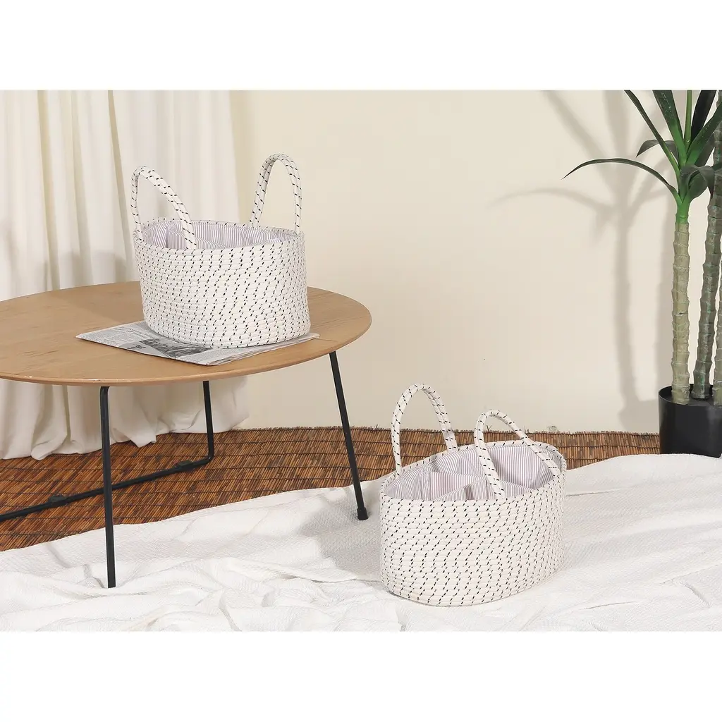 Premium Material: Our organization baskets are meticulously handcrafted from odorless cotton rope. They are designed with no sharp corners. The hidden, widened handles and chic appearance make these baskets a fashionable and functional addition to any decorEasy Shaping: Upon receiving your rope basket, please remove it from the packaging and fill it with items such as clothes or dolls to help it regain its shape. For quicker shaping, consider using a steam ironCompact Size: Our rectangular closet woven basket measures 15*9.8*6.7" and 14.2*9.1*6.7", the size of this storage cube bin is suitable for living room TV cabinets, shelves, closets office tables, and room cube bookshelves. Breathable cotton rope material protects your things from dust and dumping. In addition, it also can be a shoe basket for an entrywayGreat Gift: This basket storage perfect size to fit everything and very aesthetic. Worked perfectly for making a get-well basket for a friend. Our woven storage basket is an ideal gift for Easter, Christmas, Thanksgiving, Mother's Day, Father's Day, Valentine's Day, or a girl's birthdayMultiple Use: This large basket is great for putting blankets, shoes, clothes, towels, decorative pillows, hats, scarves, magazines, headset wire, remote control, CDs, flowers, and more home supplies by the front door. Fits on a bedside table, closet shelf, bookshelf, desk, floor, etcOur basket for the bathroom, and designed with jute string and portable handles on the base. Minimalistic combined with a rustic style makes the whole flower basket simple and elegant. Handles design, easy to move and take away, free awesome practical adorable jute storage bin for daily use.These cotton rope baskets are designed to fit perfectly on shelves, closets, and even under beds, making them an ideal solution for organizing your home or office.