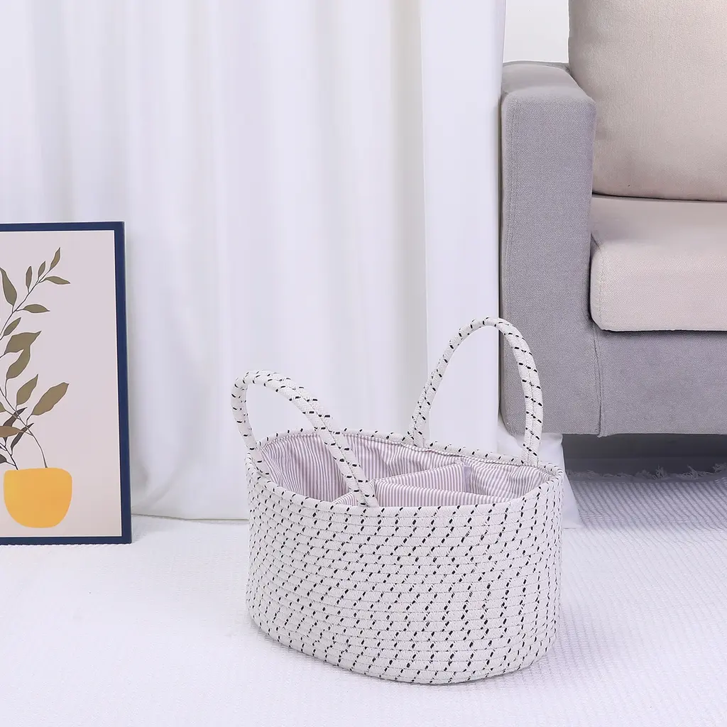 Premium Material: Our organization baskets are meticulously handcrafted from odorless cotton rope. They are designed with no sharp corners. The hidden, widened handles and chic appearance make these baskets a fashionable and functional addition to any decorEasy Shaping: Upon receiving your rope basket, please remove it from the packaging and fill it with items such as clothes or dolls to help it regain its shape. For quicker shaping, consider using a steam ironCompact Size: Our rectangular closet woven basket measures 15*9.8*6.7" and 14.2*9.1*6.7", the size of this storage cube bin is suitable for living room TV cabinets, shelves, closets office tables, and room cube bookshelves. Breathable cotton rope material protects your things from dust and dumping. In addition, it also can be a shoe basket for an entrywayGreat Gift: This basket storage perfect size to fit everything and very aesthetic. Worked perfectly for making a get-well basket for a friend. Our woven storage basket is an ideal gift for Easter, Christmas, Thanksgiving, Mother's Day, Father's Day, Valentine's Day, or a girl's birthdayMultiple Use: This large basket is great for putting blankets, shoes, clothes, towels, decorative pillows, hats, scarves, magazines, headset wire, remote control, CDs, flowers, and more home supplies by the front door. Fits on a bedside table, closet shelf, bookshelf, desk, floor, etcOur basket for the bathroom, and designed with jute string and portable handles on the base. Minimalistic combined with a rustic style makes the whole flower basket simple and elegant. Handles design, easy to move and take away, free awesome practical adorable jute storage bin for daily use.These cotton rope baskets are designed to fit perfectly on shelves, closets, and even under beds, making them an ideal solution for organizing your home or office.