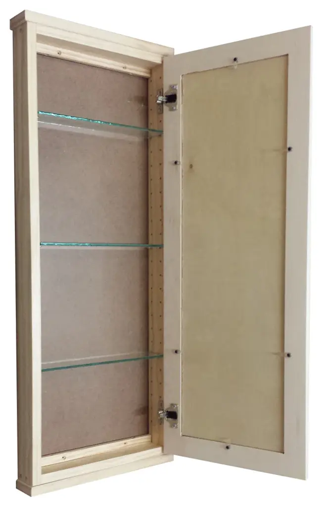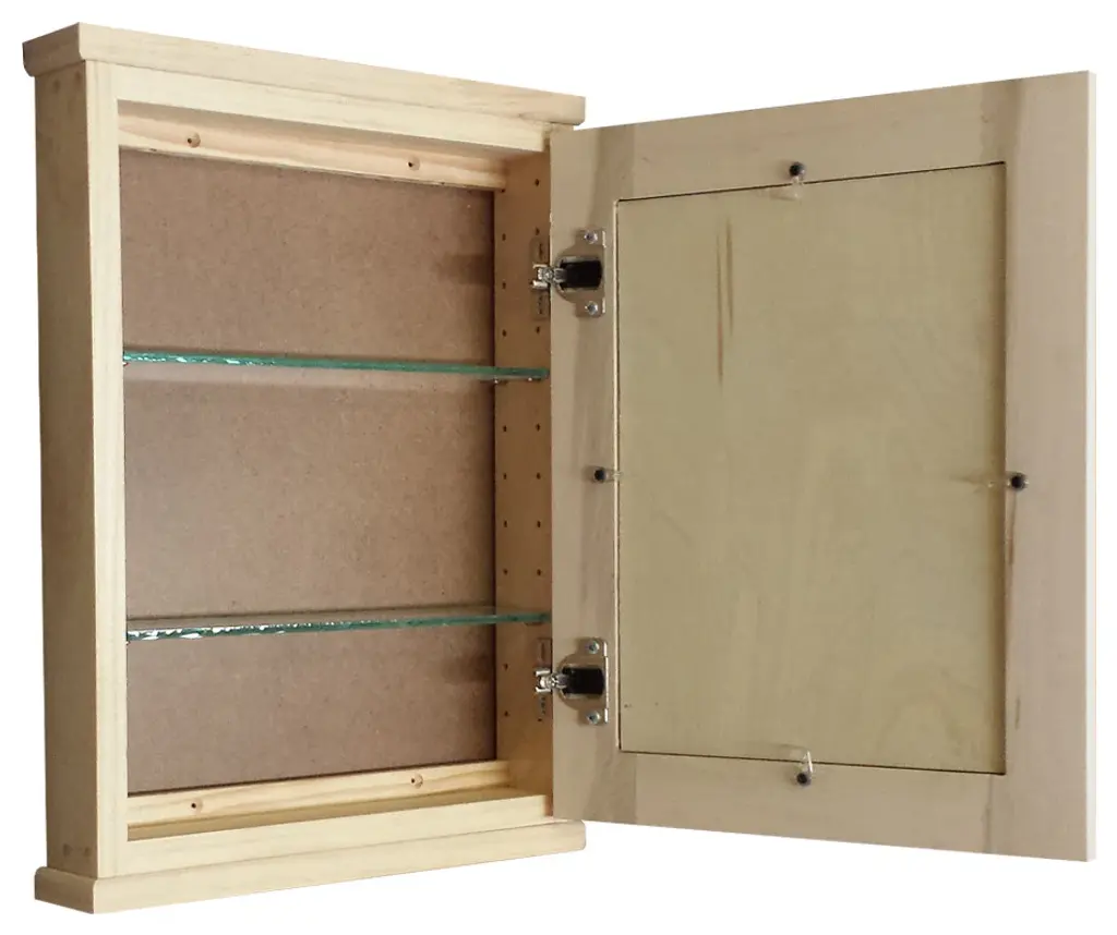 We believe the Fox Hollow Furnishings Mirrored Medicine Cabinet is the nicest recessed medicine cabinet available anywhere today. It features the look of an upscale framed mirror, is handmade from real wood, and sits closer to the wall than any other medicine cabinet we''ve ever seen. Our unique design also allows you easy access to the mirror so you can remove it for thorough cleaning or replace it, should anything ever happen to it -- without having to replace the entire cabinet.Available in 15+ colors! Measures 18" H x 14" W x 3.75" D and holds an 11" x 14" mirror.individually handcrafted from US grown hardwoodslacquer finish makes it resistant to moisturecompletely reversible; mounts with door opening in either directionincludes 2 high quality beveled glass shelvesadjustable to 7 different heightsDimensionsIn-wall cabinet, 18" H x 14" W x 3 3/4" DRough opening, 18 1/4" H x 14 1/4" W x 4" DCabinet interior, 17" H x 13" W x 3 1/2" DExterior frame, 19 7/8" H x 16 7/8" WHolds an 11" x 14" mirror• Note: The cabinet overlay (flange) will cover up to 1" in height and up to 1" in width.
