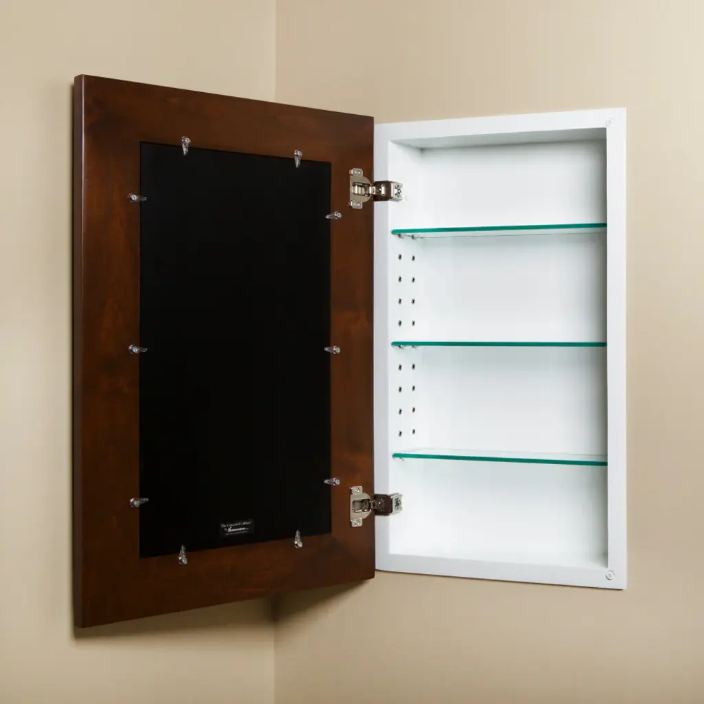 We believe the Fox Hollow Furnishings Mirrored Medicine Cabinet is the nicest recessed medicine cabinet available anywhere today. It features the look of an upscale framed mirror, is handmade from real wood, and sits closer to the wall than any other medicine cabinet we''ve ever seen. Our unique design also allows you easy access to the mirror so you can remove it for thorough cleaning or replace it, should anything ever happen to it -- without having to replace the entire cabinet.Available in 15+ colors! Measures 24" H x 14" W x 3.75" D and holds an 11" x 20" mirror.individually handcrafted from US grown hardwoodslacquer finish makes it resistant to moisturecompletely reversible; mounts with door opening in either directionincludes 3 high quality beveled glass shelvesadjustable to 11 different heightsDimensionsIn-wall cabinet, 24" H x 14" W x 3 3/4" DRough opening, 24 1/4" H x 14 1/4" W x 4" DCabinet interior, 23" H x 13" W x 3 1/2" DExterior frame, 25 7/8" H x 16 7/8" WHolds an 11" x 20" mirror• Note: The cabinet overlay (flange) will cover up to 1" in height and up to 1" in width.