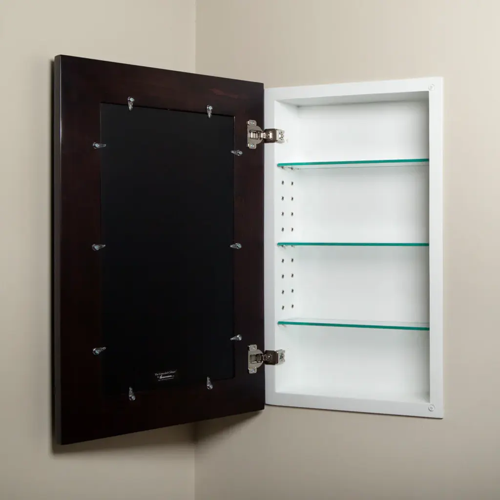 We believe the Fox Hollow Furnishings Mirrored Medicine Cabinet is the nicest recessed medicine cabinet available anywhere today. It features the look of an upscale framed mirror, is handmade from real wood, and sits closer to the wall than any other medicine cabinet we''ve ever seen. Our unique design also allows you easy access to the mirror so you can remove it for thorough cleaning or replace it, should anything ever happen to it -- without having to replace the entire cabinet.Available in 15+ colors! Measures 24" H x 14" W x 3.75" D and holds an 11" x 20" mirror.individually handcrafted from US grown hardwoodslacquer finish makes it resistant to moisturecompletely reversible; mounts with door opening in either directionincludes 3 high quality beveled glass shelvesadjustable to 11 different heightsDimensionsIn-wall cabinet, 24" H x 14" W x 3 3/4" DRough opening, 24 1/4" H x 14 1/4" W x 4" DCabinet interior, 23" H x 13" W x 3 1/2" DExterior frame, 25 7/8" H x 16 7/8" WHolds an 11" x 20" mirror• Note: The cabinet overlay (flange) will cover up to 1" in height and up to 1" in width.
