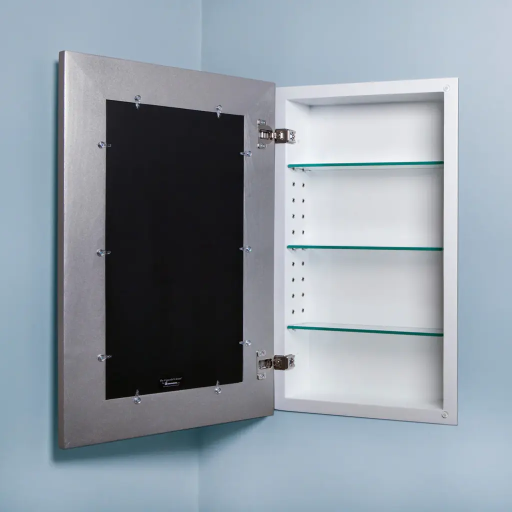 We believe the Fox Hollow Furnishings Mirrored Medicine Cabinet is the nicest recessed medicine cabinet available anywhere today. It features the look of an upscale framed mirror, is handmade from real wood, and sits closer to the wall than any other medicine cabinet we''ve ever seen. Our unique design also allows you easy access to the mirror so you can remove it for thorough cleaning or replace it, should anything ever happen to it -- without having to replace the entire cabinet.Available in 15+ colors! Measures 24" H x 14" W x 3.75" D and holds an 11" x 20" mirror.individually handcrafted from US grown hardwoodslacquer finish makes it resistant to moisturecompletely reversible; mounts with door opening in either directionincludes 3 high quality beveled glass shelvesadjustable to 11 different heightsDimensionsIn-wall cabinet, 24" H x 14" W x 3 3/4" DRough opening, 24 1/4" H x 14 1/4" W x 4" DCabinet interior, 23" H x 13" W x 3 1/2" DExterior frame, 25 7/8" H x 16 7/8" WHolds an 11" x 20" mirror• Note: The cabinet overlay (flange) will cover up to 1" in height and up to 1" in width.