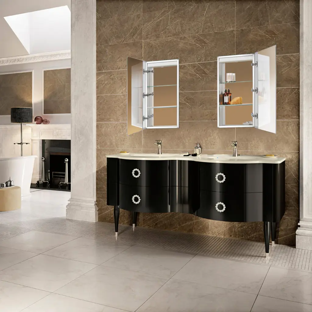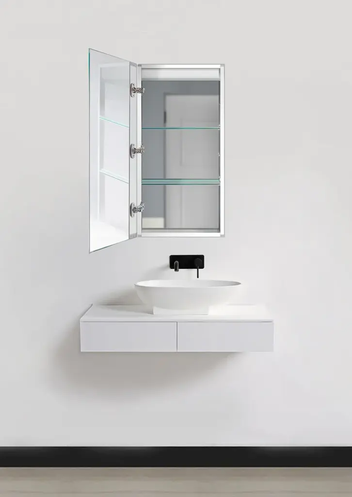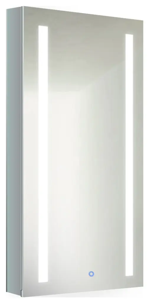 Our LED Medicine Cabinet is a symphony of design elements. We combined our most powerful lighting advancements to create a beautiful storage solution an expression of luxury and function for your bath. From a distance, the LED produces a striking, modern glow. Up close, enjoy unparalleled light dispersion on the face and body. Effortless to use, a revolutionary touch icon is integrated into the mirror face for seamless on/off toggling and dimming with memory functionalityOpen the cabinet to reveal the full suite of amenities. , LED-lit mirror is perfect for detailed makeup application. The mirrored interior is illuminated automatically for a luxurious touch. Our wide-angle hinges provide freedom of motion and panorama. We ensure reliable optical clarity with active defogging technology. This LED Medicine Cabinet is limited only by your imagination.Can be mounted both Surface or RecessUses Austrian 170 Degree Blum HardwareDimmer & Defogger included