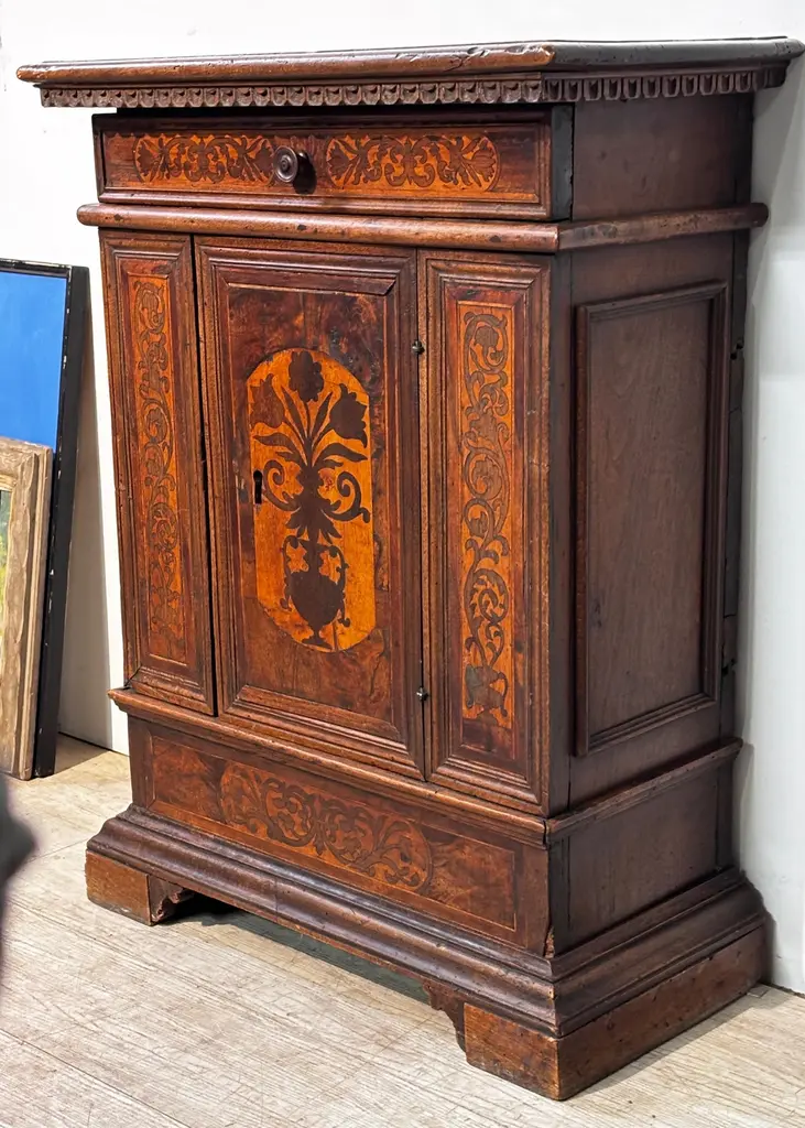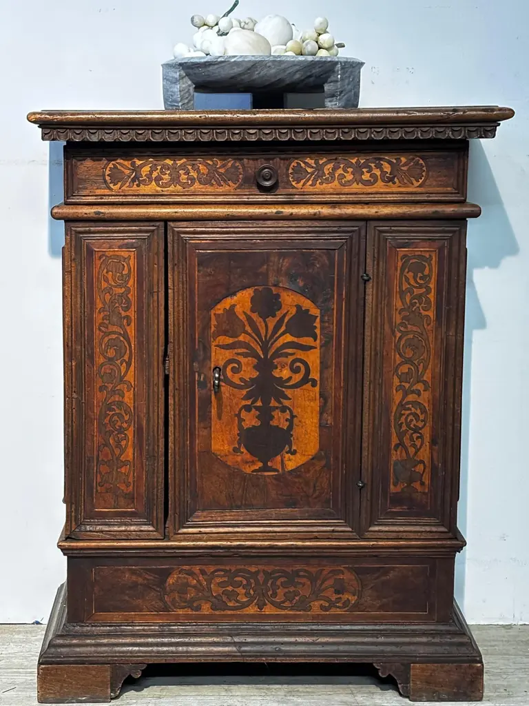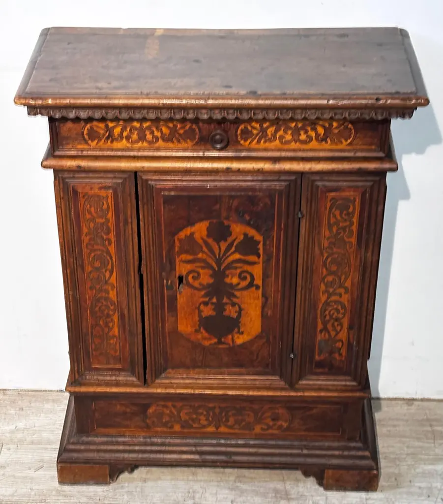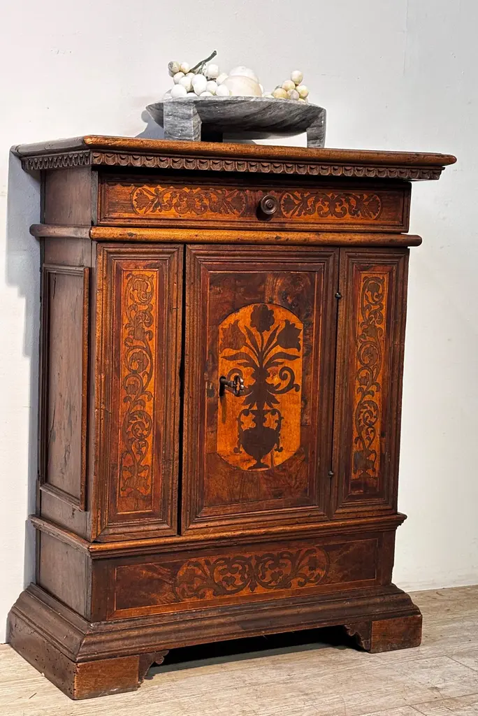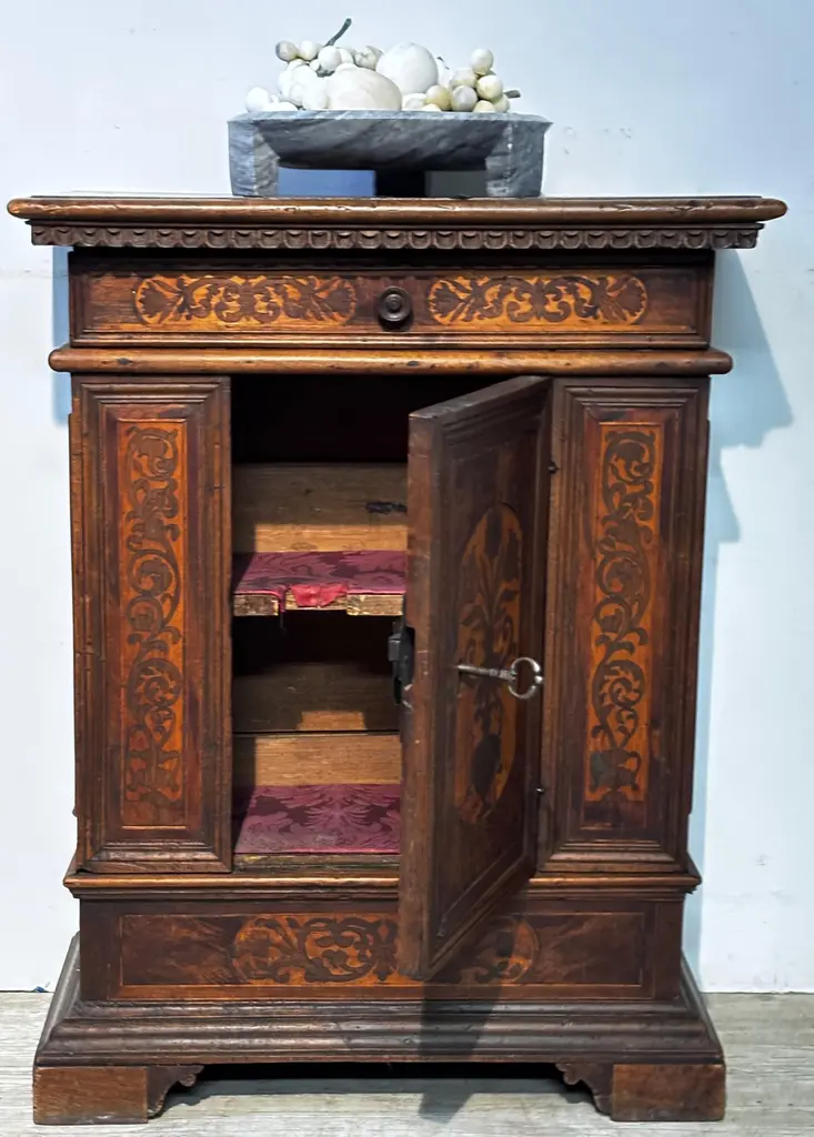 An extraordinary Renaissance Period walnut small side cabinet with fruitwood inlay detail.Of museum quality, in remarkable original condition (has not been reconstructed in any way), and retains its original lock and key.Easy to use small size that will enhance any setting and decor.Italy, 17th century.
