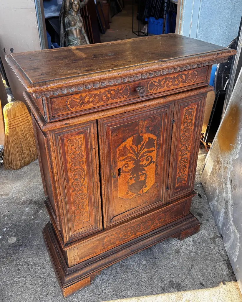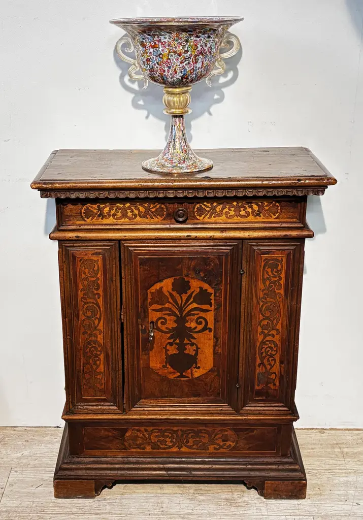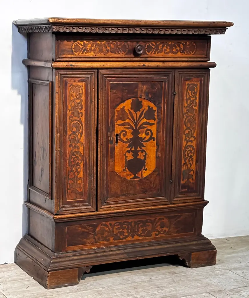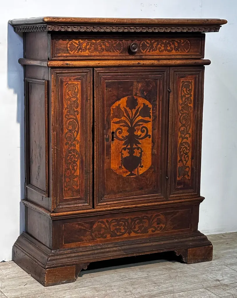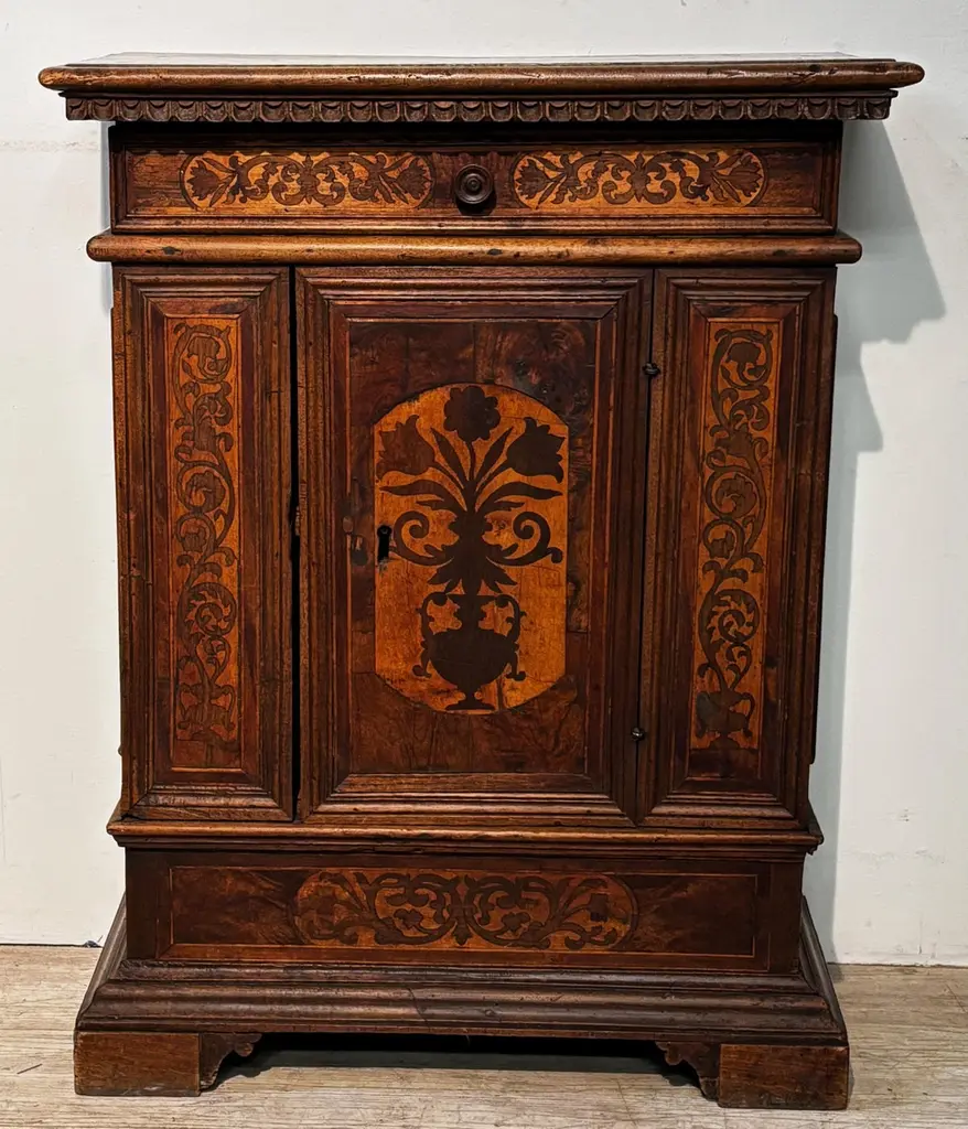 An extraordinary Renaissance Period walnut small side cabinet with fruitwood inlay detail.Of museum quality, in remarkable original condition (has not been reconstructed in any way), and retains its original lock and key.Easy to use small size that will enhance any setting and decor.Italy, 17th century.