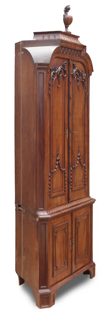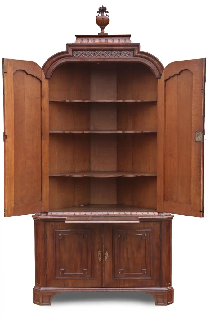Corner cabinet, The Hague circa 1775Dimensions: 270 cm high, 132 cm wide, and 72 cm deep.Oak core veneered with mahogany, gilded bronze fittings.Provenance: Passed down from generation to generation in a The Hague family until 2003.Sotheby's Amsterdam 2003 European Furniture, Sculpture and Decorative Arts /Lot 359This corner cabinet, presumed to have been crafted around 1775 in The Hague, remained in the same family from The Hague until 2003. It represents a unique example of a type of furniture that was commonly produced in the Netherlands during the latter half of the 18th century. This piece is particularly notable for its design; no similar corner cabinet is known to exist. The cabinet is a pure example of the transitional period, with the crisp lines of the Louis XVI style interspersed with the distinctly Louis XV carvings on the doors of the upper section. The cabinet's top is also of interest; it is partially curved and topped with a carved vase on a pedestal. The interior is designed to display tableware, featuring three scalloped-edge shelves at the front, all made from solid oak. A pull-out shelf is found in the middle rail. The bottom section has two doors and rests on bracket feet. The cabinet has been exceptionally well-preserved and boasts an original wax finish that imparts a rich, warm patina. It has recently been reviewed and is in good condition.