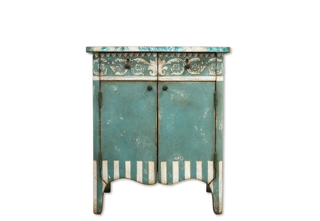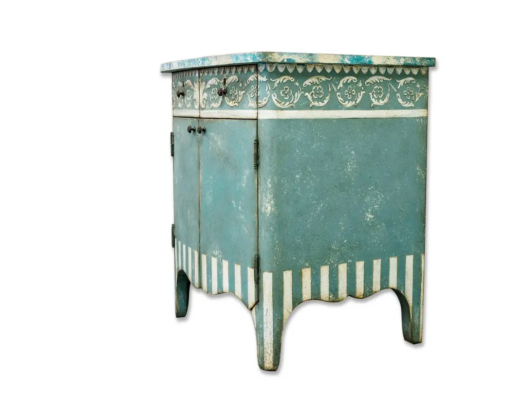 From our Hand-Painted Furniture Collection, we are pleased to introduce you to our Blue Dorsoduro Cabinet with stripes. This beautiful piece is finished with a classic ornament, framing the two tops drawers. The legs and sides are completed with fun stripes in contrasting creamy white. Lastly, the top is in a beautiful marble decor effect. Like each one of our pieces, also this Dorsoduro Chest may be customized with any color and decoration according to our customers’ requests. Each piece from our Collections is in fact entirely hand-painted on every side by using the very best 18th Century Craftsmanship Venetian Techniques, passed down through the generations of artists from our land. On request, extra protection can be applied to the top.