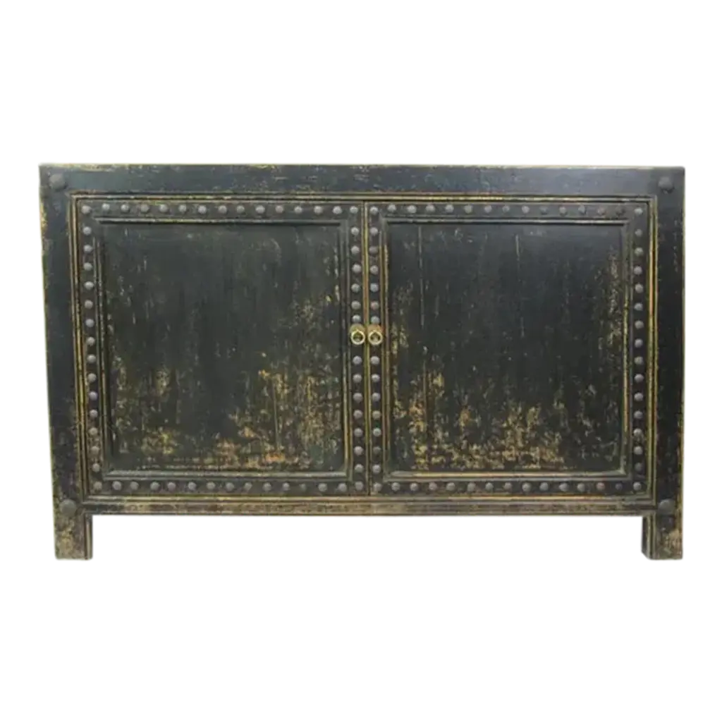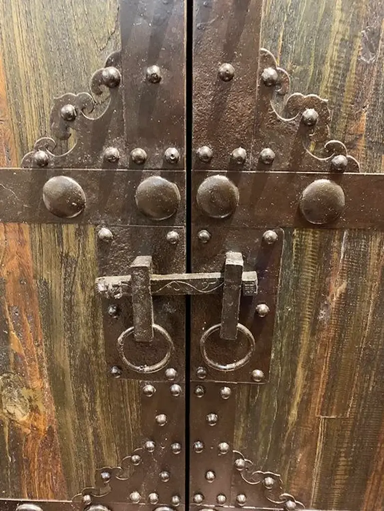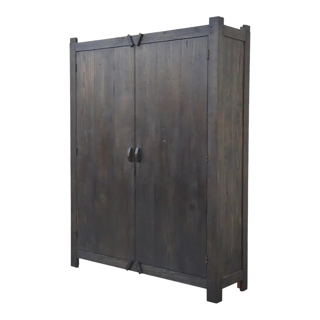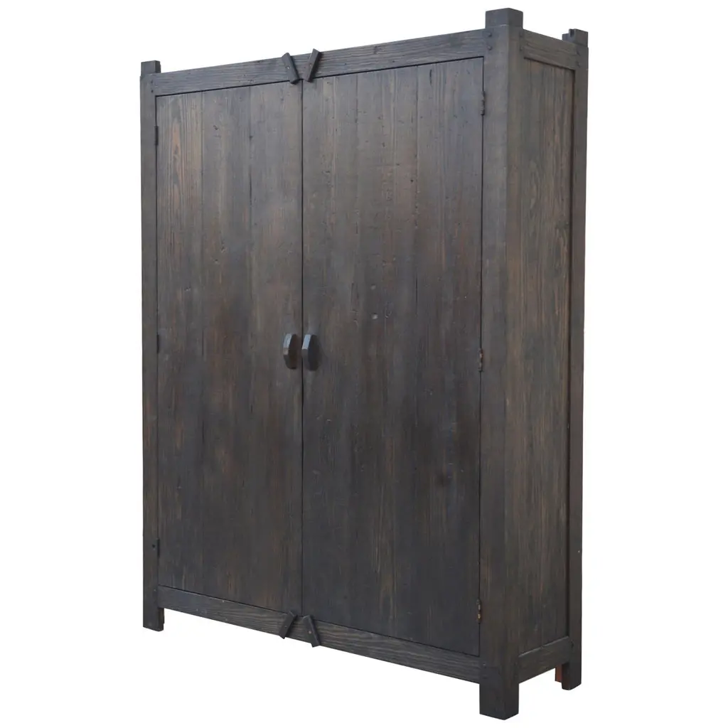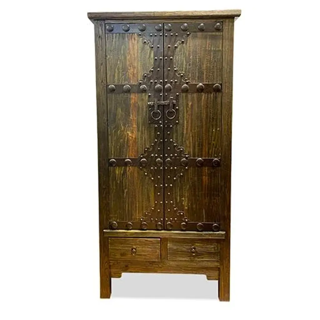 Asian Iron Doors Tall Cabinet is made out of elm wood. It has 2 doors, 3 removable shelves, and 2 drawers. It has a lots of storage. Material: Elm Wood Dimensions: 32.5"W x 16"D x 67"H Origin: China Condition: Perfect condition, all hand made wood joint.