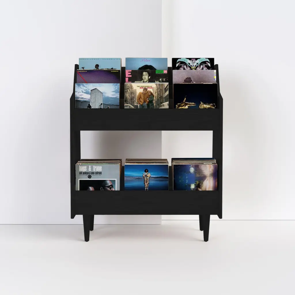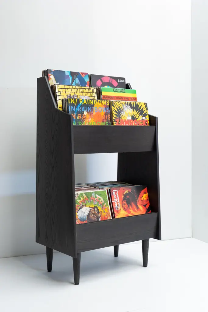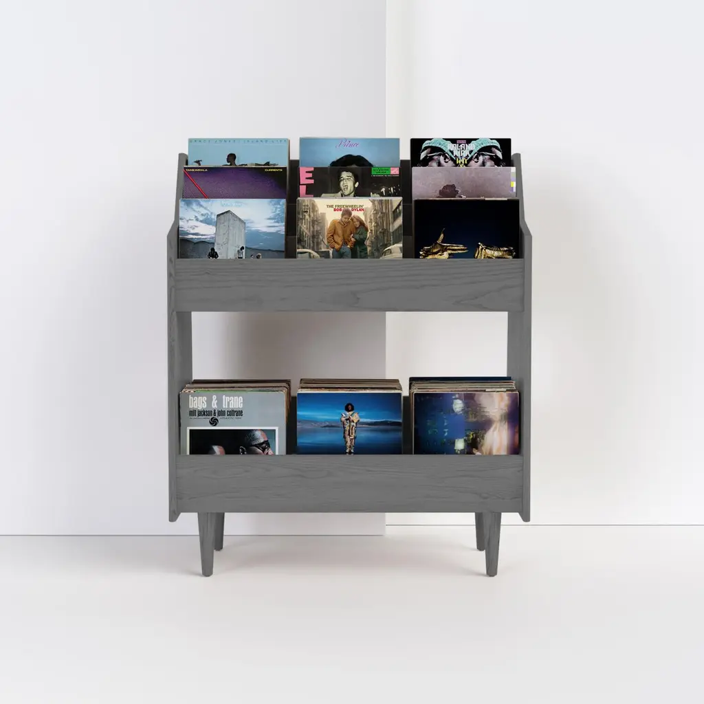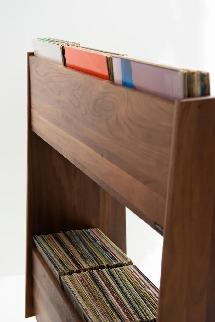 Luxe record stands elegantly display record cover art while providing easy access to as many as 350 records. All of our cabinets are hand-built in the United States from sustainably harvested solid Ash and Walnut, available in a range of finishes. Display and arrange your favorite cover art in the tiered upper section and flip through deeper storage below. Luxe combines our love for cover art with the utility we all need. Solid wood tapered legs add style while the integrated adjustable levelers help compensate for uneven floors and safely manages the extreme weight of vinyl records. No exposed hardware, solid wood construction and finish on all sides means Luxe can be used up against a wall or floating in a room.Features:Gallery style cover art displayLower deep storage binsSolid wood constructionStore up to 350 LPs.