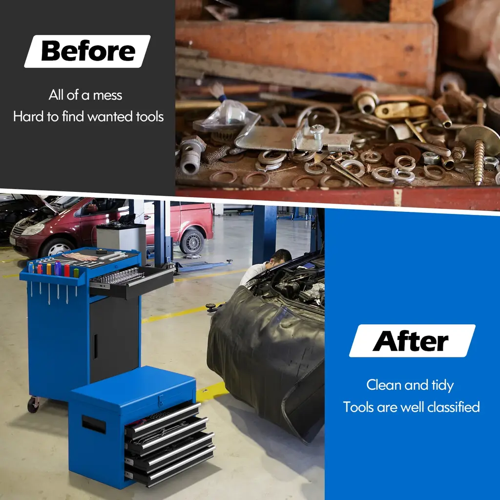 SpecificationsKey Features:● Large Storage Space and Detachable Design: The tool box has five drawers, two trays, a large bottom cabinet and a top box drawer, each drawer carrying 11 lbs. And the total carrying capacity of that is 220.5 lbs. In addition, the whole storage cabinet could be detached into 2 boxes, which can be used separately or together according to your requirement.● High Quality Material: The body of this tool combination box is made of solid and durable steel, and the wheel is made of rubber-plastic synthetic material. High quality material selection and solid workmanship make the box structure strong, wear-resistant and durable. It has a long service life.● Unique Protection Function: This cart is equipped with drawer lock rod, which can be used to prevent the drawer from sliding out and lock the tool box (small lock are not included). In addition, the padding inside drawers and the padding at the top of lower box are EVA, which has good cushioning, seismic, heat insulation and other functions, and can effectively protect tools.● Easy to Move and Stop Steadily: This tool combination box has flexible and ingenious wheel design. This toolkits has four universal wheels which can rotate 360 degrees, and two of them have braking function. The upper case can be completely moved. When transporting, the upper case is stuffed into the lower cabinet. Those designs allow users to move the combo box easily and to stop steadily.● Keep Tidy and Save Time: With this toolkit, your scattered tools can be stored in an orderly manner, which can not only make your workroom neat, but also make it easy for you to find the job you want. More importantly, 5 drawers are equipped with slide rails, which make the drawers pull out smoothly and operate smoothly.