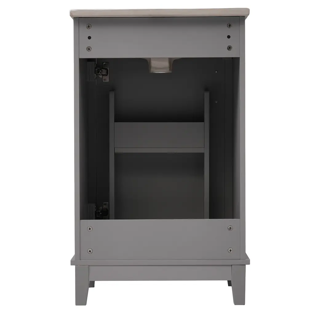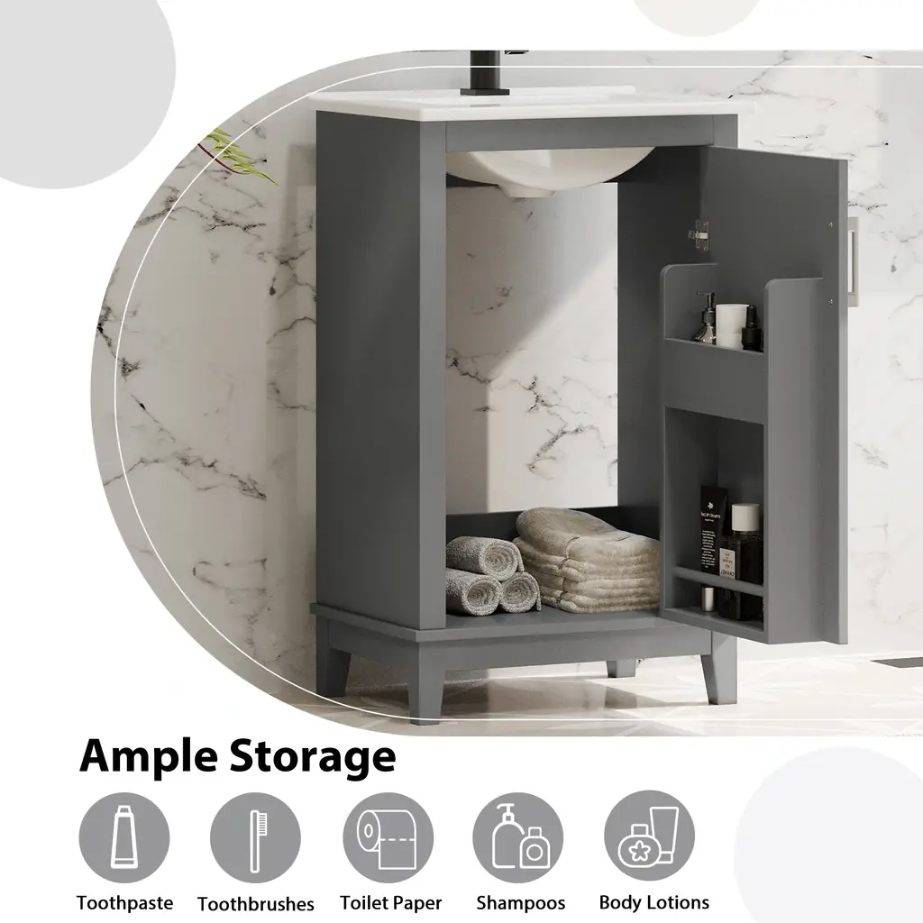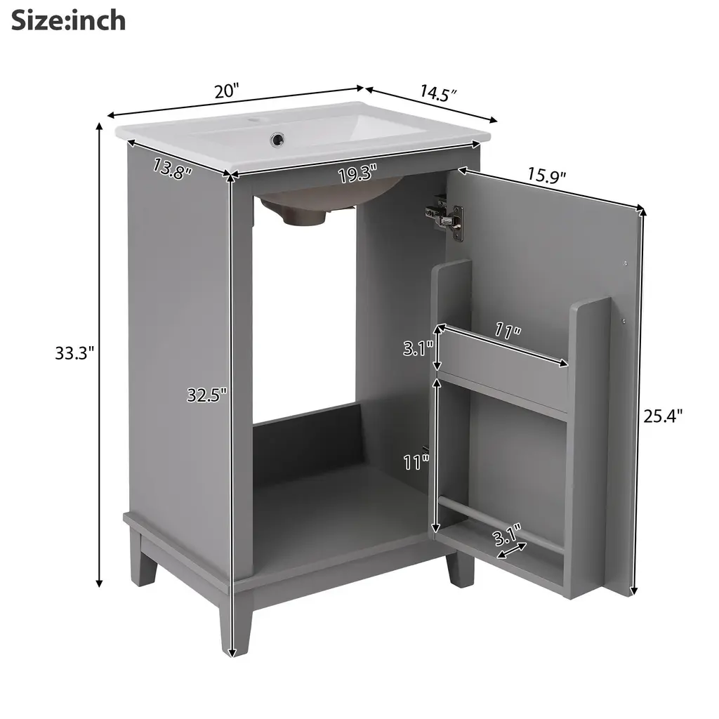 Product FeaturesSpace-Saving Design: Compact dimensions of 20*15.5*33.3 inches make it ideal for small bathrooms.Premium Quality: Crafted with a ceramic integrated basin and a durable combination of solid wood legs and MDF cabinet body.Convenient Features: One pre-drilled hole for easy faucet installation and an overflow prevention system for added safety.Ample Storage: Designed to maximize space efficiency with sufficient storage for all your bathroom essentials.Double Shelves on Doors: The modern vanity cabinet includes double shelves on the doors, providing convenient storage for toothpaste, toothbrushes, and more.Noise-Free Operation: Soft-close doors prevent slamming, ensuring a quiet and peaceful bathroom experience.Contemporary Minimalist Design: Enhance your bathroom's aesthetic with the sleek and modern design of this vanity cabinet.