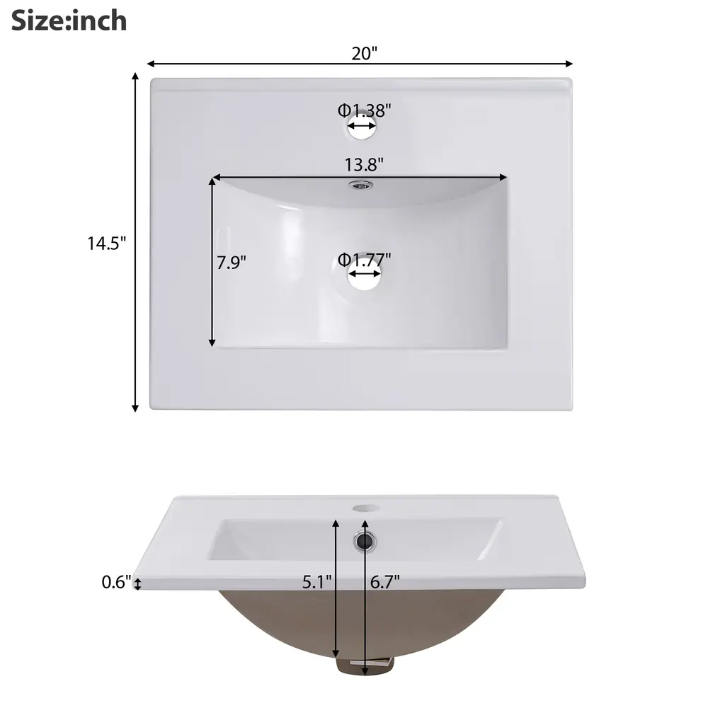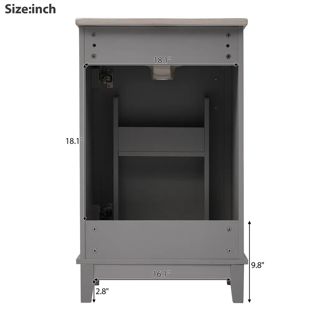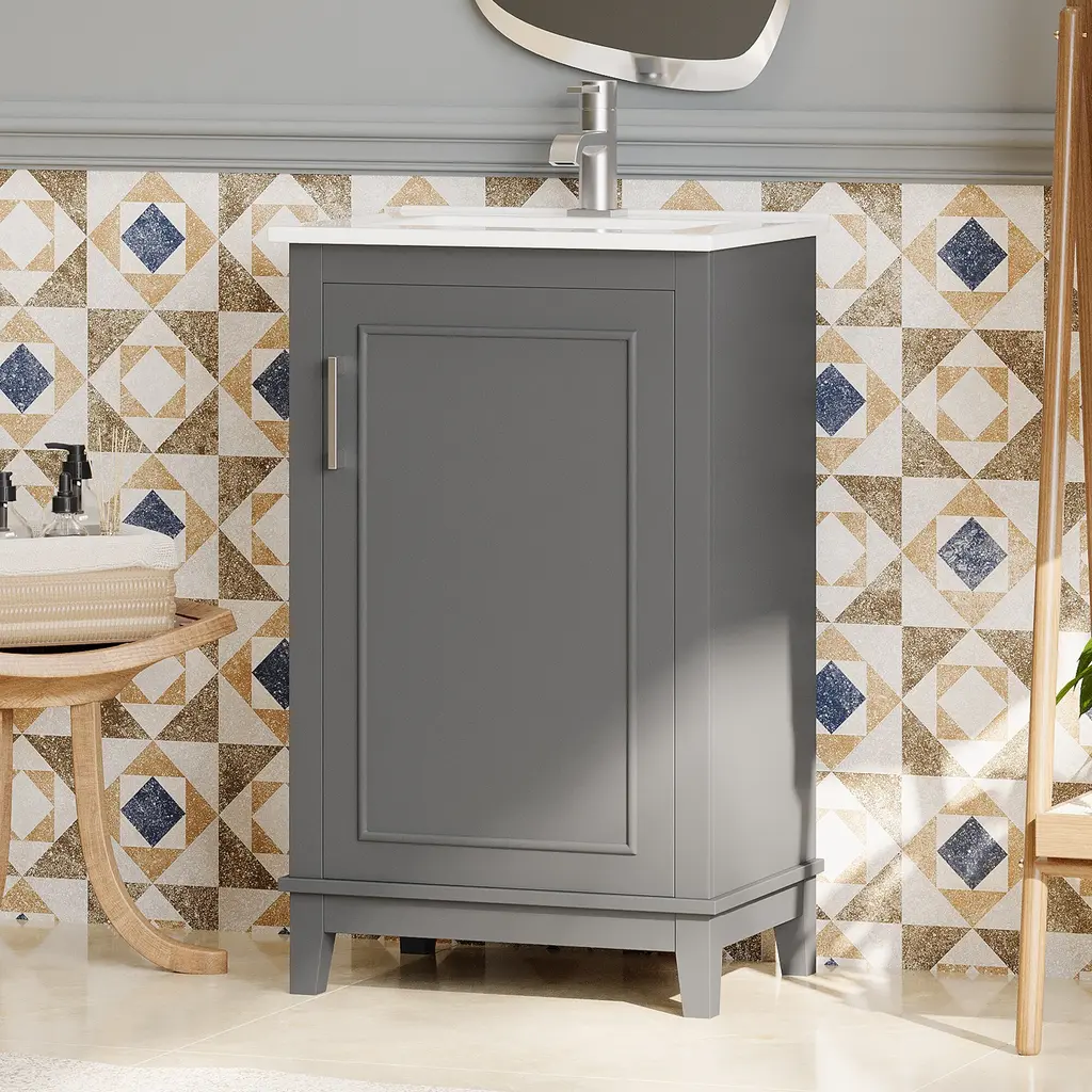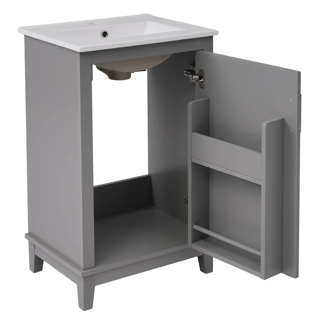 Product FeaturesSpace-Saving Design: Compact dimensions of 20*15.5*33.3 inches make it ideal for small bathrooms.Premium Quality: Crafted with a ceramic integrated basin and a durable combination of solid wood legs and MDF cabinet body.Convenient Features: One pre-drilled hole for easy faucet installation and an overflow prevention system for added safety.Ample Storage: Designed to maximize space efficiency with sufficient storage for all your bathroom essentials.Double Shelves on Doors: The modern vanity cabinet includes double shelves on the doors, providing convenient storage for toothpaste, toothbrushes, and more.Noise-Free Operation: Soft-close doors prevent slamming, ensuring a quiet and peaceful bathroom experience.Contemporary Minimalist Design: Enhance your bathroom's aesthetic with the sleek and modern design of this vanity cabinet.