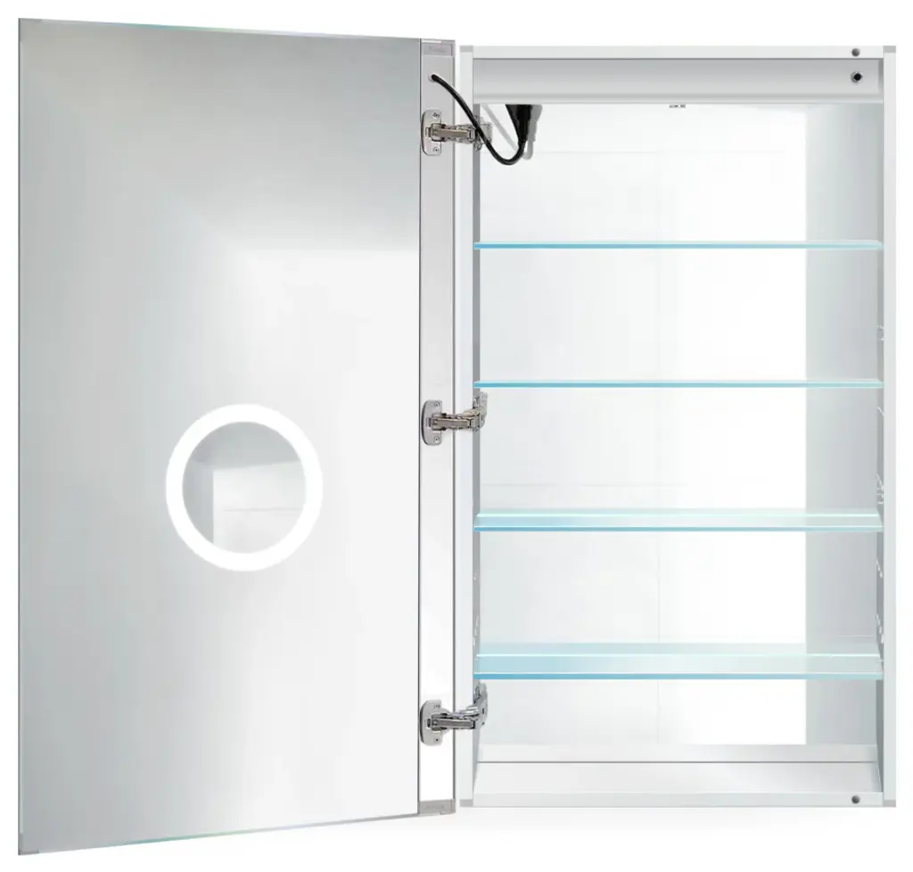 Our LED Medicine Cabinet is a symphony of design elements. We combined our most powerful lighting advancements to create a beautiful storage solution an expression of luxury and function for your bath. From a distance, the LED border produces a striking, modern glow. Up close, enjoy unparalleled light dispersion on the face and body. Effortless to use, a revolutionary touch icon is integrated into the mirror face for seamless on/off toggling and dimming with memory functionality Open the lighted section cabinet to reveal the full suite of amenities. In the mirrored door, a 3x magnified, LED-lit mirror is perfect for detailed makeup application. The mirrored interior is illuminated automatically for a luxurious touch. Our wide-angle hinges provide freedom of motion and panorama. The 2+2 smart outlet contains two traditional outlets and two USB interfaces to keep beauty tools, as well as a smartphone or tablet, close at hand. We ensure reliable optical clarity with active defogging technology. This LED Medicine Cabinet is limited only by your imagination.