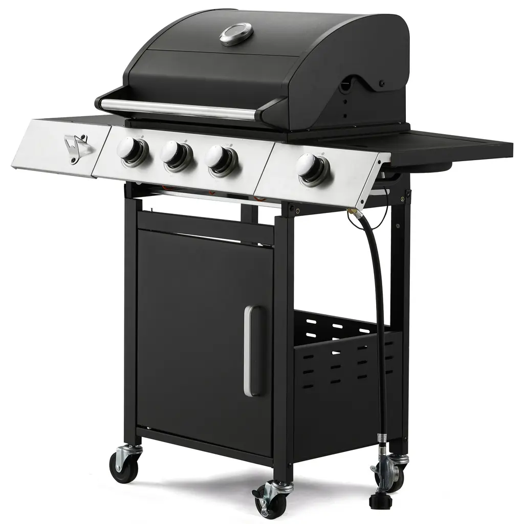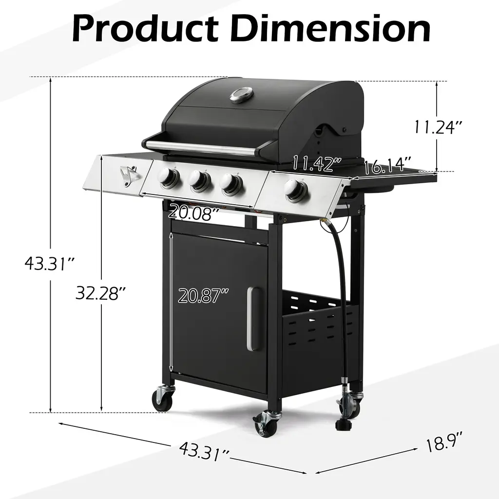 Color:Black→3+1BunnerWhite→4+1BunnerSliver→6+1BunnerThe perfect solution for outdoor BBQ enthusiasts! This 3-burner propane gas grill with a side burner delivers 36,000 BTUs of heat and provides 395 square inches of total cooking space. The primary cooking area measures 299.33 square inches, complemented by a 95.72-square-inch warming rack, giving you plenty of room to prepare multiple dishes simultaneously. Durable cast iron grates ensure consistent heat distribution for flawless searing every time.Designed with convenience in mind, this portable camping grill includes a practical side table for food prep and a spacious storage cabinet to keep tools and accessories organized. The side burner adds flexibility, offering additional space for preparing side dishes. Features like the electronic ignition system and an open cart design allow quick access to grilling tools, while the 4 lockable universal wheels ensure smooth and effortless mobility across your patio or backyard.Enjoy a spacious cooking experience with 299.33 square inches of primary grilling space on durable cast iron grates, paired with an additional 95.72 square inches of stainless steel warming rack. This versatile barbecue grill offers a combined total of 395 square inches of cooking surface, making it ideal for hosting family get-togethers or weekend gatherings with friends. Designed with premium cast iron grates, this propane gas grill offers exceptional durability and effortless cleaning, with resistance to rust and wear. The stainless steel burners and flame tamers ensure even heat distribution, minimizing hot spots and maximizing heat retention for perfectly cooked, flavorful meals every time. This gas grill features three primary burners, each delivering 8,000 BTU, along with a side burner providing 12,000 BTU, totaling 36,000 BTU of cooking power to handle all your grilling tasks. The piezoelectric ignition system ensures an easy and quick start with just a turn of the knob. Whether you're grilling at high heat or cooking low and slow, these robust burners are designed to give you consistently excellent results.This outdoor grill comes with a practical side table for food preparation and tool organization, ensuring a neat and efficient grilling space. Below, the large storage cabinet offers plenty of room for your gas tank and grilling tools. For added convenience, a built-in bottle opener is located on the front, so you can easily enjoy a refreshing drink while grilling outdoors. Cleaning up after grilling is a breeze with the large grease tray, designed to slide out smoothly for efficient handling of grease and drippings. This practical feature makes the cleanup process simple, helping you keep your grilling area spotless with minimal effort. This BBQ grill features two lockable wheels and two non-locking wheels, making it simple to move to your preferred spot. You can easily roll the grill into place without lifting, and once positioned, secure the wheels with the locks for enhanced stability.