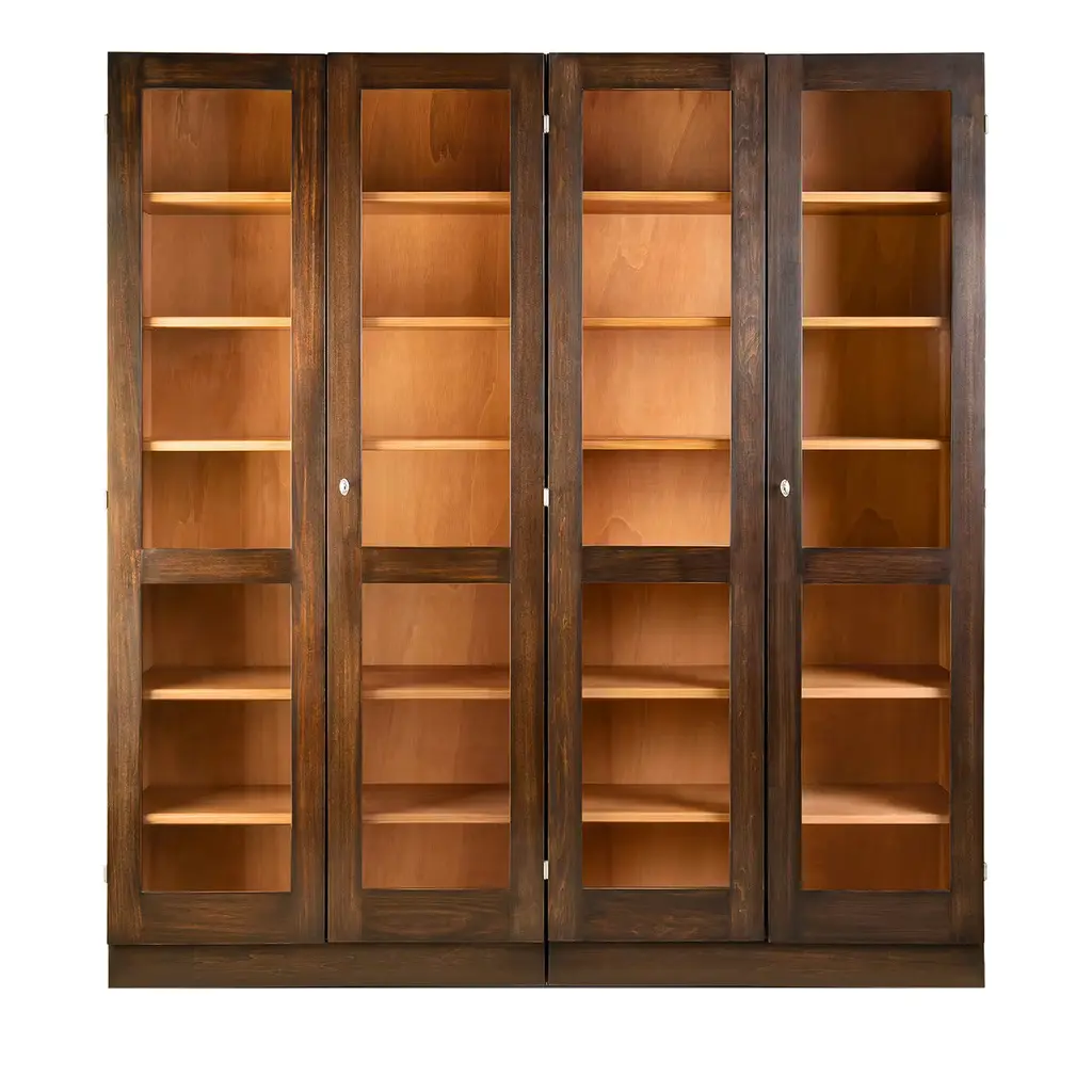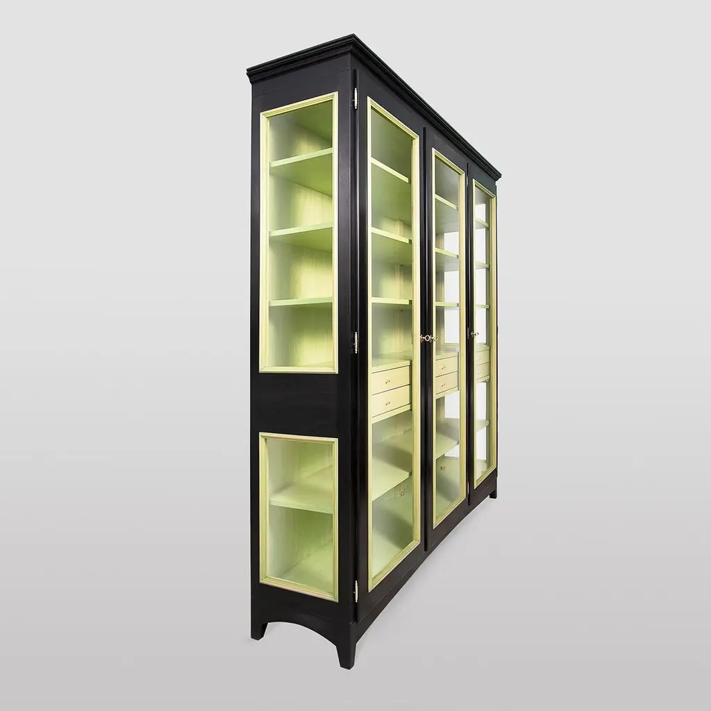 A showcase of well-balanced proportions and exquisite craftsmanship, this display cabinet has a solid lime wood frame with three glass doors equipped with double hook closing (upper and lower), each opening to reveal four shelves and two drawers. The contrasting finish - black outside and lime green inside - is made with ecological water-based non-toxic paints and a final beeswax coating is applied by hand to give a matte satin effect. Requires assembly (easy-to-follow instruction leaflet included). Customizable in other dimensions, wood essence, and finishes upon request.