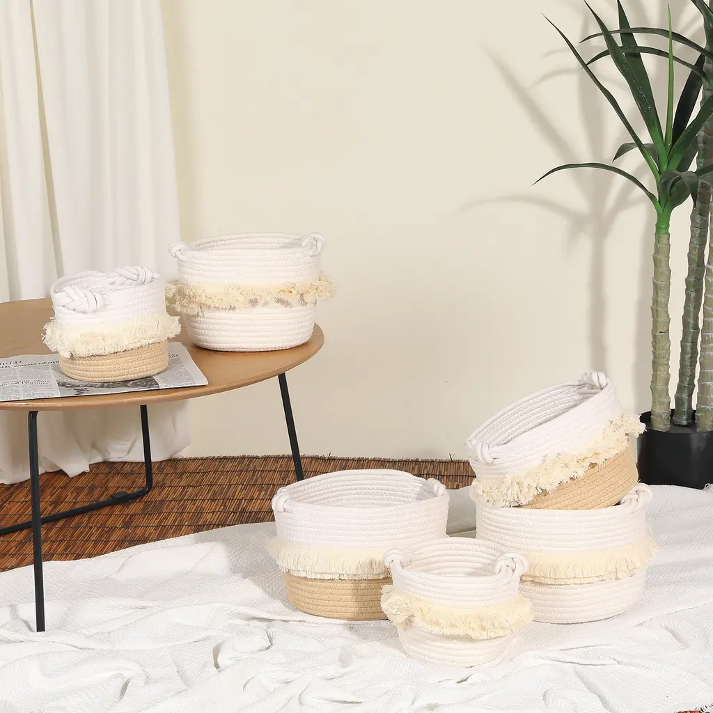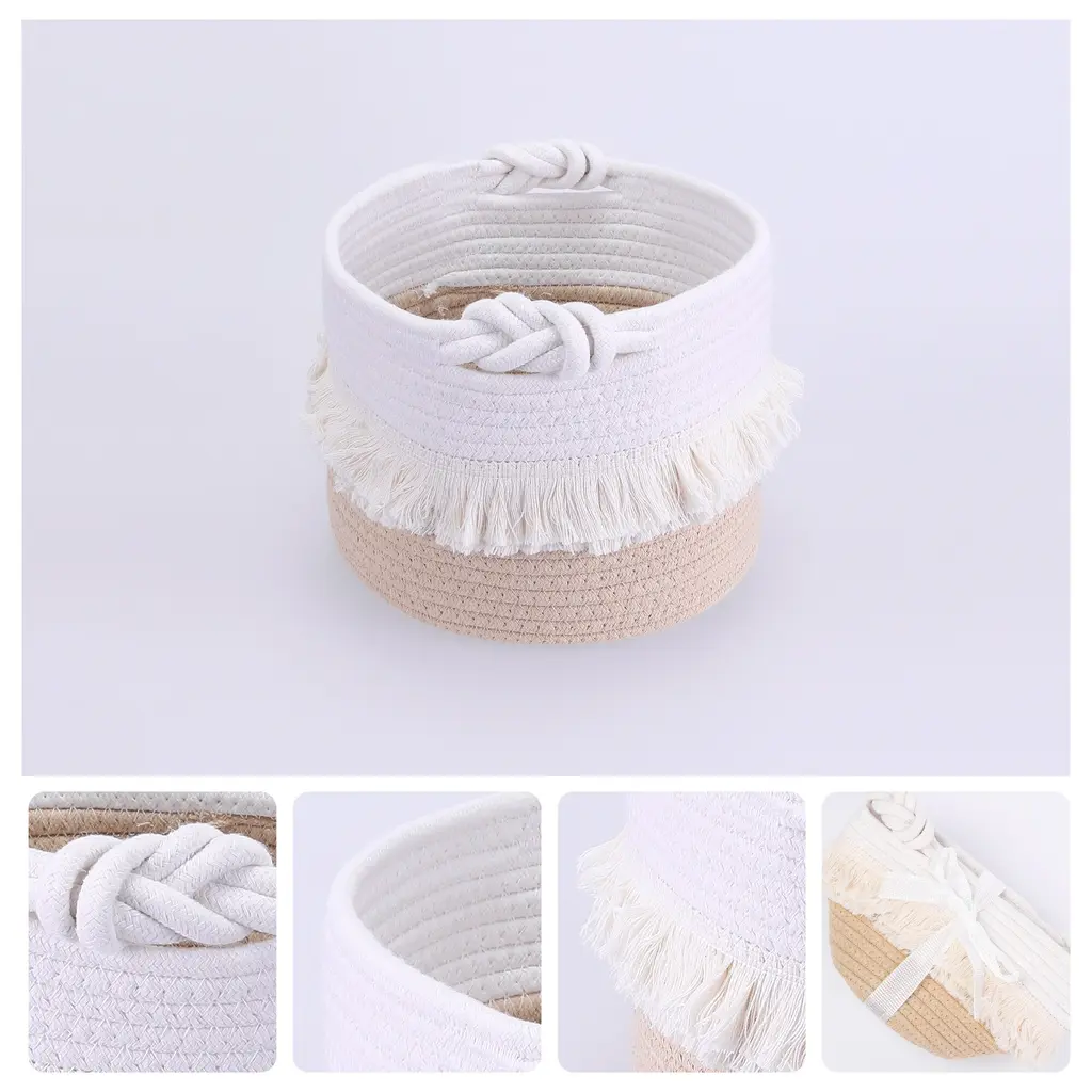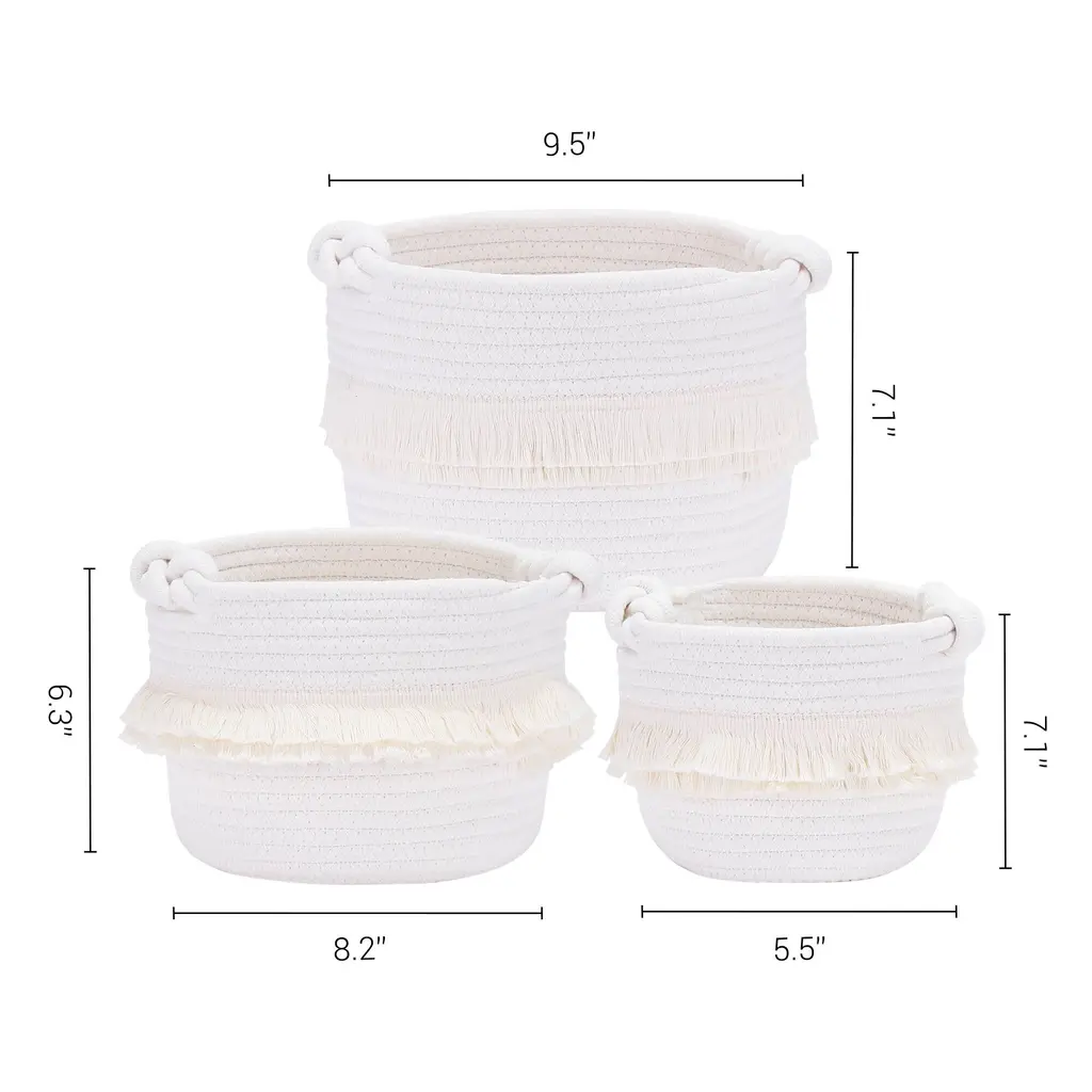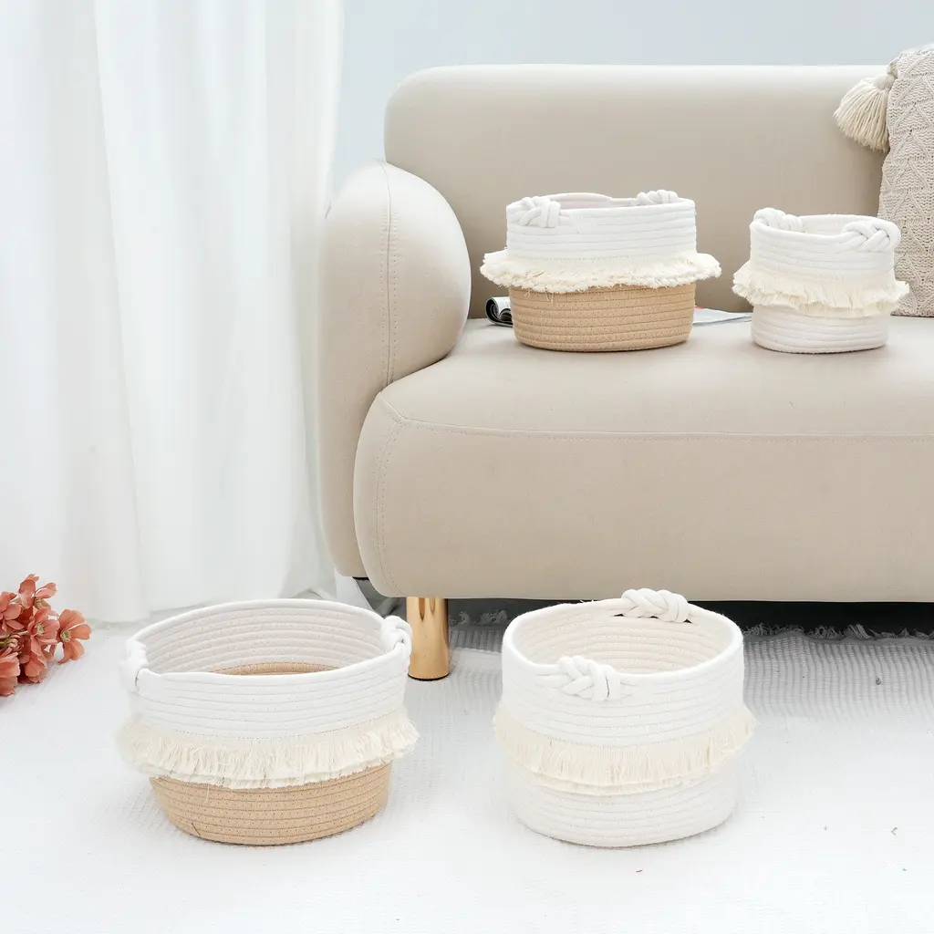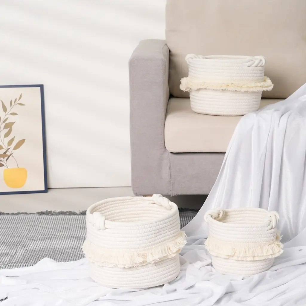 Premium Material: Our organization baskets set are meticulously handcrafted from odorless cotton rope. They are designed with no sharp corners. The widened handles and chic appearance make these baskets a fashionable and functional addition to any decorEasy Shaping: Upon receiving your rope basket, please remove it from the packaging and fill it with items such as clothes or dolls to help it regain its shape. For quicker shaping, consider using a steam ironCompact Size: Our closet woven basket is suitable for living room TV cabinets, shelves, closets office tables, and room cube bookshelves. Breathable cotton rope material to your things from dust and dumping. In addtion, the storage cube bin also can be a shoe basket for entrywayGreat Gift: This basket storage perfect size to fit everything and very aesthetic. Worked perfectly for making a get-well basket for a friend. Our woven storage basket is a ideal gift for Easter, Christmas, Thanksgiving, Mother's Day, Father's Day, Valentine's Day, or girl's birthdayMultiple Use: This large basket is great for putting blankets, shoes, clothes, towels, decorative pillows, hats, scarves, magazines, headset wire, remote control, CD, flowers and more home supplies by the front door. Fits on a bedside table, closet shelf, bookshelf, desk, floor, etcOur basket for bathroom, and designed with jute string and portable handles on the base. Minimalistic combined with a rustic style makes the whole flower basket simple and elegant. Handles design, easy to move and take away, free awesome practical adorable jute storage bin for daily use.These cotton rope baskets are designed to fit perfectly on shelves, closets, and even under beds, making them an ideal solution for organizing your home or office.