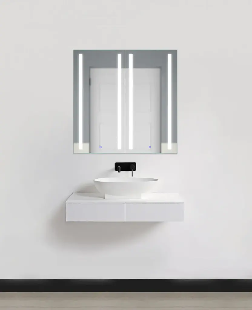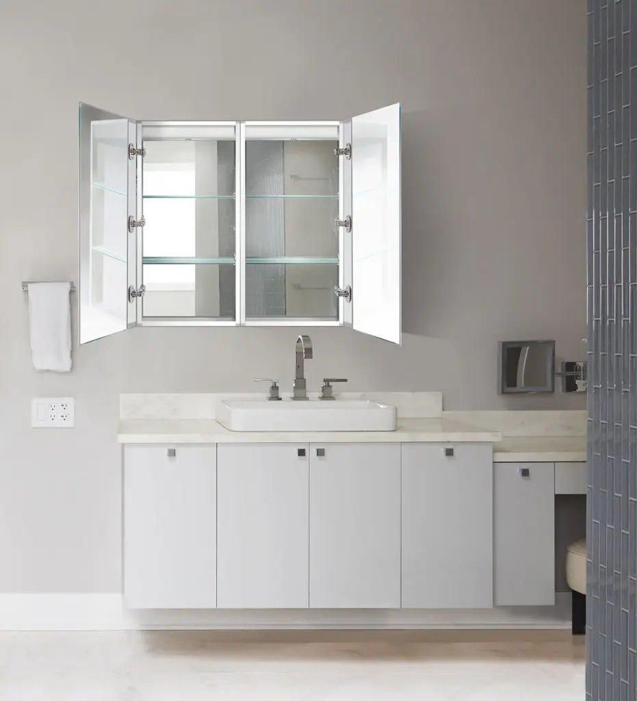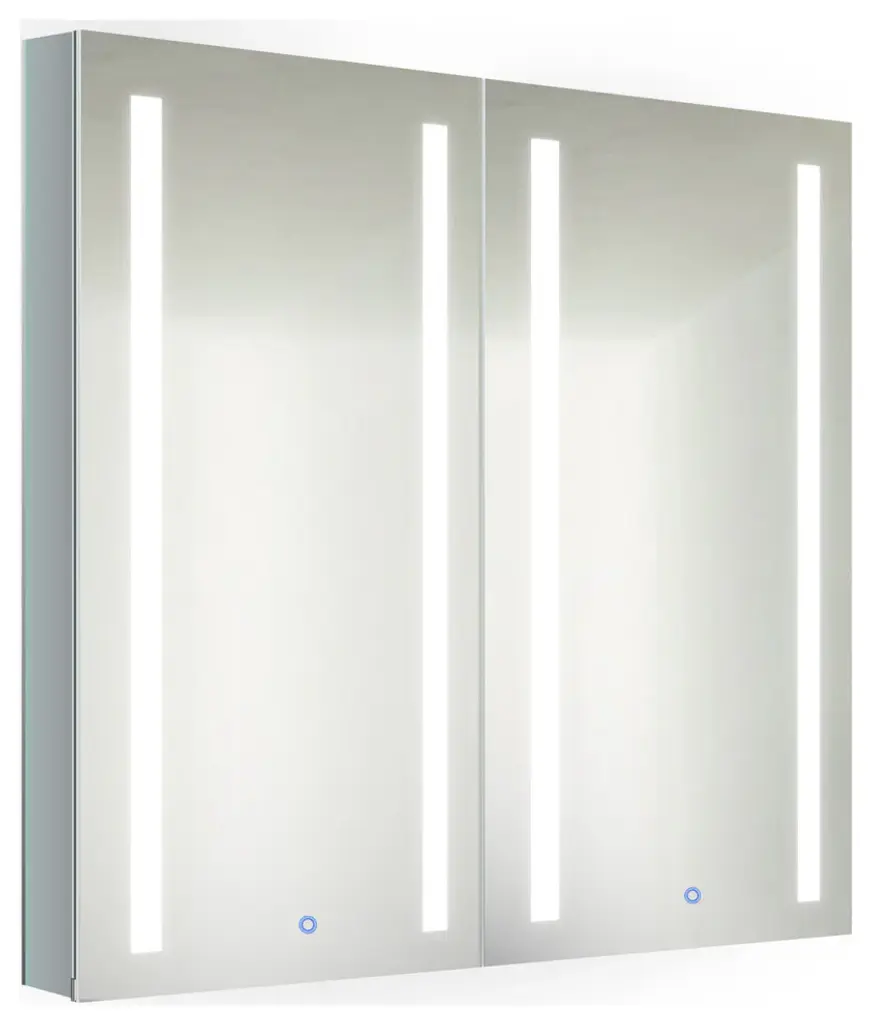 Our LED Medicine Cabinet is a symphony of design elements. We combined our most powerful lighting advancements to create a beautiful storage solution an expression of luxury and function for your bath. From a distance, the LED produces a striking, modern glow. Up close, enjoy unparalleled light dispersion on the face and body. Effortless to use, a revolutionary touch icon is integrated into the mirror face for seamless on/off toggling and dimming with memory functionality . Open the cabinet to reveal the full suite of amenities. , LED-lit mirror is perfect for detailed makeup application. The mirrored interior is illuminated automatically for a luxurious touch. Our wide-angle hinges provide freedom of motion and panorama. We ensure reliable optical clarity with active defogging technology. This LED Medicine Cabinet is limited only by your imagination.Can be mounted both Surface or RecessUses Austrian 170 Degree Blum HardwareDimmer & Defogger included