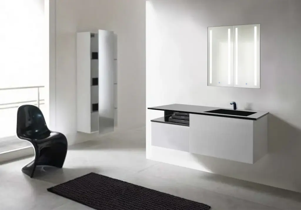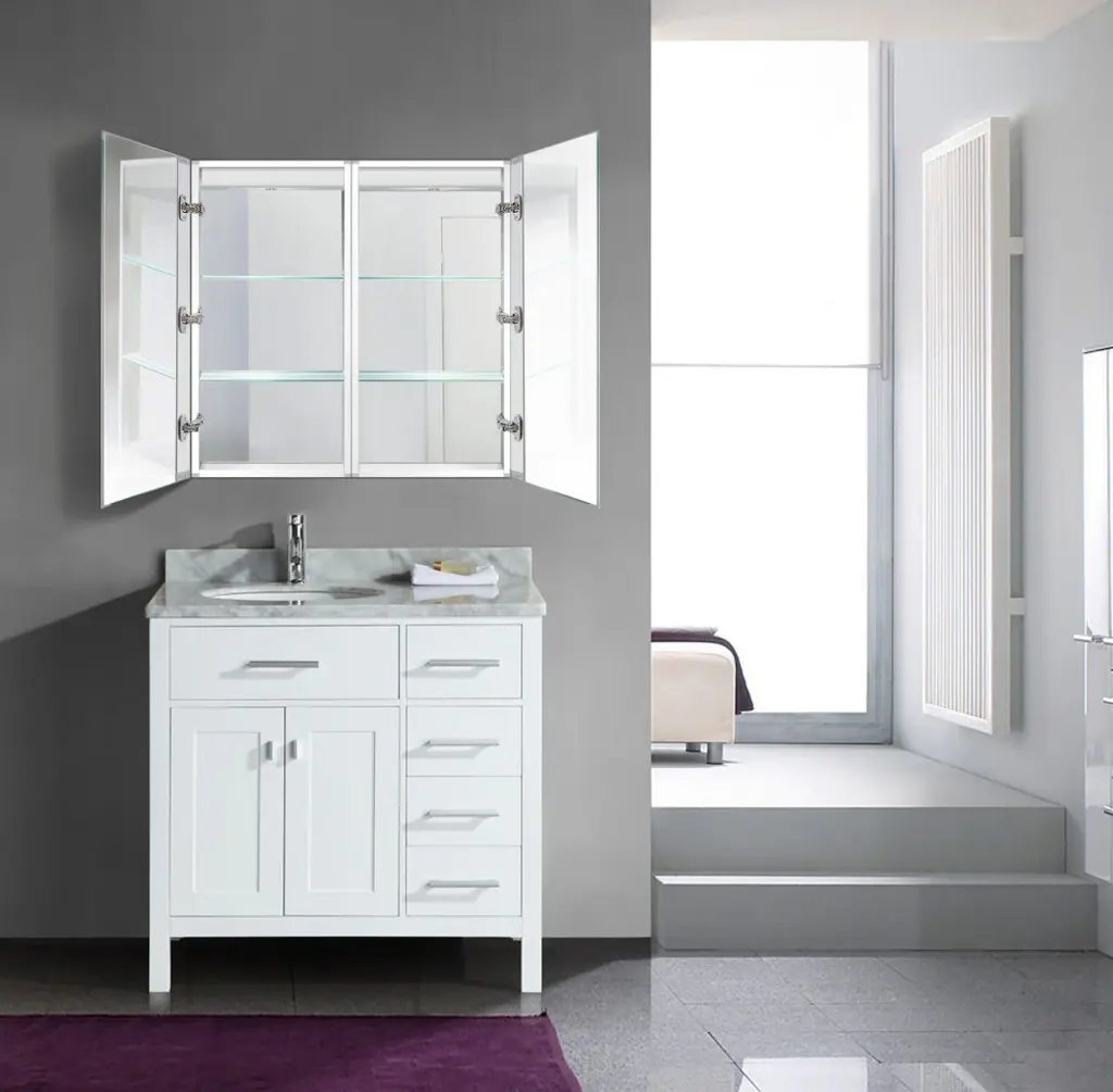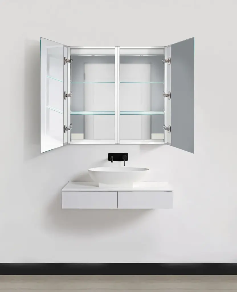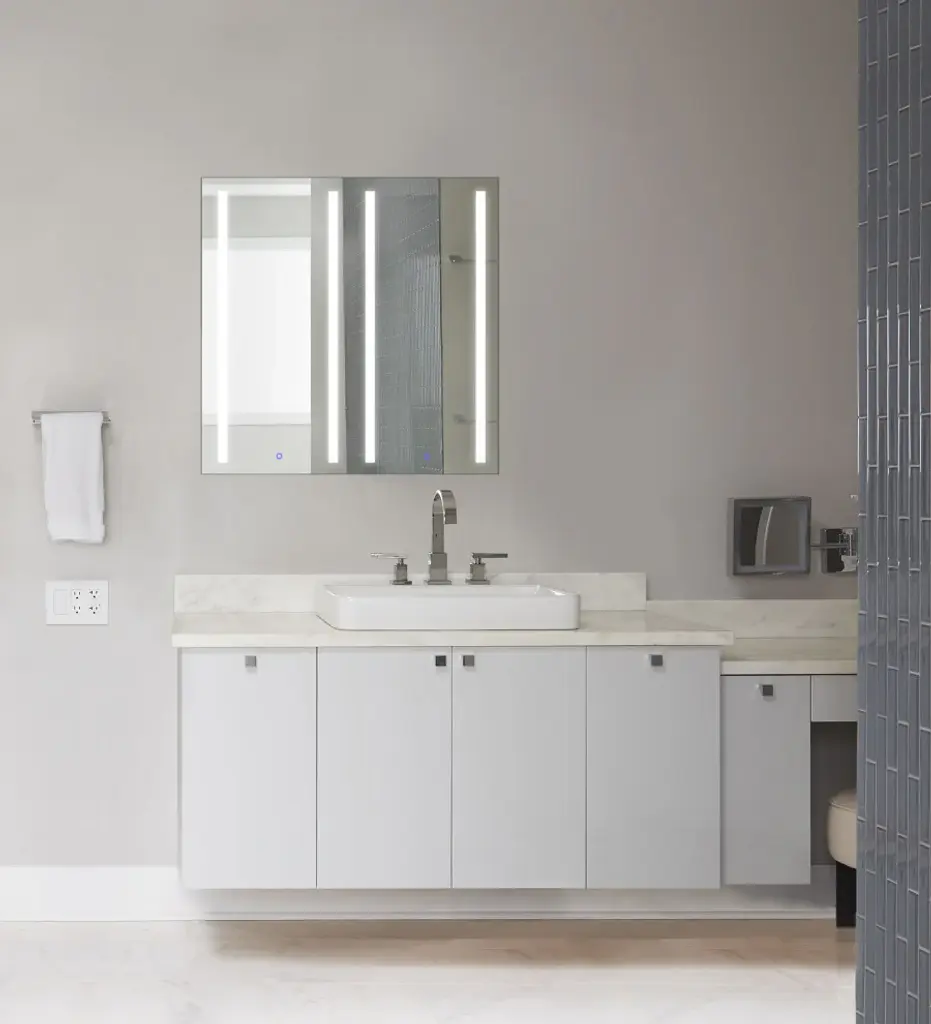 Our LED Medicine Cabinet is a symphony of design elements. We combined our most powerful lighting advancements to create a beautiful storage solution an expression of luxury and function for your bath. From a distance, the LED produces a striking, modern glow. Up close, enjoy unparalleled light dispersion on the face and body. Effortless to use, a revolutionary touch icon is integrated into the mirror face for seamless on/off toggling and dimming with memory functionality . Open the cabinet to reveal the full suite of amenities. , LED-lit mirror is perfect for detailed makeup application. The mirrored interior is illuminated automatically for a luxurious touch. Our wide-angle hinges provide freedom of motion and panorama. We ensure reliable optical clarity with active defogging technology. This LED Medicine Cabinet is limited only by your imagination.Can be mounted both Surface or RecessUses Austrian 170 Degree Blum HardwareDimmer & Defogger included