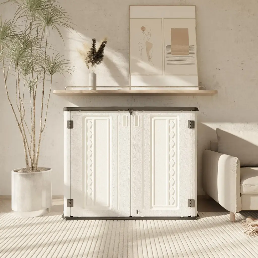 Transform your outdoor space with this sleek black storage cabinet featuring a sophisticated geometric pattern on its doors. The cabinet's three-shelf design offers ample storage space for garden supplies, tools, pool accessories, or patio essentials. Built to withstand outdoor conditions, this cabinet combines functionality with style through its modern aesthetic and practical features. The sturdy construction includes adjustable shelves for customizable organization, while the double doors provide easy access to all your stored items. Perfect for patios, decks, or garden areas, this cabinet helps keep your outdoor living space tidy and organized. The contemporary design with its textured door pattern adds visual interest while complementing various outdoor d¨¦cor styles. Elevated feet keep contents away from ground moisture, and the roomy interior accommodates everything from landscaping supplies to entertaining essentials. This versatile storage solution measures tall enough to store larger items while maintaining a compact footprint that won't overwhelm your outdoor space.