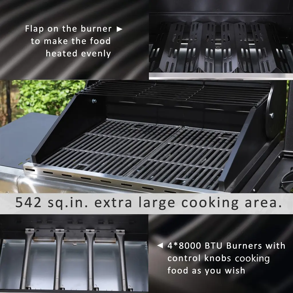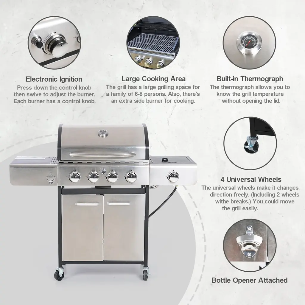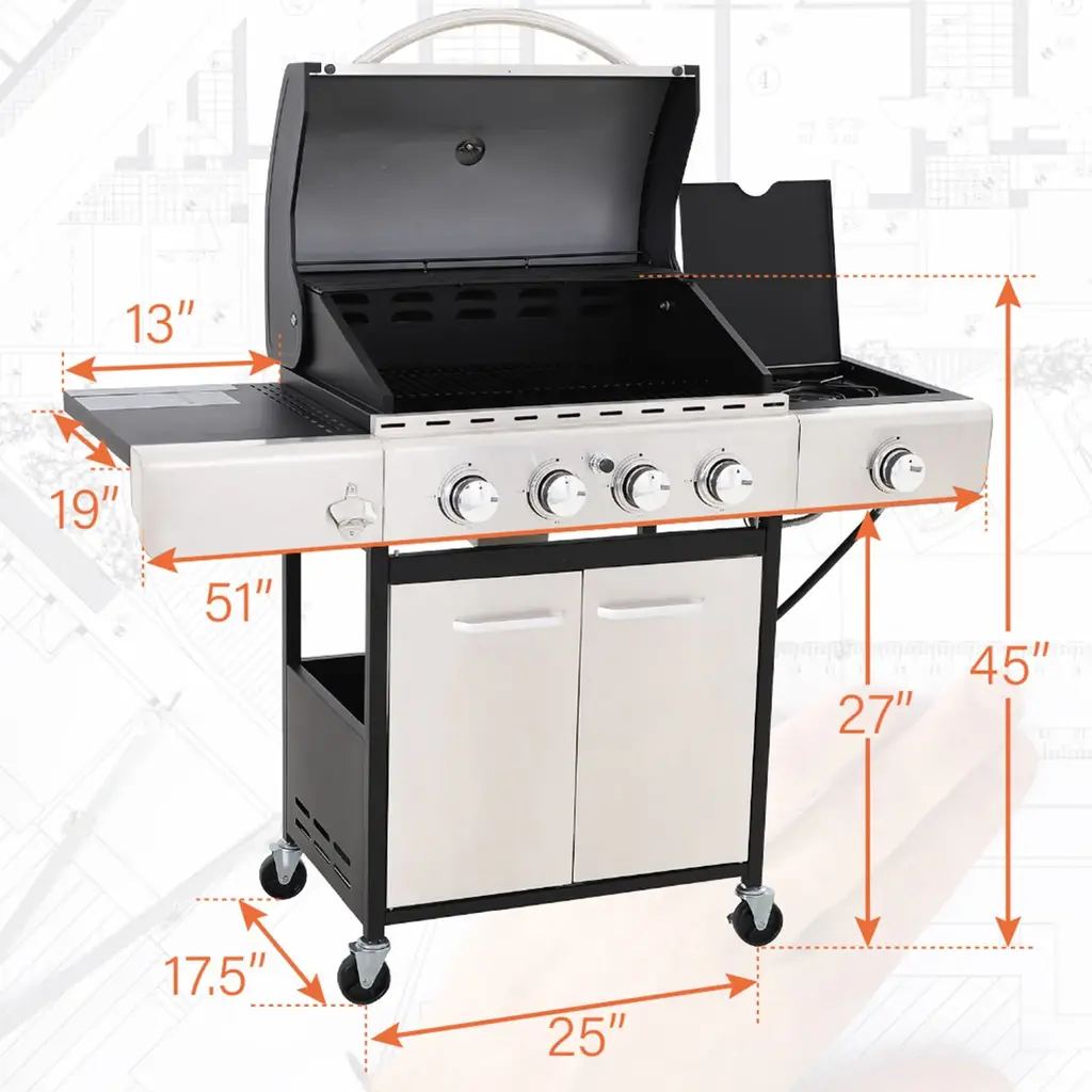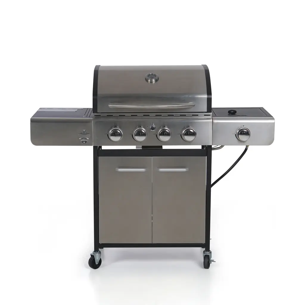 4-Burner Propane Gas Grill With Side Burner & Porcelain Cast Iron Grates, 42,000 Btu Stainless Steel - Silver