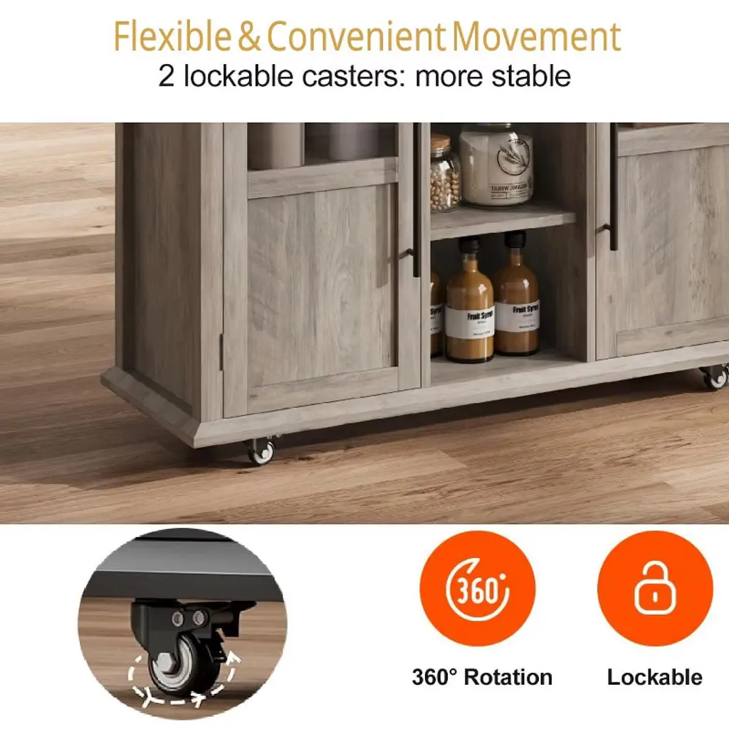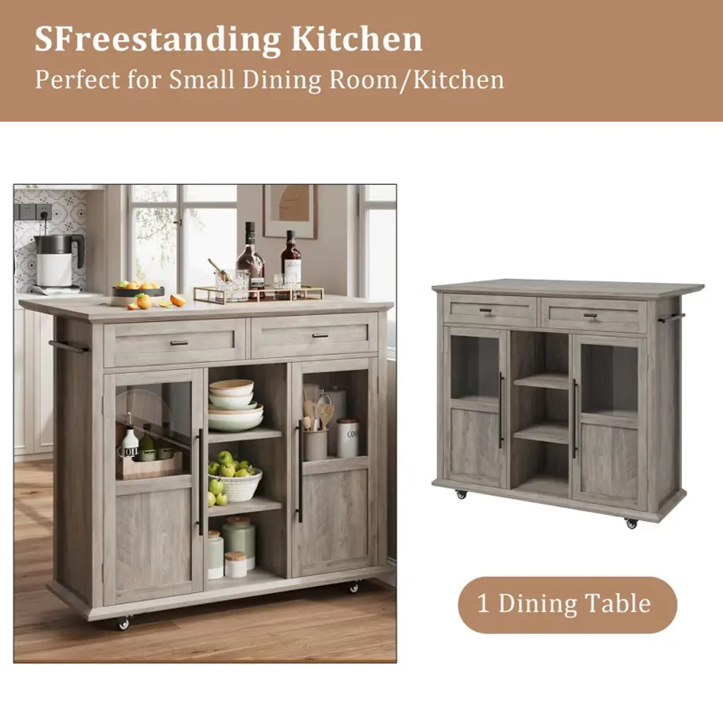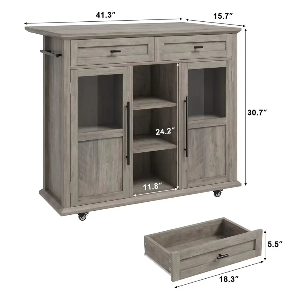 41" Mobile Farmhouse Storage Island,Rolling Kitchen Island with Drop Leaf - with 2 Glass Door Cabinets, 3 Open Shelves & 2 Drawers for Dining Room