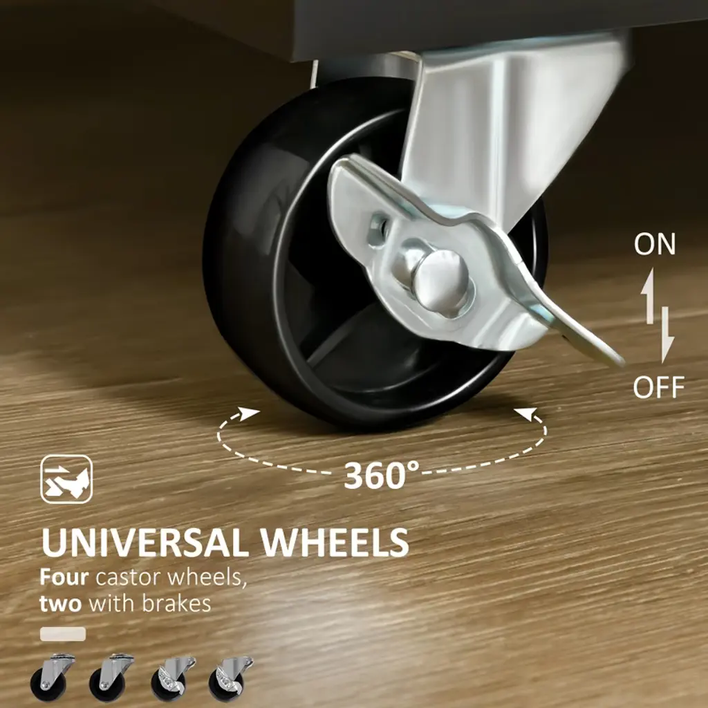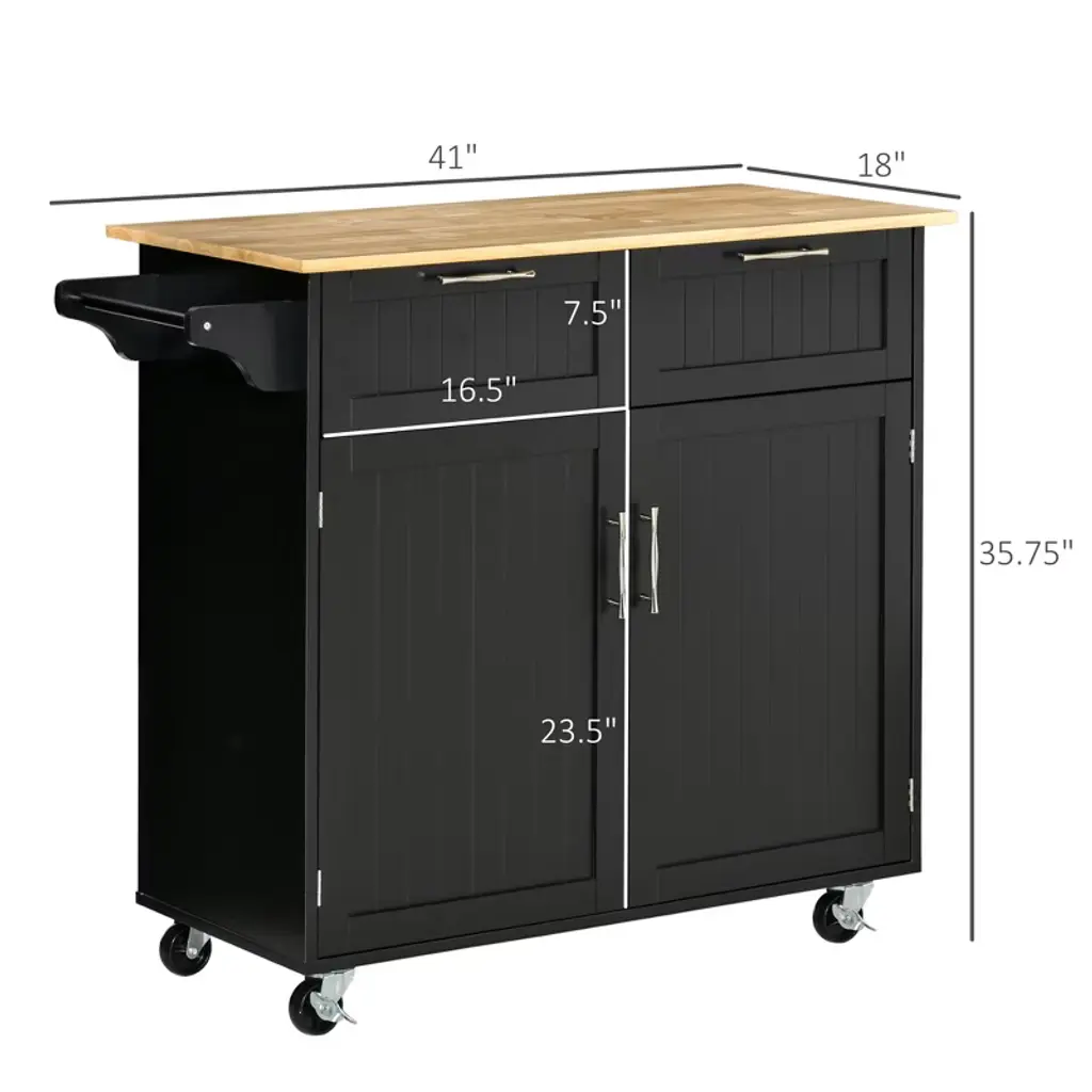 Ample Storage: This rolling kitchen island has two drawers, an enclosed cabinet and towel rack to offer a multifunctional storage solution when you have limited space in your kitchen.Adjustable Shelving: This kitchen cart features two interior adjustable shelves. You can easily adjust the height to suit your needs as the shelves can be locked in place at three fixed levels.Easy Mobility: With four smooth-rolling casters, you can quickly move the kitchen island on wheels from room to room. Two casters are equipped with brakes to keep the coffee cart station securely in place.Finely Crafted: Made with a solid rubberwood tabletop and fitted with MDF side panels, the smooth surface of this microwave cart is easy to wipe clean when there are spills or messes.Butcher Block Kitchen Cart Dimensions: 41" W x 18" D x 35.75" H, Weight Capacity: 110 lbs. (Overall), 11 lbs. (Drawer), 17.6 lbs. (Shelf), 44 lbs. (Top)