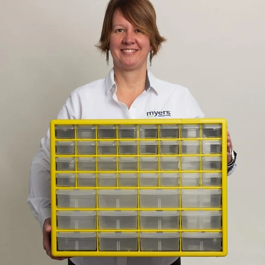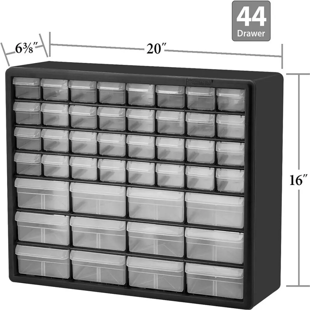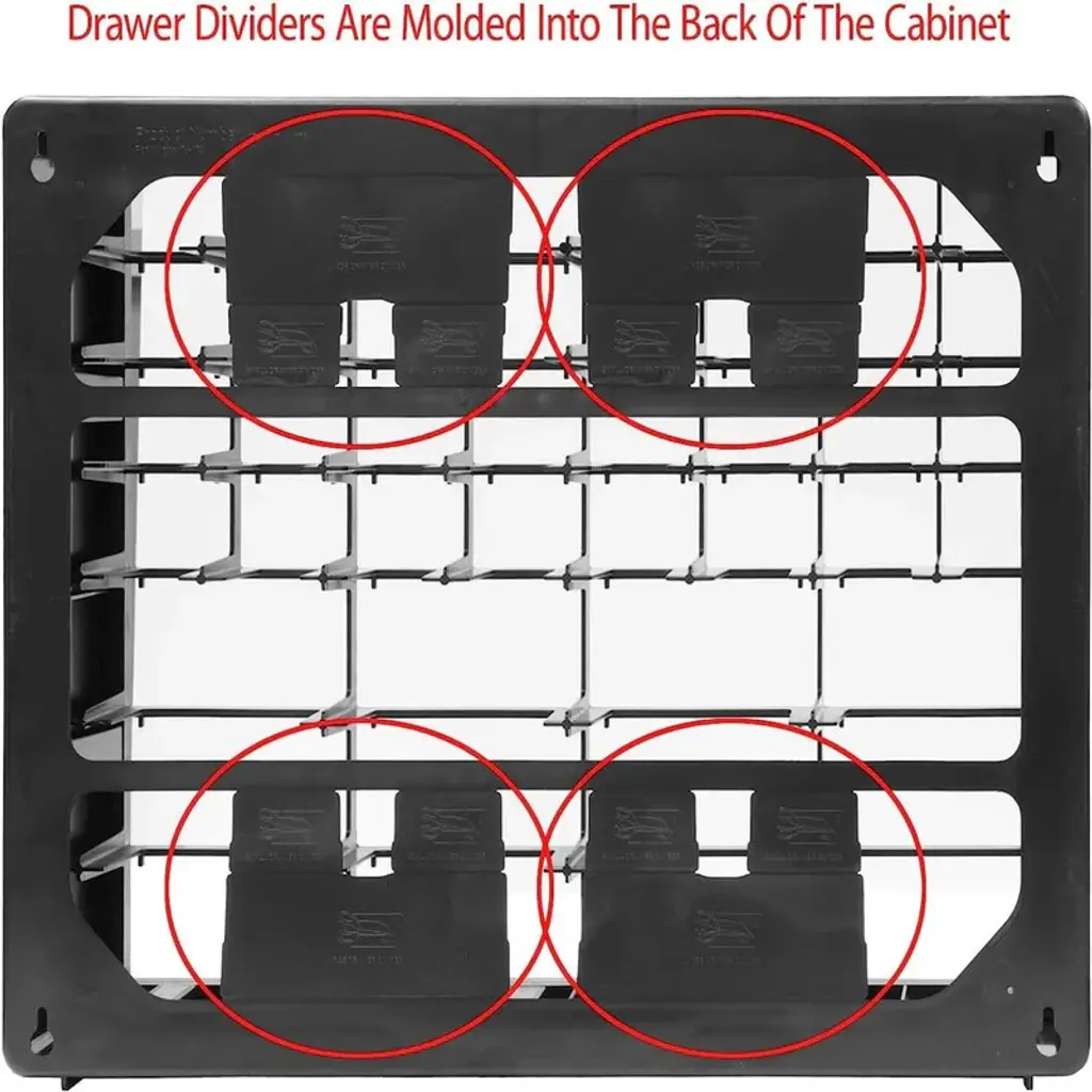 high impact polystyrene plastic frame and 44 drawers. Large Drawer Size-6 x 4-9/16 x 2-3/16 inches. Small Drawer Size-6 x 2-7/32 x 1-9/16 inches STACK OR WALL MOUNT Cabinets stack securely and can also be wall mounted using keyhole slots molded into the back of the cabinet. GREAT FOR- Storing and organizing classroom or office supplies, crafts, bead organizer, art supply storage, or sewing supplies, hardware, lego and small toy storage, fishing gear and more DIVIDABLE DRAWERS 8 small drawer dividers, 4 large drawer dividers included and come molded into the back of the cabinet, finger grip drawer pulls provide easy access and rear stop tabs prevent contents from spilling