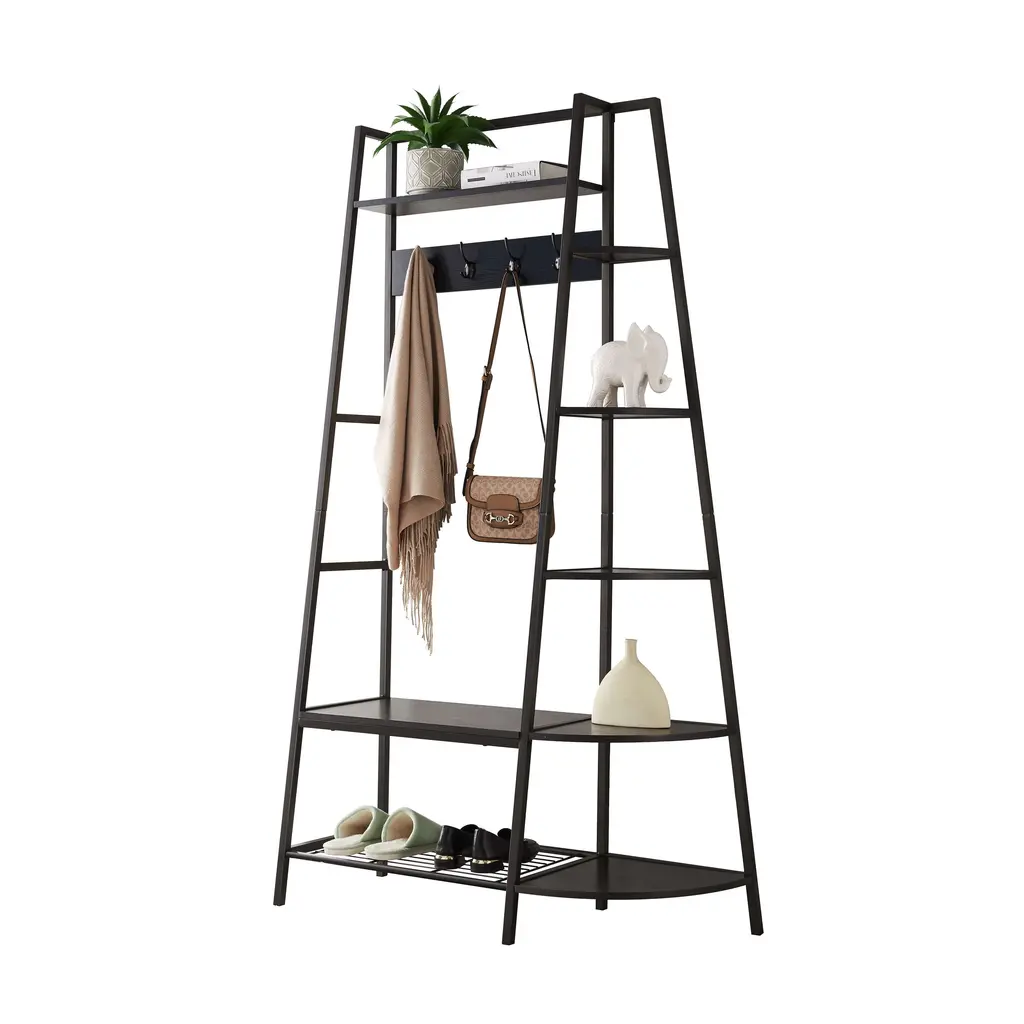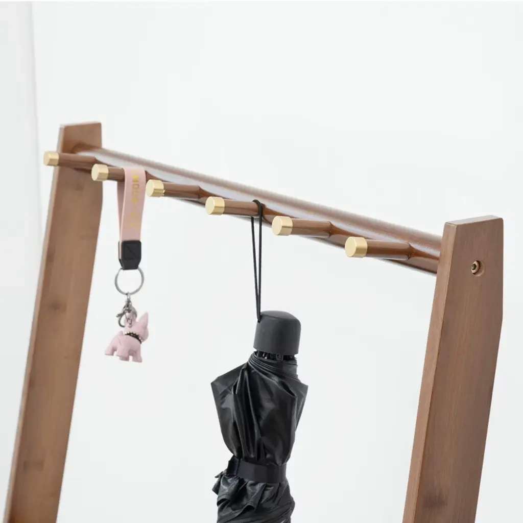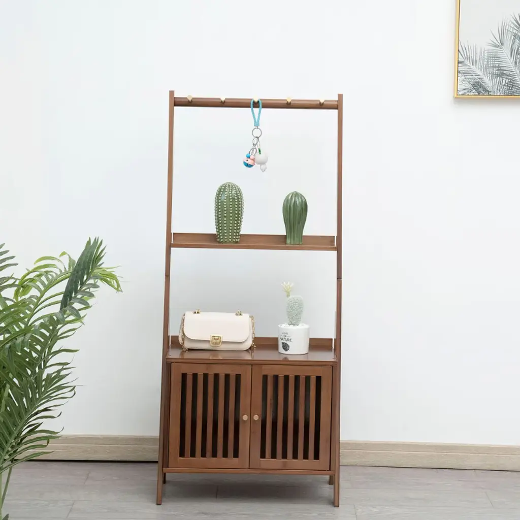 This shelf is made of high quality bamboo wood, high hardness, stronger load bearing and more stable. The surface is polished smooth and flat, not solid, effectively preventing items from falling. The overall triangular stabilizing structure prevents tipping and better protects you and your family's safety. The top with five elongated hooks, you can hang multiple keys, folded umbrellas or other items. The bottom comes with a double-door storage cabinet with a ventilated door design, which is dustproof as well as ventilated to prevent moisture and odor from arising. The top of the cabinet and a layer of partition, open design, can display your ornaments in all directions, showing your unique fashion taste. The original wood color style perfectly fits various styles of home decorating environment, with a wide range of practicality, bedrooms, living rooms, bathrooms, kitchens, flower rooms, all suitable to enhance the fashionable atmosphere of the home.