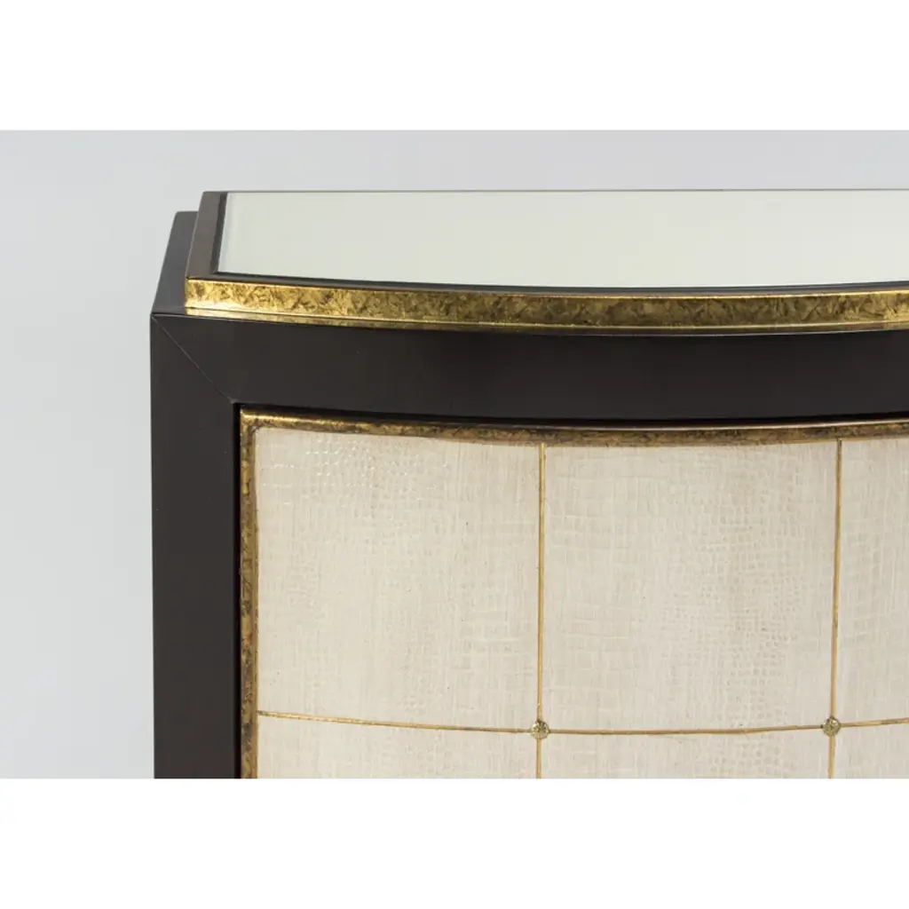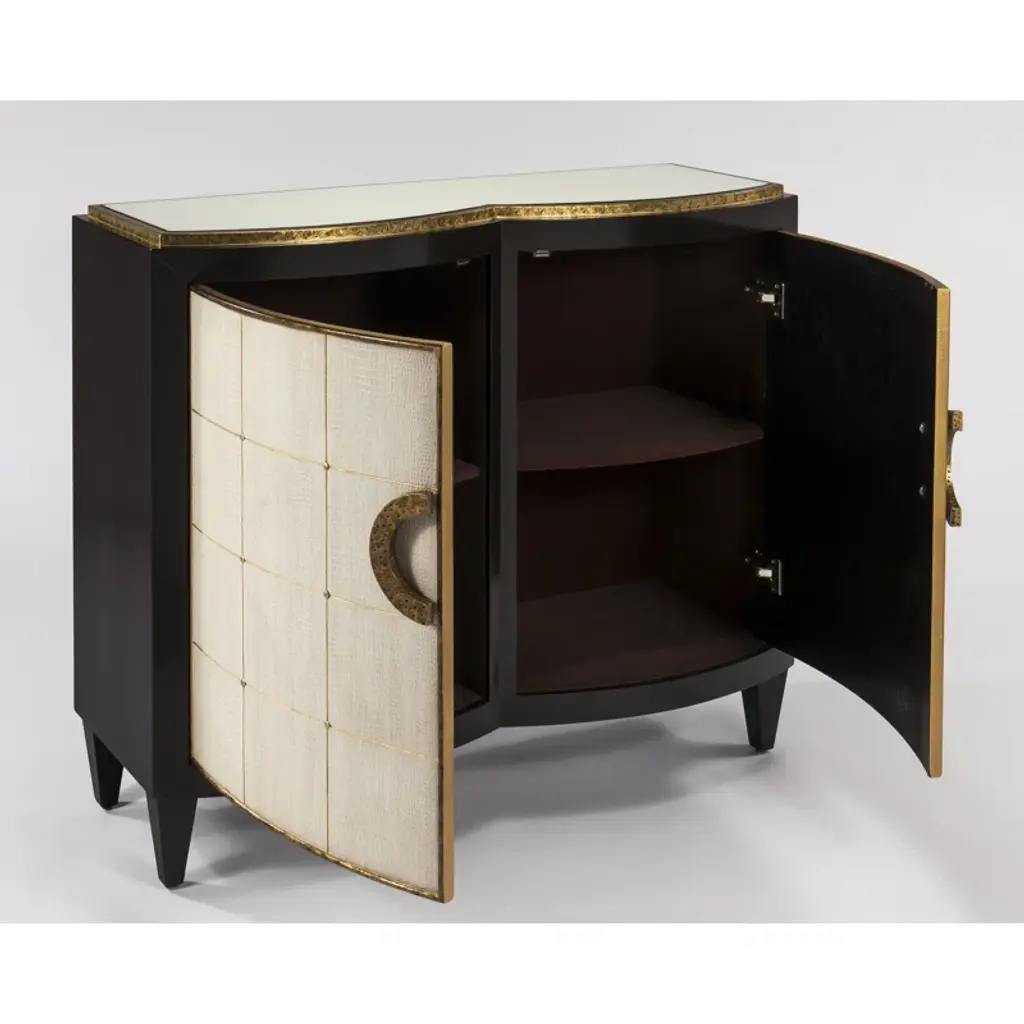 The sleekly transitional design of this cabinet allows it to transcend style categories, and blend easily into any home. Expertly handcrafted, the predominant finish is the deep espresso that adorns the sides, finished back, front trim, and tapered legs. Two doors are fronted with faux vanilla leather in a simple repeating pattern of squares trimmed in delicate gold. Coordinating antiqued gold leaf surrounds the door panels, and embellishes the curved door pulls. The doors open smoothly to reveal ample inner storage and are fitted with soft-closing hinges, fully finished, with one shelf.