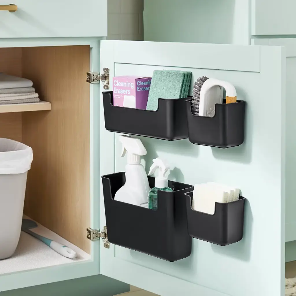 Add extra storage space to your kitchen cabinet, under the sink or anywhere else with the 4-Pack Organizer Bins with Adhesive from Brightroom™. This pack of four organizer bins comes with varying sizes to help you store cleaning supplies, spare linens and much more. Made of plastic, the bins have an open front for easy access and can be attached anywhere thanks to the adhesive.Brightroom™: See your space in a new light.