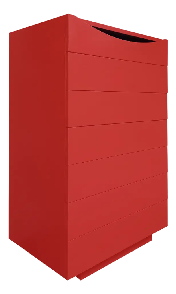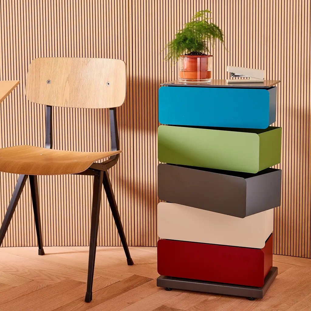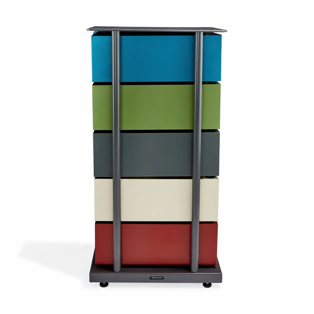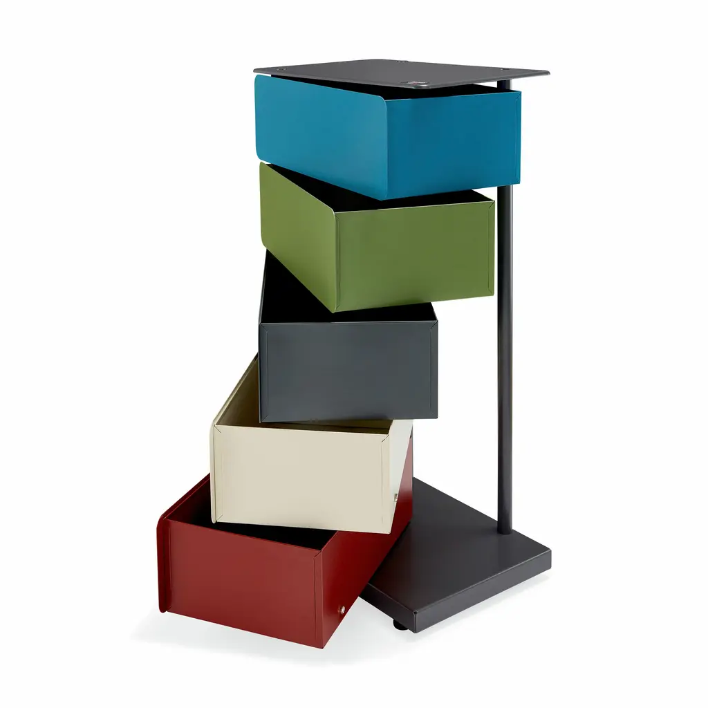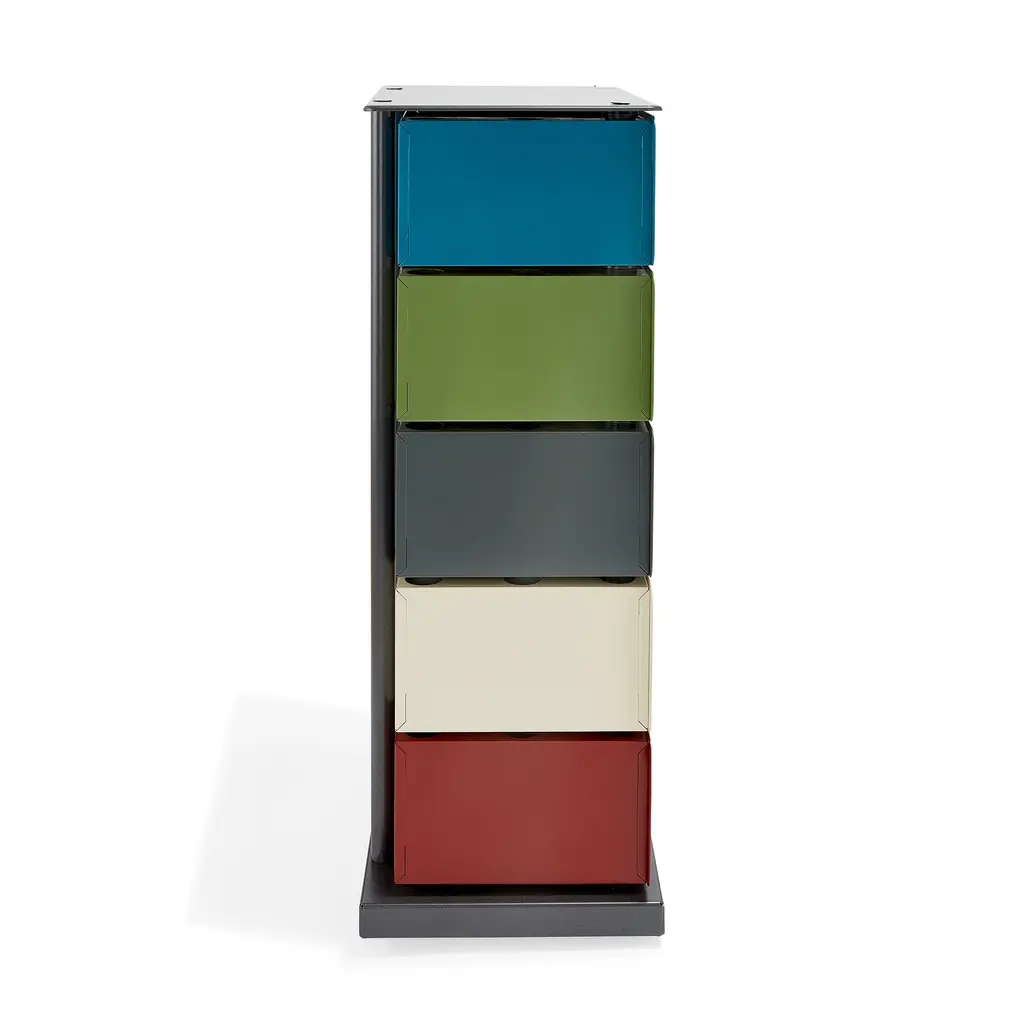 MoMA Exclusive: A beautiful, space-saving solution to your storage needs, the five drawers of this multicolor cabinet pivot out completely, fully exposing the items within it. Made in Italy of powder-coated steel, the 5-Drawer Pivot Cabinet can be used to store and organize many types of household items: notebooks, toys, makeup, electronics, office supplies, files, tax records and other important documents, art supplies and more. Measuring 28.5h x 15w x 10.5”d, with a 4.5h x 11.8w x 8.7"d interior, the Pivot Cabinet can also be used as a bedside table. Weighs 28.6 lbs.