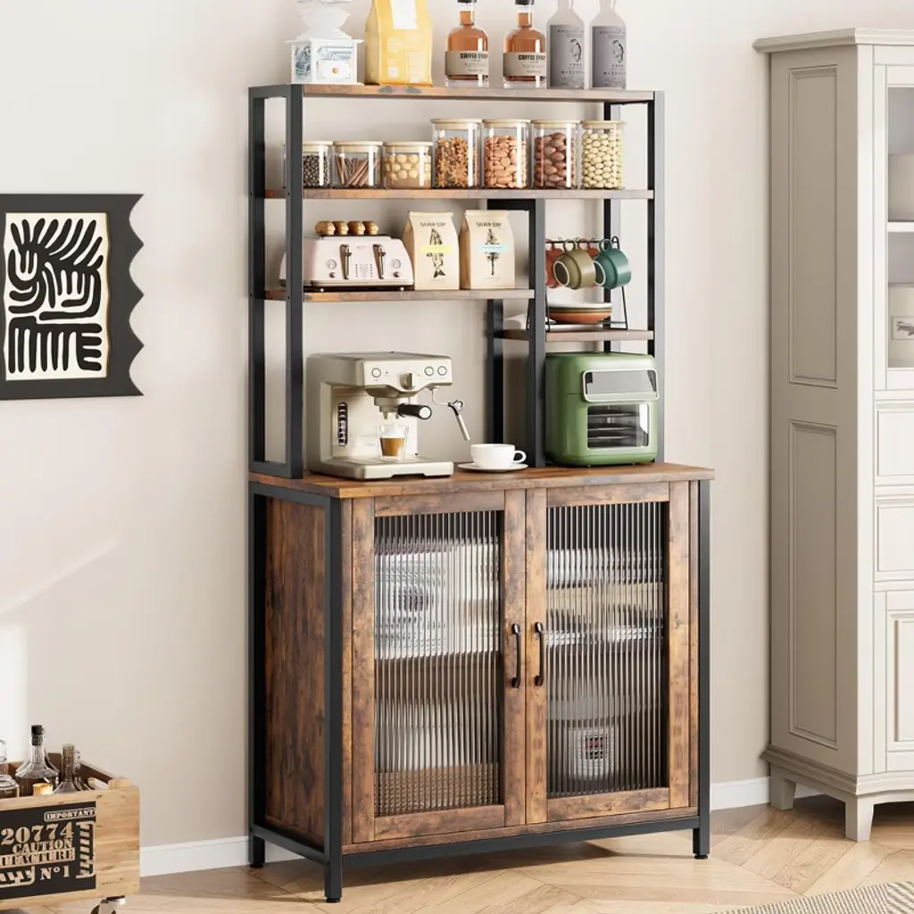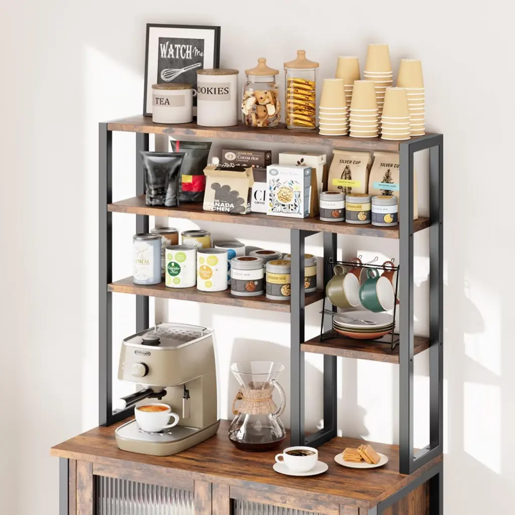 This five-tier kitchen storage rack features a metal frame and MDF panels, offering sturdy support with a weight capacity of 150 pounds. It securely holds appliances like microwaves and coffee makers. Equipped with open shelves, mesh compartments, and hooks, it effortlessly organizes cutlery, spices, and glassware. Serves dual purposes as both a microwave stand and coffee bar. Its water-resistant surface wipes clean easily. Adjustable feet ensure stability, and simple assembly saves kitchen space while maintaining tidiness.