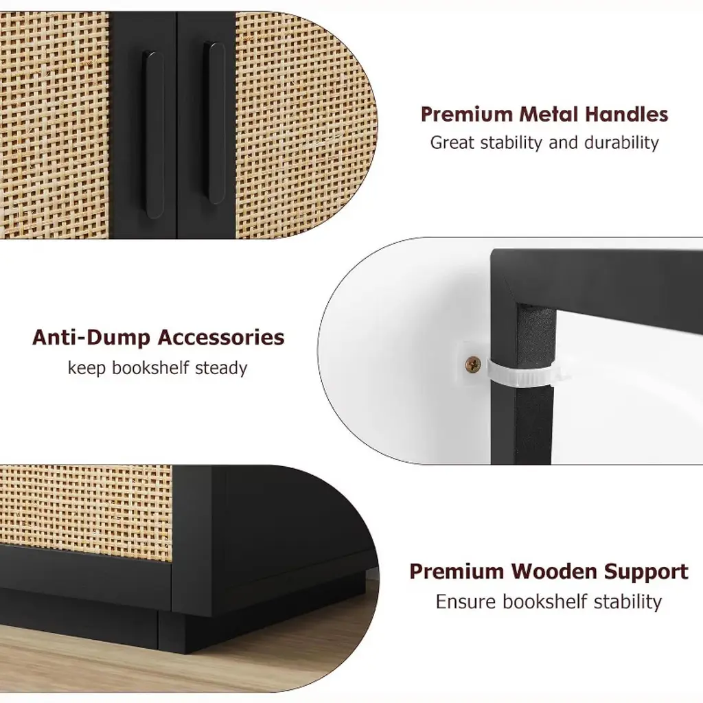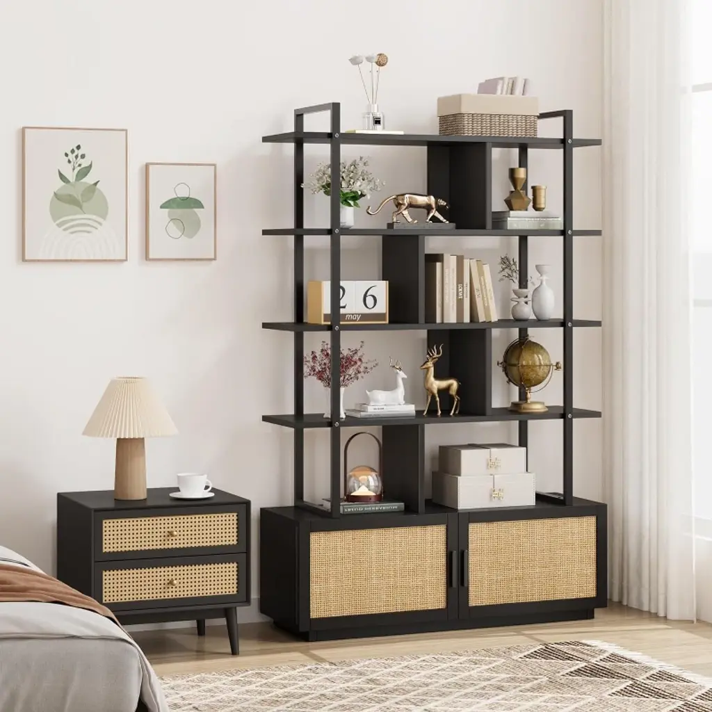 5 Tier Rattan Bookshelf With Storage Cabinet & Door, 71.1 Inch Tall Industrial Book Shelf With Open Display Shelves With Metal Frame