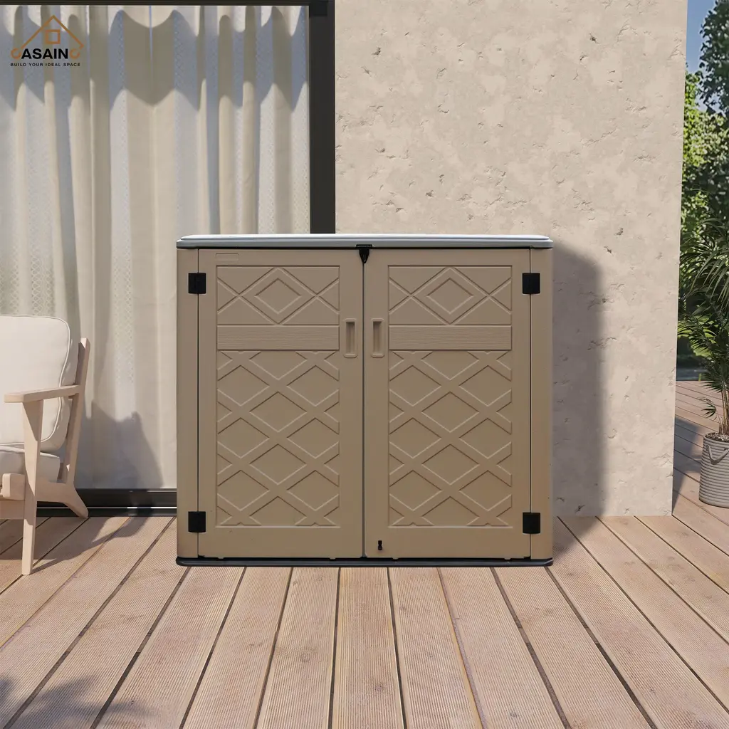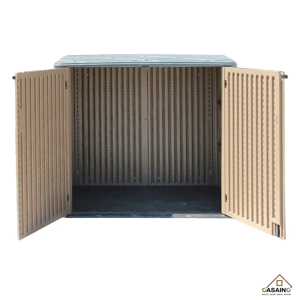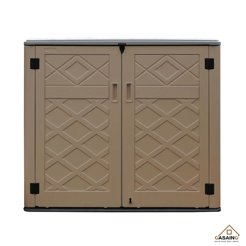 Details:CASAINC Storage Cabinet with all the stylish details of modern outdoor furniture. Extra-large storage space inside holds seat cushions, garden supplies or grilling accessories. Weather-resistant material protects your things from Sun, rain and snow. Lockable for extra security (lock not included).Full-length double doors. Features: