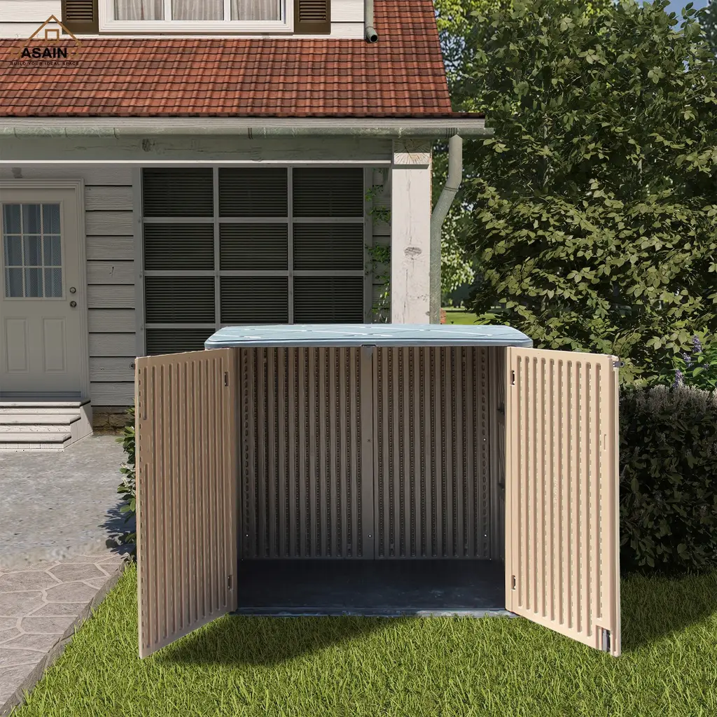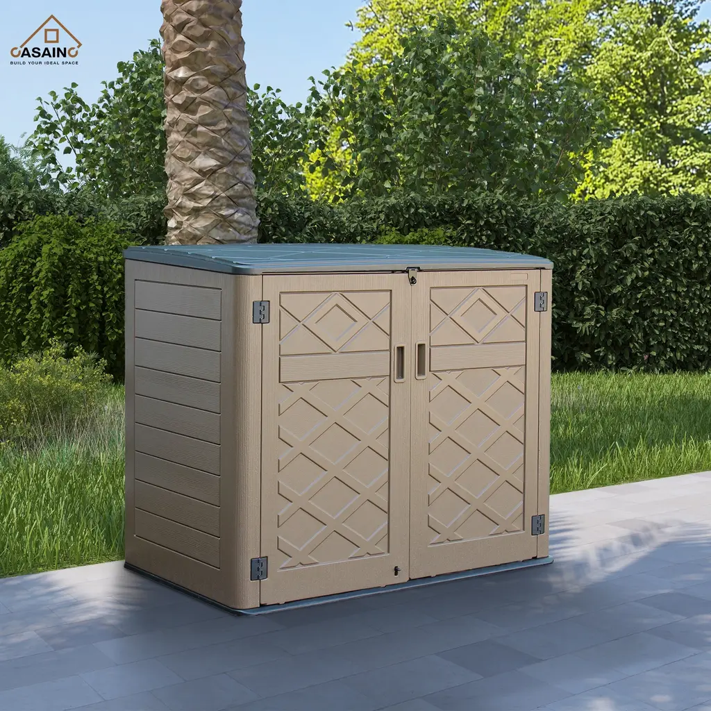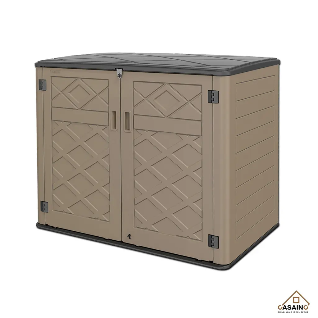 Details:CASAINC Storage Cabinet with all the stylish details of modern outdoor furniture. Extra-large storage space inside holds seat cushions, garden supplies or grilling accessories. Weather-resistant material protects your things from Sun, rain and snow. Lockable for extra security (lock not included).Full-length double doors. Features:
