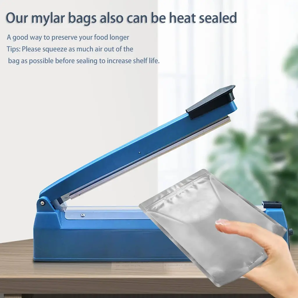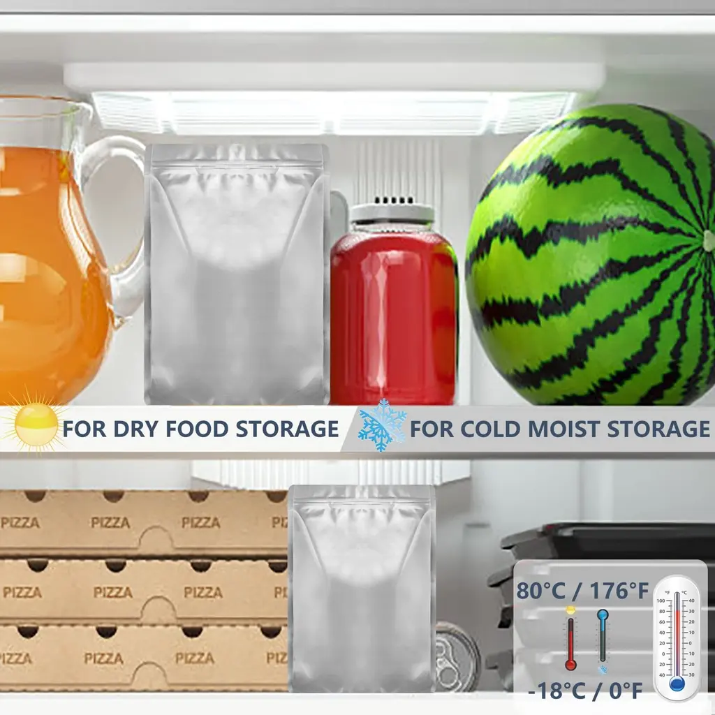 Our mylar bags are made of food-grade material that is safe, eco-friendly, durable, and tasteless. There are three layers to these bags: PET, aluminum foil, and PE. Our mylar bags can protect your food from air, moisture, and pests while retaining its flavor and nutritional value. The zipper design allows for repeated use, which is useful for frequently consumed foods. Long-term food storage requires the use of a hot iron or a heat-sealing machine. The standing type allows for easier cabinet storage.Features: