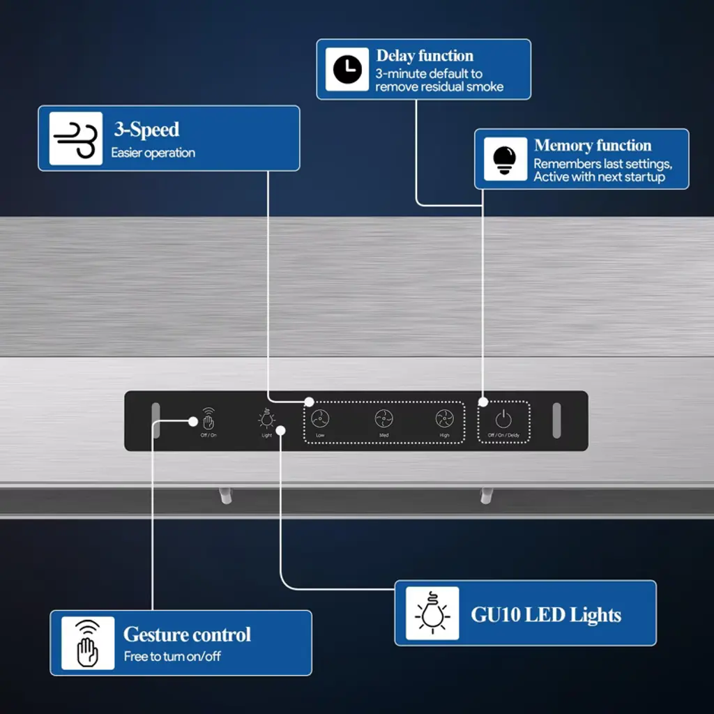 Transform your kitchen with this high-efficiency range hood, engineered to deliver powerful suction, quiet operation, and easy-to-use features for an enhanced cooking experience. Built to capture smoke, grease, and odors, it helps maintain a fresh and clean kitchen environment while improving your cooking atmosphere. Whether you're searing, simmering, or boiling, this range hood ensures your kitchen stays comfortable and free from unwanted odors.