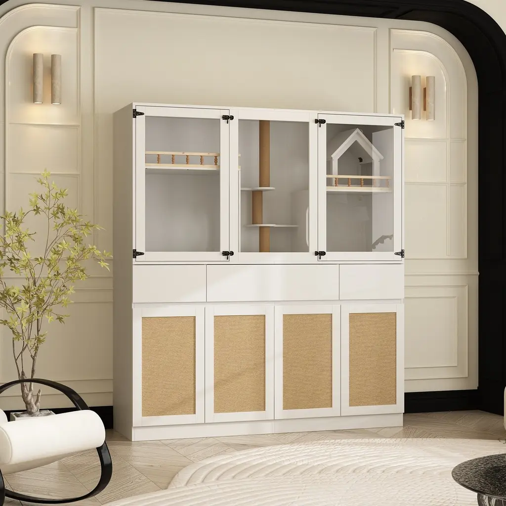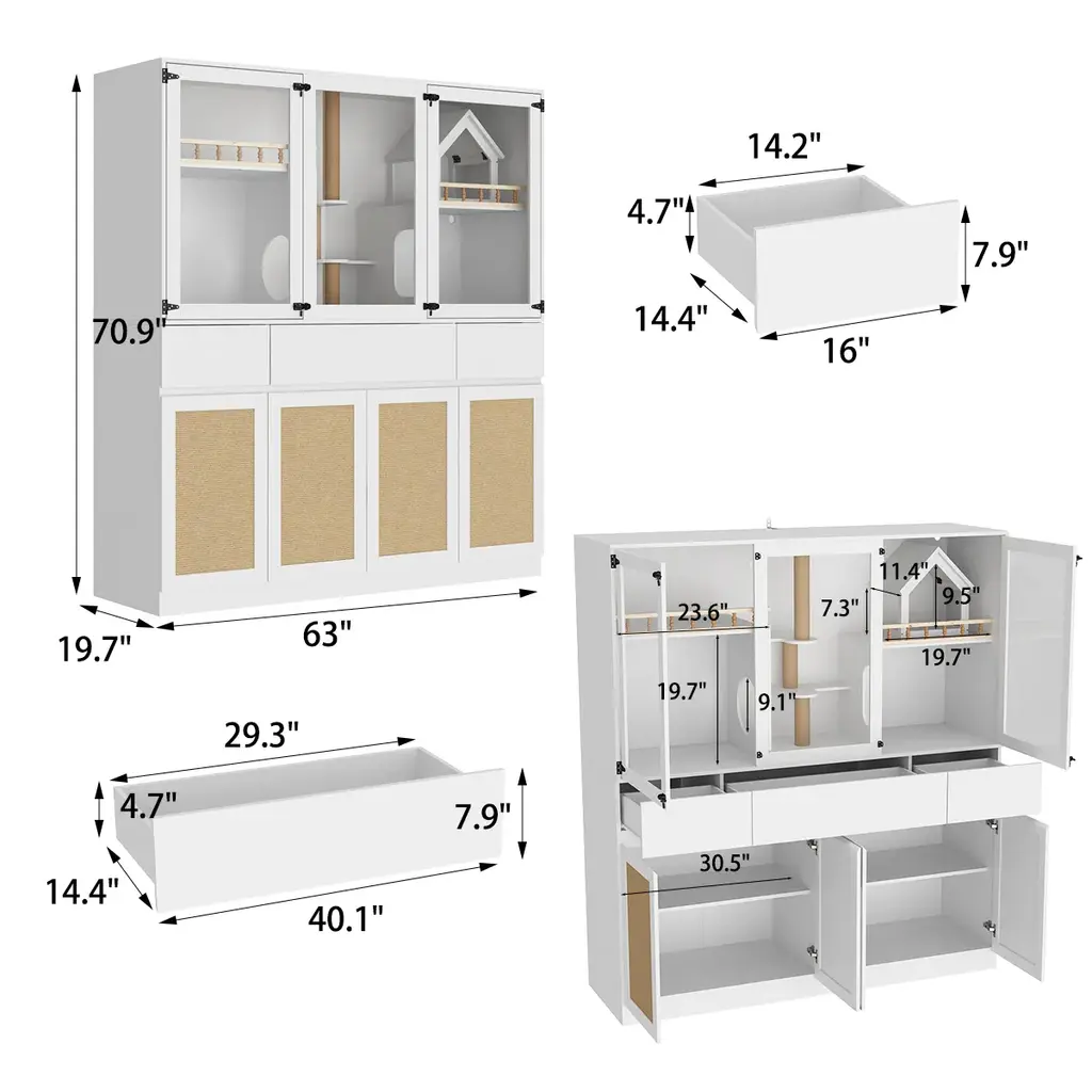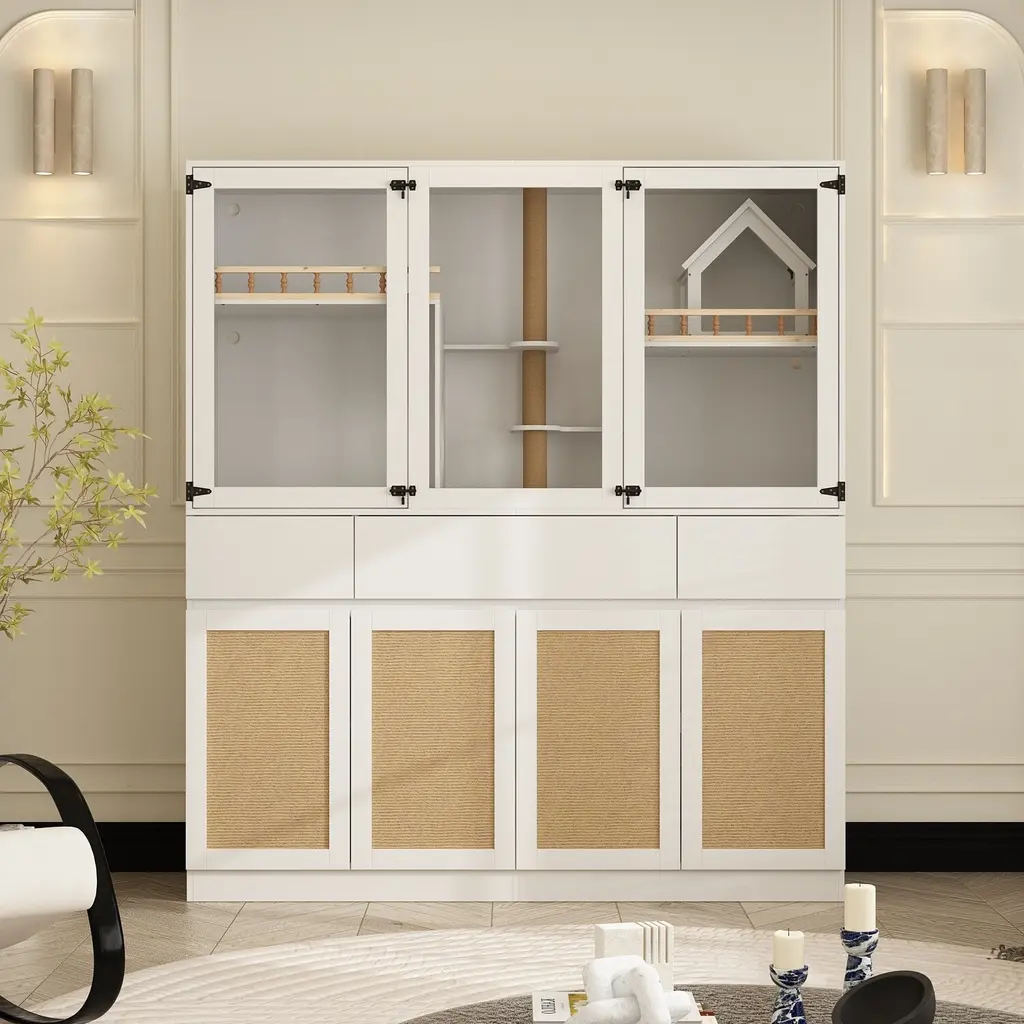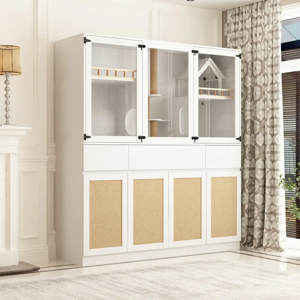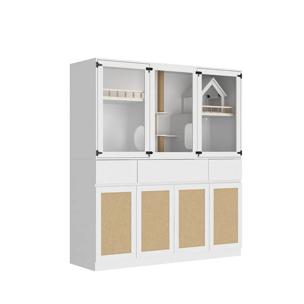 Title: Modern Pet Display Cabinet with Ample Storage, 63" WideDescription: Enhance your home's functionality and style with this Modern Pet Display Cabinet. With a sleek design and versatile storage options, this 63-inch wide cabinet is perfect for pet lovers and home organizers alike. The upper glass doors showcase your pet's favorite items or decorative pieces, while the lower cabinets offer ample space for storing pet supplies, toys, or household essentials. The combination of a white finish with natural woven accents creates a contemporary and elegant look that seamlessly fits into any room decor. Built for durability and easy assembly, this cabinet is a practical and stylish solution for modern homes.Features:Ample Storage Space: Three upper glass doors and four lower cabinets provide extensive storage for pet supplies and household items.Adjustable Shelving: Customizable shelves in the upper section allow for flexible display and storage options.Elegant Design: A sleek white finish paired with natural woven accents complements any interior style.Durable Construction: Made from high-quality materials for long-lasting use and stability.Easy Assembly: Designed for quick and straightforward assembly with all necessary hardware included.