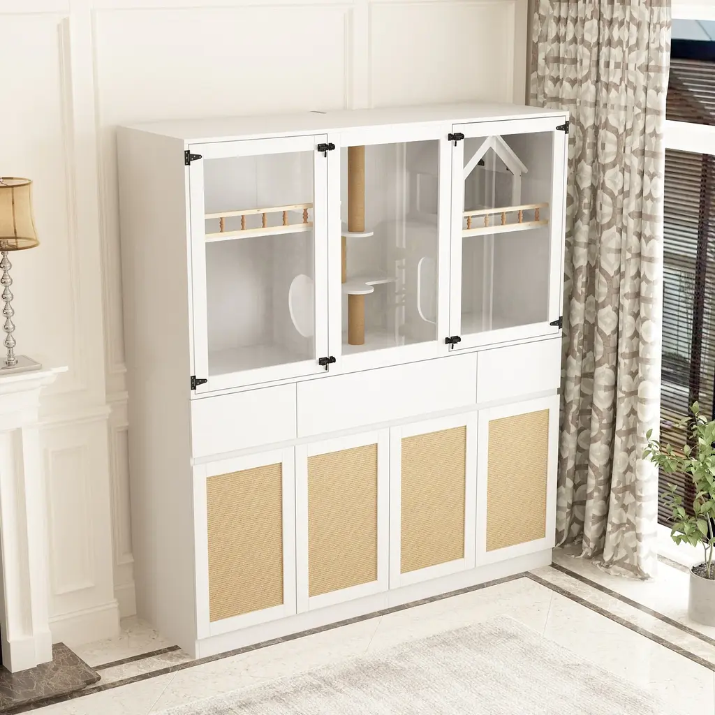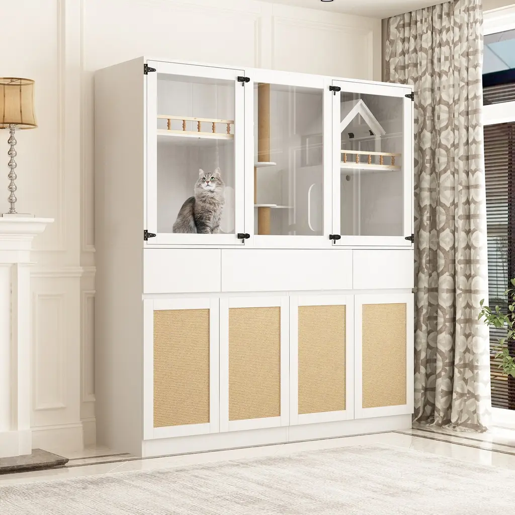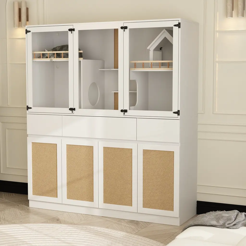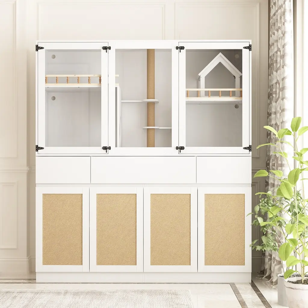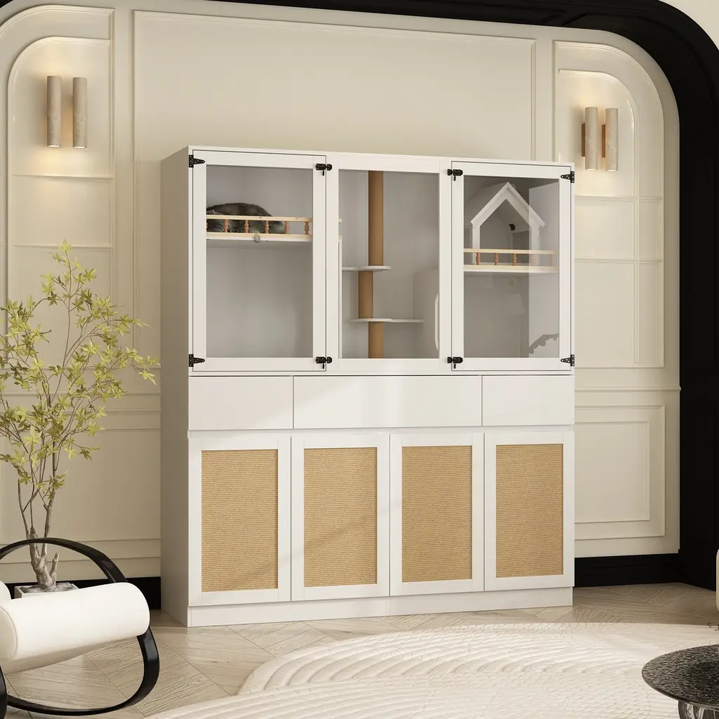 Title: Modern Pet Display Cabinet with Ample Storage, 63" WideDescription: Enhance your home's functionality and style with this Modern Pet Display Cabinet. With a sleek design and versatile storage options, this 63-inch wide cabinet is perfect for pet lovers and home organizers alike. The upper glass doors showcase your pet's favorite items or decorative pieces, while the lower cabinets offer ample space for storing pet supplies, toys, or household essentials. The combination of a white finish with natural woven accents creates a contemporary and elegant look that seamlessly fits into any room decor. Built for durability and easy assembly, this cabinet is a practical and stylish solution for modern homes.Features:Ample Storage Space: Three upper glass doors and four lower cabinets provide extensive storage for pet supplies and household items.Adjustable Shelving: Customizable shelves in the upper section allow for flexible display and storage options.Elegant Design: A sleek white finish paired with natural woven accents complements any interior style.Durable Construction: Made from high-quality materials for long-lasting use and stability.Easy Assembly: Designed for quick and straightforward assembly with all necessary hardware included.