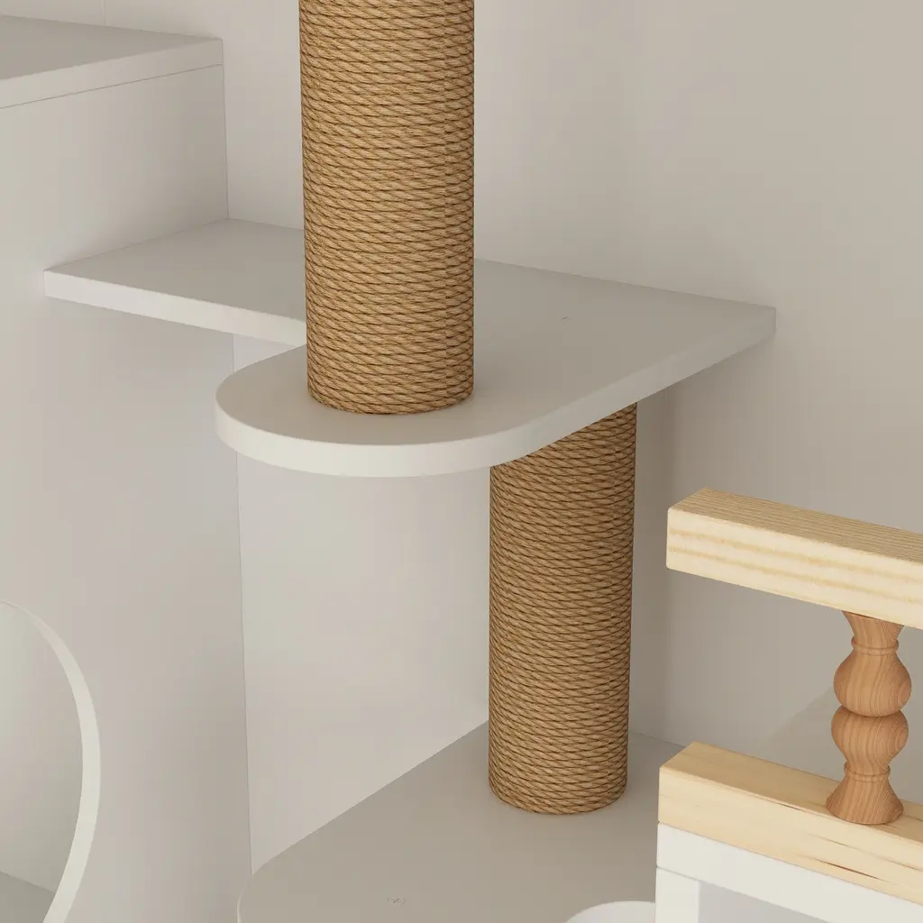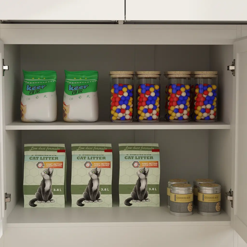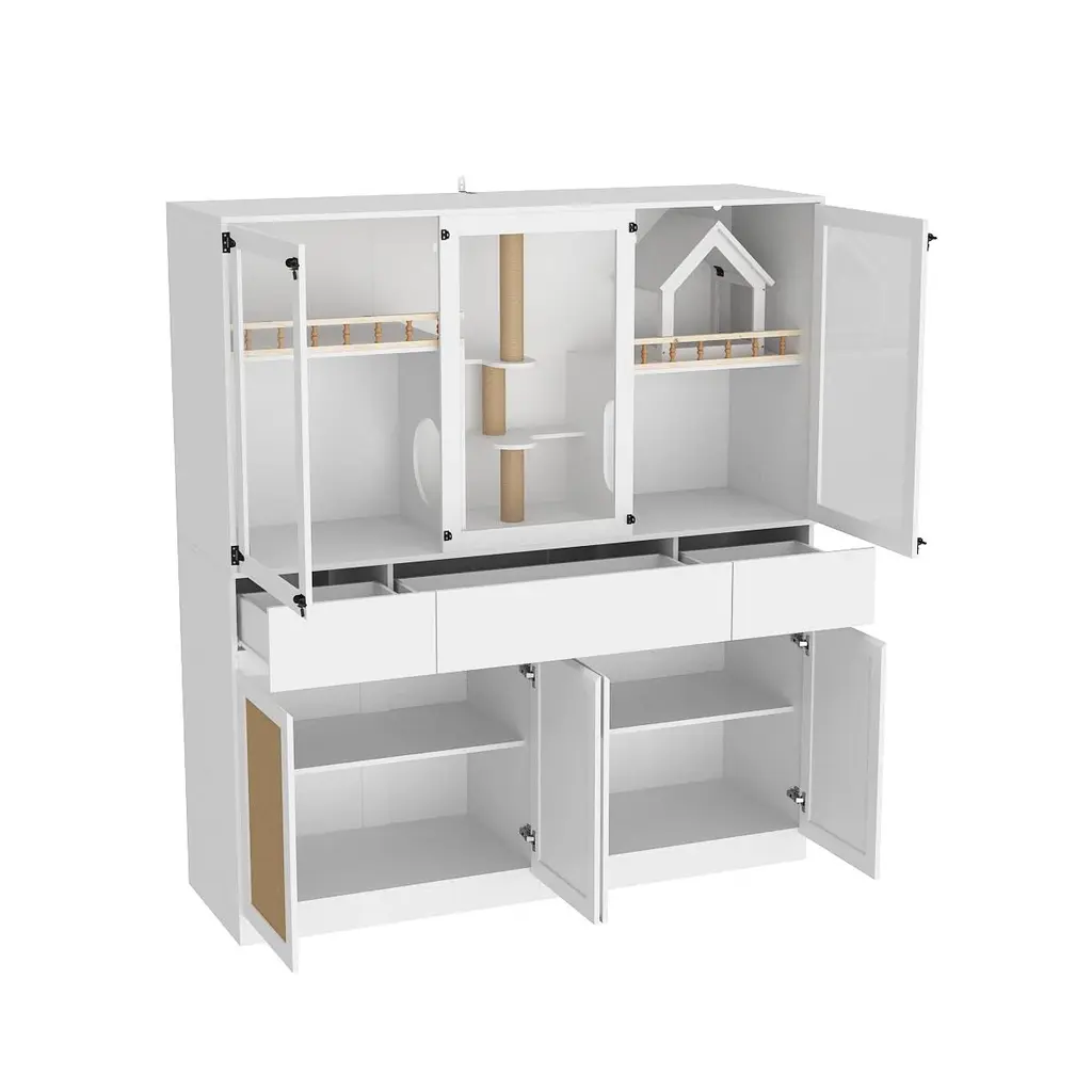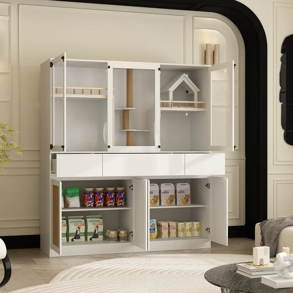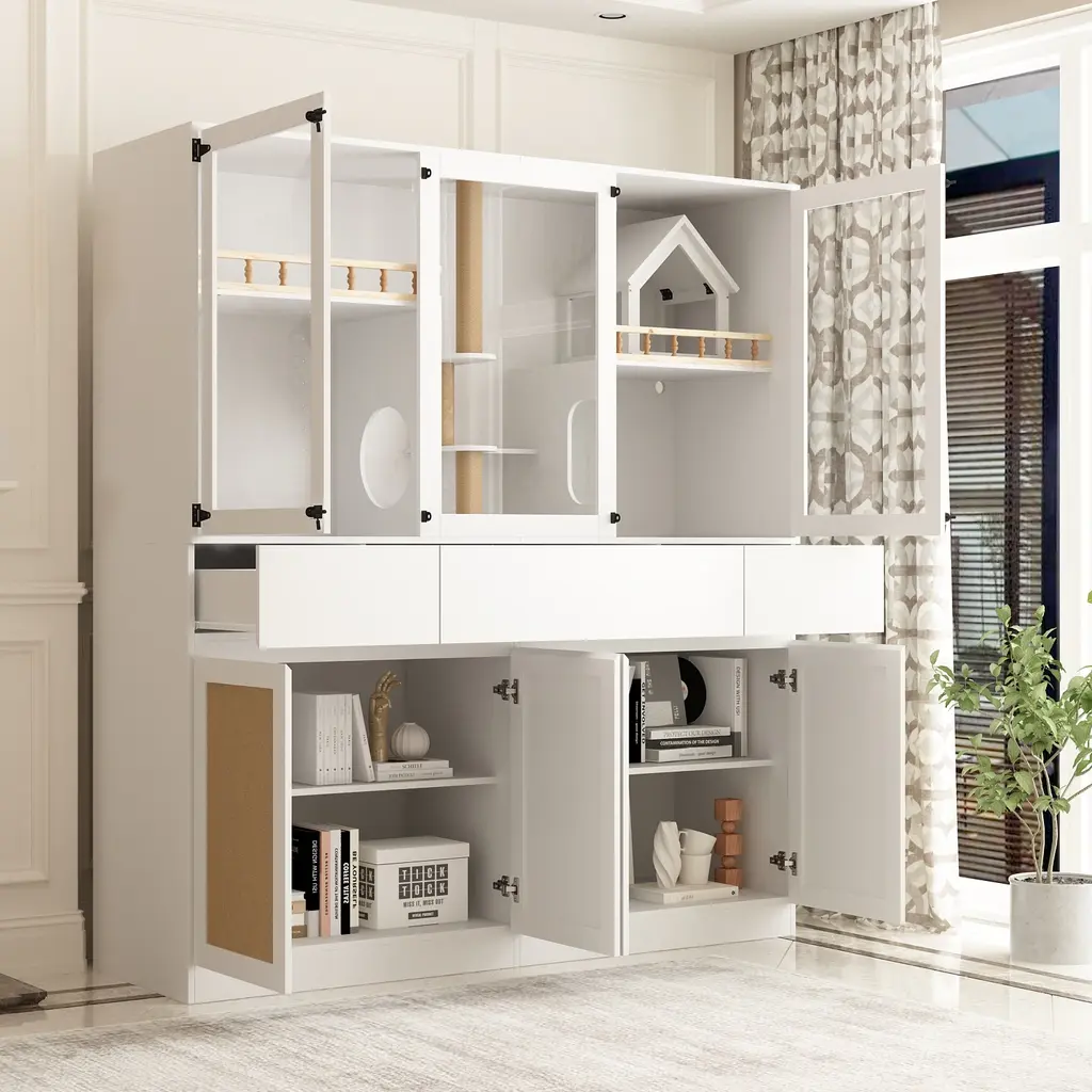 Title: Modern Pet Display Cabinet with Ample Storage, 63" WideDescription: Enhance your home's functionality and style with this Modern Pet Display Cabinet. With a sleek design and versatile storage options, this 63-inch wide cabinet is perfect for pet lovers and home organizers alike. The upper glass doors showcase your pet's favorite items or decorative pieces, while the lower cabinets offer ample space for storing pet supplies, toys, or household essentials. The combination of a white finish with natural woven accents creates a contemporary and elegant look that seamlessly fits into any room decor. Built for durability and easy assembly, this cabinet is a practical and stylish solution for modern homes.Features:Ample Storage Space: Three upper glass doors and four lower cabinets provide extensive storage for pet supplies and household items.Adjustable Shelving: Customizable shelves in the upper section allow for flexible display and storage options.Elegant Design: A sleek white finish paired with natural woven accents complements any interior style.Durable Construction: Made from high-quality materials for long-lasting use and stability.Easy Assembly: Designed for quick and straightforward assembly with all necessary hardware included.