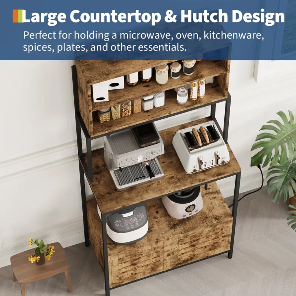 Upgrade Your Kitchen Storage with the 6-Tier Bakers Rack & Charging Station! Keep your kitchen organized while adding a touch of rustic charm with this 6-tier industrial bakers rack. Designed for both function and style, it features a mix of open shelves and cabinets to store microwaves, pots, pans, spices, dishes, and more. The built-in power outlet (2 AC ports + 1.5m cord) lets you charge devices or plug in appliances while cooking, saving you time and counter space. Crafted from premium MDF and a robust metal frame, this freestanding shelf is sturdy enough to hold heavy kitchen essentials while resisting wear and tear. The warm brown finish blends seamlessly with farmhouse, modern, or industrial decor, making it a versatile addition to any room—use it in the kitchen, living room, bathroom, or as a coffee bar. Easy to assemble with step-by-step instructions, this rack helps you maximize storage without sacrificing style—perfect for home cooks and organizing enthusiasts!