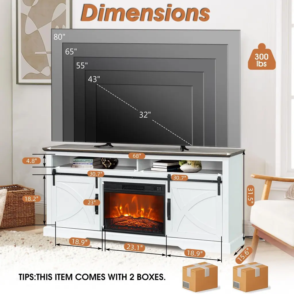 Transform your home into an evergreen spring paradise with this charming 68" Farmhouse Fireplace TV Stand. Not only does this TV stand double as a multi-functional media console, but it also injects country charm into your living space. Moreover, it offers ample storage with two cabinets and two open areas, providing a convenient solution for stowing away miscellaneous items. You can therefore easily organize CDs, DVDs, game consoles, and decorative items. Made of sturdy and durable wood, this TV stand is not only practical but also aesthetically pleasing. It is available in three elegant colors: white, brown, and gray. Hence, you have a variety of options to suit your decor.