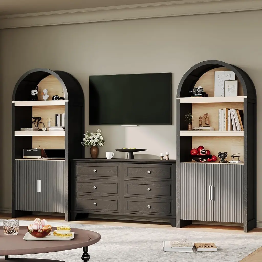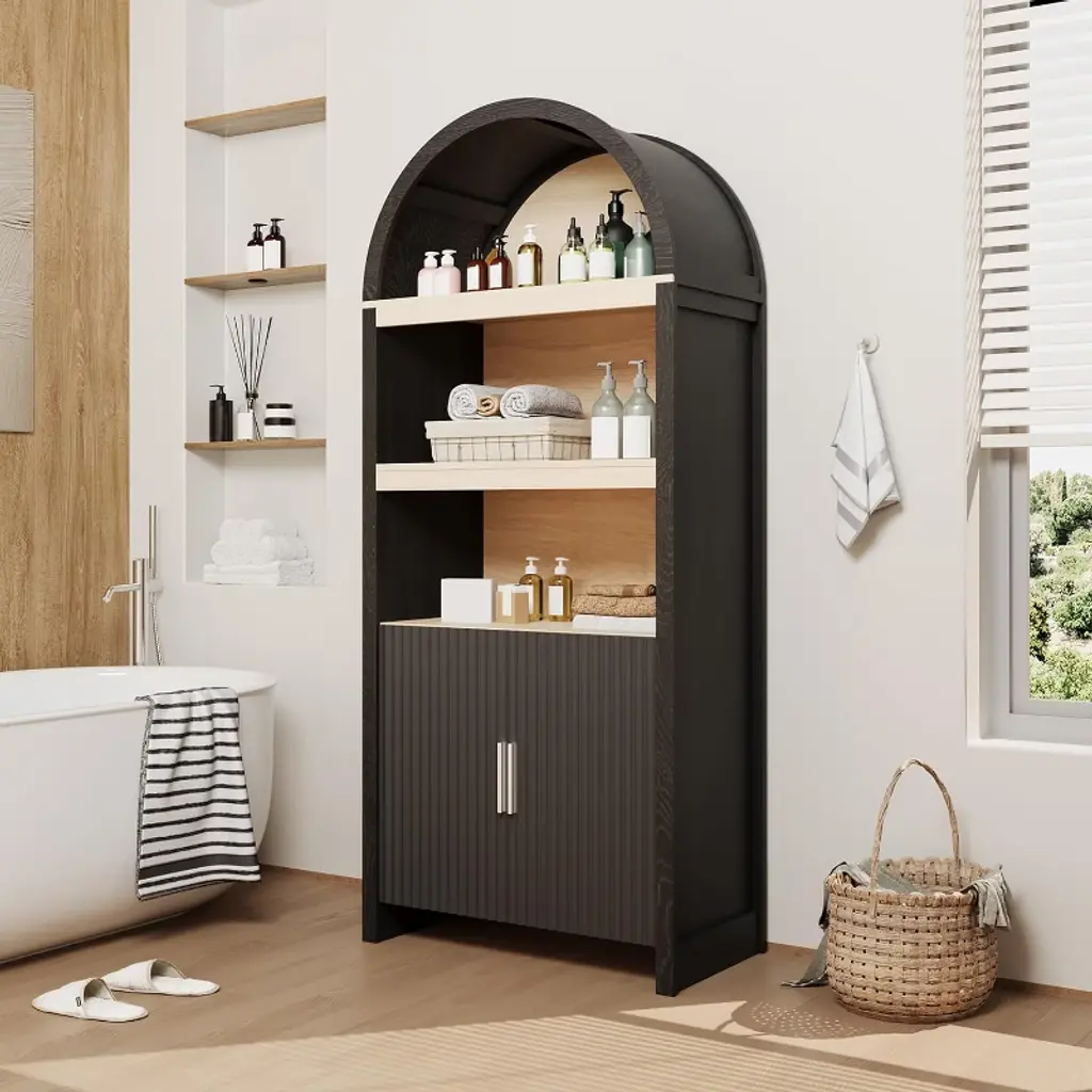 Feature:This 71" arched storage cabinet combines mid-century style with practical functionality. With five tiers, adjustable shelves, and open display areas, it keeps books, décor, kitchen items, or pantry essentials organized. The stylish arched design and mid-century doors add a sophisticated touch to any space. Crafted with durable materials, this cabinet ensures stability and long-lasting use, making it ideal for offices, dining rooms, kitchens, or living rooms.Package Included:1 × 71" Arched Storage Cabinet with 5 Tiers and Mid-Century Doors